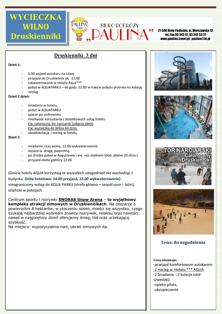 WYCIECZKA WYCIECZKA DO WILNO PARYŻA Druskienniki 6 dni Druskienniki 3 dni Dzień 1: - 6.00 wyjazd autokaru na Litwę - przyjazd do Druskiennik ok. 13.00 - zakwaterowanie w Hotelu Aqua*** - pobyt w AQUAPARKU – do godz. 22.00 w trakcie pobytu przerwa na kolację - nocleg Dzień 2 dzień: - śniadania w hotelu, pobyt w AQUAPARKU spacer po uzdrowisku możliwość korzystania z dodatkowych usług hotelu Ew. całoroczny tor narciarski (zdjęcia obok) Ew. wycieczka do Wilna 60 zł/os. obiadokolacja i nocleg w hotelu, - śniadanie, czas wolny, 12.00 wykwaterowanie wyjazd w drogę powrotną, po drodze pobyt w Augustowie i ew. rejs statkiem (dod. płatne 20 zł/os.) przyjazd około godziny 22.00 - Dzień 3 (Goście hotelu AQUA korzystają ze wszystkich udogodnień nie wychodząc z budynku. Doba hotelowa: 14.00 przyjazd, 12.00 wykwaterowanie) nieograniczony wstęp do AQUA PARKU (strefa główna + zespół saun i łaźni), szlafroki w pokojach Centrum sportu i rozrywki SNORAS Snow Arena – to wyjątkowy kompleks atrakcji zimowych w Druskiennikach. Na obszarze o powierzchni 8 hektarów, w otoczeniu sosen, mieści się wszystko, czego szukają najbardziej wybredni znawcy rozrywek, relaksu oraz nowości: nawet w najgorętszy dzień oferujemy śnieg, lód oraz urzekającą szybkość. Na miejscu: wypożyczalnia nart, ubrań zimowych itp. Cena: do uzgodnienia Cena obejmuje: -przejazd komfortowym autokarem -2 nocleg w Hotelu *** AQUA -2 Śniadanie i 2 kolacje (stół szwedzki) -opieka pilota, -ubezpieczenie