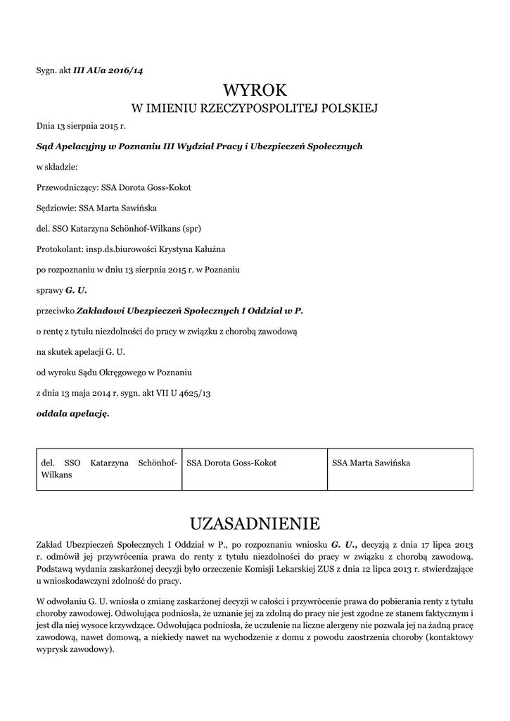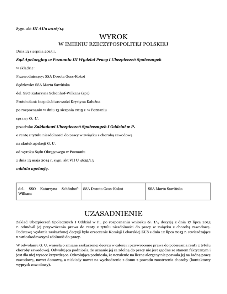 Sygn. akt III AUa 2016/14 WYROK W IMIENIU RZECZYPOSPOLITEJ POLSKIEJ Dnia 13 sierpnia 2015 r. Sąd Apelacyjny w Poznaniu III Wydział Pracy i Ubezpieczeń Społecznych w składzie: Przewodniczący: SSA Dorota Goss-Kokot Sędziowie: SSA Marta Sawińska del. SSO Katarzyna Schönhof-Wilkans (spr) Protokolant: insp.ds.biurowości Krystyna Kałużna po rozpoznaniu w dniu 13 sierpnia 2015 r. w Poznaniu sprawy G. U. przeciwko Zakładowi Ubezpieczeń Społecznych I Oddział w P. o rentę z tytułu niezdolności do pracy w związku z chorobą zawodową na skutek apelacji G. U. od wyroku Sądu Okręgowego w Poznaniu z dnia 13 maja 2014 r. sygn. akt VII U 4625/13 oddala apelację. del. SSO Wilkans Katarzyna Schönhof- SSA Dorota Goss-Kokot SSA Marta Sawińska UZASADNIENIE Zakład Ubezpieczeń Społecznych I Oddział w P., po rozpoznaniu wniosku G. U., decyzją z dnia 17 lipca 2013 r. odmówił jej przywrócenia prawa do renty z tytułu niezdolności do pracy w związku z chorobą zawodową. Podstawą wydania zaskarżonej decyzji było orzeczenie Komisji Lekarskiej ZUS z dnia 12 lipca 2013 r. stwierdzające u wnioskodawczyni zdolność do pracy. W odwołaniu G. U. wniosła o zmianę zaskarżonej decyzji w całości i przywrócenie prawa do pobierania renty z tytułu choroby zawodowej. Odwołująca podniosła, że uznanie jej za zdolną do pracy nie jest zgodne ze stanem faktycznym i jest dla niej wysoce krzywdzące. Odwołująca podniosła, że uczulenie na liczne alergeny nie pozwala jej na żadną pracę zawodową, nawet domową, a niekiedy nawet na wychodzenie z domu z powodu zaostrzenia choroby (kontaktowy wyprysk zawodowy). Pozwany Zakład Ubezpieczeń Społecznych, I Oddział w P., wniósł o oddalenie odwołania. W odpowiedzi na odwołanie podtrzymał swe stanowisko zawarte w zaskarżonej decyzji. Wyrokiem z 13 maja 2014 r. wydanym w sprawie VII U 4625/13 Sąd Okręgowy w Poznaniu oddalił odwołanie G. U.. Powyższe rozstrzygnięcie zostało wydane w oparciu o następujące ustalenia faktyczne i rozważania prawne: Odwołująca G. U. urodziła się (...) i z zawodu jest technikiem ekonomistą. Pracowała w Zakładach (...) w Z. na stanowisku pracownika umysłowego. Po powrocie z urlopu wychowawczego została zatrudniona, jako szwaczka. W ramach tych obowiązków zajmowała się prasowaniem drobnych elementów oraz klejeniem elementów odzieży. Decyzją z dnia 22 stycznia 1991 r. sygn. (...) (...) w W. stwierdził u G. U. chorobę zawodową: wyprysk kontaktowy zawodowy. Decyzją ZUS dnia 25 marca 1991 r. odwołującej przyznano od dnia 23 lutego 1991r. prawo do renty inwalidzkiej 3 grupy inwalidów w związku z chorobą zawodową. Przed wydaniem decyzji zakład pracy wypełnił formularz dotyczący charakteru pracy wnioskodawczyni. Z punktu 6 formularza wynika, że odwołująca wykonywała wówczas czynności niezgodne z posiadanymi kwalifikacjami. Następnie prawo do renty z tytułu częściowej niezdolności do pracy w związku z chorobą zawodową było odwołującej przyznawane okresowo do dnia 31 maja 2013r. W dniu 19 kwietnia 2013 r. odwołująca złożyła wniosek o ponowne ustalenie prawa do renty w związku z chorobą zawodową. Zaskarżoną decyzją z dnia 17 lipca 2013 r. pozwany odmówił jej przywrócenia świadczenia rentowego. Biegli lekarze sądowi - dr n. med. Ewa Neumann – dermatolog oraz dr Maciej Ratajczyk - pulmonolog, rozpoznali u odwołującej: astmę oskrzelową przewlekłą atopową, częściowo kontrolowaną i wyprysk alergiczny rąk o łagodnym przebiegu. W opinii biegłego pulmonologa brak jest podstaw do stwierdzenia istotnego naruszenia sprawności organizmu z powodu astmy oskrzelowej, stąd brak podstaw do uznania częściowej lub całkowitej niezdolności do pracy w tym w związku z chorobą zawodową. Odnosząc się do orzeczenia Lekarza Orzecznika ZUS z 9 maja 2011 r. biegły wskazał, że astma oskrzelowa nie była istotna orzeczniczo przy uznaniu częściowej niezdolności do pracy do dnia 31 maja 2013 r. Biegła dermatolog po szczegółowej analizie dokumentacji medycznej, danych z wywiadu oraz przeprowadzonym badaniu odwołującej stwierdziła miernie nasilone objawy kliniczne i łagodny przebieg choroby skóry, przez cały okres jej trwania oraz otrzymywania świadczeń rentowych z tytułu choroby zawodowej. Ponadto biegła wskazała, że ubezpieczona podaje, że mimo zaprzestania pracy zawodowej „skóra nigdy nie jest zdrowa”. Powyższe nie daje podstaw do stwierdzenia i orzeczenia niezdolności do pracy jakiegokolwiek stopnia, w tym z powodu zawodowej choroby skóry. Okres narażenia zawodowego był krótki, zmiany skórne miernie nasilone. Nadto nie zastosowano przekwalifikowania zawodowego młodej osoby, co z dużym prawdopodobieństwem sugeruje nadinterpretację w orzeczeniu w 30 roku życia świadczeń z powodu zawodowej choroby skóry. Ponadto odwołująca mogła i może w ocenie biegłej pracować w wyuczonym zawodzie ekonomisty. Stosowanie systematycznej profilaktyki skóry, odpowiednio dobranymi emolientami, unikanie szczególnego narażenia na znane alergeny rokuje poprawę i pełną sprawność zawodową. Podczas badania biegła dermatolog nie stwierdziła cech wyprysku przewlekłego - lichenifikacji skóry, jak również zmian rozsianych i zadrapań. W łącznej opinii biegłych nie stwierdzono u odwołującej schorzeń upośledzających wydolność organizmu w stopniu dającym podstawę do orzeczenia niezdolności do pracy, w tym w związku z choroba zawodową. Sąd przeprowadził także dowód z opinii biegłego dr n. med. Jacka Romankowa - specjalisty medycyny pracy, który podzielił opinię biegłych dermatologa i pulmologa. Biegły stwierdził, że nastąpiła poprawa stanu dermatologicznego, która polega na braku cech lichenizacji skóry, zmian rozsianych, cech wyprysku przewlekłego. Odwołująca wykazała pewną elastyczność zawodową. Nie ma podstaw do uznania niezdolności do pracy z tytułu choroby zawodowej u osoby z ś