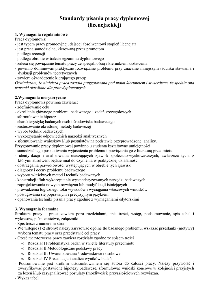 Standardy pisania pracy dyplomowej (licencjackiej) 1. Wymagania regulaminowe Praca dyplomowa: - jest typem pracy promocyjnej, dającej absolwentowi stopień licencjata - jest pracą samodzielną, kierowaną przez promotora - podlega recenzji - podlega obronie w trakcie egzaminu dyplomowego - zaleca się powiązanie tematu pracy ze specjalnością i kierunkiem kształcenia - powinno dominować praktyczne rozwiązanie problemu przy znacznie mniejszym ładunku stawiania i dyskusji problemów teoretycznych - zawiera oświadczenie kierującego pracą: Oświadczam, Ŝe niniejsza praca została przygotowana pod moim kierunkiem i stwierdzam, Ŝe spełnia ona warunki określone dla prac dyplomowych. 2.Wymagania merytoryczne Praca dyplomowa powinna zawierać: - zdefiniowanie celu - określenie głównego problemu badawczego i zadań szczegółowych - sformułowanie hipotez - charakterystykę badanych osób i środowiska badawczego - zastosowanie określonej metody badawczej - wybór technik badawczych - wykorzystanie odpowiednich narzędzi analitycznych - sformułowanie wniosków i/lub postulatów na podstawie przeprowadzonej analizy. Przygotowanie pracy dyplomowej powinno u studenta kształtować umiejętności: - samodzielnego poszukiwania wyjaśnienia problemu i powiązania go z literaturą przedmiotu - identyfikacji i analizowania otaczających zjawisk społeczno-wychowawczych, zwłaszcza tych, z którymi absolwent będzie miał do czynienia w praktycznej działalności - dostrzegania prawidłowości występujących w obrębie tych zjawisk - diagnozy i oceny problemu badawczego - wyboru właściwych metod i technik badawczych - konstrukcji i/lub wykorzystania wystandaryzowanych narzędzi badawczych - zaprojektowania nowych rozwiązań lub modyfikacji istniejących - prowadzenia logicznego toku wywodów i wyciągania właściwych wniosków - posługiwania się poprawnym i precyzyjnym językiem - opanowania techniki pisania pracy zgodnie z wymaganiami edytorskimi 3. Wymagania formalne Struktura pracy – praca zawiera poza rozdziałami, spis treści, wstęp, podsumowanie, spis tabel i wykresów, piśmiennictwo, załączniki - Spis treści z numerami stron - We wstępie (1-2 strony) naleŜy zarysować ogólne tło badanego problemu, wskazać przesłanki (motywy) wyboru tematu pracy oraz przedstawić cel pracy - Część merytoryczna pracy zawiera rozdziały zgodne ze spisem treści • Rozdział I Problematyka badań w świetle literatury przedmiotu • Rozdział II Metodologiczne podstawy pracy • Rozdział III Uwarunkowania środowiskowe i osobowe • Rozdział IV Prezentacja i analiza wyników badań - Podsumowanie jest krótkim ustosunkowaniem się autora do całości pracy. NaleŜy przywołać i zweryfikować postawione hipotezy badawcze, sformułować wnioski końcowe w kolejności przyjętych za łoŜeń i/lub zasygnalizować postulaty (moŜliwości) przyszłościowych rozwiązań. - Wykaz tabel - Wykaz rysunków (wykresów, schematów, map, itp.) - Piśmiennictwo – ponumerowany wykaz cytowanej literatury w alfabetycznej kolejności, zgodny z wymogami opisu bibliograficznego • wykaz wykorzystanych aktów prawnych (w uzasadnionych przypadkach) • wykaz źródeł internetowych (z datą publikacji) - Załączniki 4. Wymagania edytorskie Materiały pracy dyplomowej naleŜy przygotować z wykorzystaniem formatu arkusza papieru A4 (pisane jednostronnie) w edytorze tekstu Word dla Windows, z zastosowaniem następujących zasad: - Krój pisma: Times New Roman - Wielkość czcionki podstawowej: 12 pkt. - Odstęp między wierszami: 1,5 wiersza - Marginesy: górny – 2,5 cm, dolny – 2,5 cm, lewy – 3,5 cm, prawy – 1,5 cm - Tekst wyjustowany (wyrównanie tekstu do obu marginesów) - Akapit – wcięcie pierwszego wiersza: 0,5 cm - Numeracja ciągła wszystkich stron pracy - Oznaczenia i tytuły tabel powinny znaleźć się nad tekstem - Oznaczenia i podpisy rysunków wykresów naleŜy zamieścić pod tekstem - Przypisy znajdują się na dole kaŜdej strony 5. Piśmiennictwo: 1 . Piśmiennictwo powinno być umieszczone na końcu pracy (artykułu) . 2. Pozycje naleŜy umieszczać w kolejności alfabetycznej (met.Oxfordzka) od pierwszej litery nazwiska pierwszego autora artykułu czy teŜ ksiąŜki lub w kolejności cytowania. 3. W przypadku pracy indywidualnej podaje się nazwiska wszystkich autorów wraz z inicjałami imion ( w takiej kolejności jak autorzy podali w oryginale), rok wydania (w nawiasie), tytuł pracy (moŜe być kursywą ), nazwę firmy wydawniczej, w przypadku kolejnego wydania naleŜy podać numer wydania, miejsce wydania według. wzoru: Przykład: Dega W., Senger A. (1996), Ortopedia i rehabilitacja. T I, wyd. IV, PZWL Warszawa. 4. W przypadku pracy zbiorowej naleŜy umieścić tytuł pracy ( kursywą ), rok wydania w nawiasie, praca zbiorowa pod red. inicjały imion i nazwisko redaktora, ), nazwę firmy wydawniczej, w przypadku kolejnego wydania naleŜy podać numer wydania, miejsce wydania Przykład: Podstawy organizacji i zarządzania (2001), praca zbiorowa pod redakcją M. Romanowskiej, Difin, Warszawa. 5. W przypadku artykułu naleŜy podać Nazwisko i inicjały imion autora, rok wydania (w nawiasie) tytuł artykułu (kropka) nazwę czasopisma, numer czasopisma, strony (5-10) Przykład: Kowalski I.M., Protasiewicz H.(1997): Wydolność krąŜeniowo-oddechowa i sprawność fizyczna w idiopatycznych skrzywieniach kręgosłupa. Postępy rehabilitacji,1,65-67. Uwagi dodatkowe: - Stronę tytułową naleŜy wykonać wg wzoru wskazanego przez Uczelnię - NaleŜy korzystać z najnowszej literatury przedmiotu (unikamy starych wydań, chyba Ŝe praca ma charakter historyczny) - Dedykacja moŜe znajdować się tylko w egzemplarzu pracy przeznaczonym dla studenta - Nie zostawiać pustych stron 5. Na ostatniej stronie pracy naleŜy napisać oświadczenie kierującego pracą oraz oświadczenie autora Oświadczenie kierującego pracą: Oświadczam, Ŝe niniejsza praca została prz