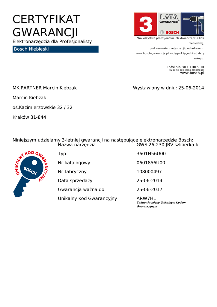 CERTYFIKAT GWARANCJI Elektronarzędzia dla Profesjonalisty Bosch Niebieski *Na wszystkie profesjonalne elektronarzędzia linii niebieskiej, pod warunkiem rejestracji pod adresem www.bosch-gwarancja.pl w ciągu 4 tygodni od daty zakupu. Infolinia 801 100 900 (w cenie połączenia lokalnego) www.bosch.pl MK PARTNER Marcin Kiebzak Wystawiony w dniu: 25-06-2014 Marcin Kiebzak oś.Kazimierzowskie 32 / 32 Kraków 31-844 Niniejszym udzielamy 3-letniej gwarancji na następujące elektronarzędzie Bosch: Nazwa narzędzia GWS 26-230 JBV szlifierka k Typ 3601H56U00 Nr katalogowy 0601856U00 Nr fabryczny 108000497 Data sprzedaży 25-06-2014 Gwarancja ważna do 25-06-2017 Unikalny Kod Gwarancyjny ARW7HL Zakup chroniony Unikalnym Kodem Gwarancyjnym