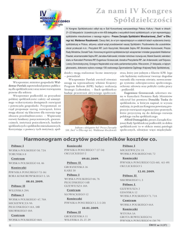 Za nami IV Kongres Spółdzielczości IV Kongres Spółdzielczości odbył się w Sali Koncertowej warszawskiego Pałacu Kultury i Nauki w dniach 21–22 listopada br. Uczestniczyło w nim 455 delegatów z wszystkich branż spółdzielczych, w tym reprezentujący spółdzielnie mieszkaniowe z naszego regionu - Prezes Zarządu Spółdzielni Mieszkaniowej „Świt” w Ełku mgr inż. Waldemar Roszkowski. Cieszy fakt, że w tym najważniejszym w ostatnich latach wydarzeniu branży spółdzielczej w Polsce, aktywny udział wziął przedstawiciel naszej Spółdzielni. Pozdrowienia dla uczestników obrad przekazali m.in.: Prezydent RP, Lech Kaczyński; Marszałek Sejmu RP, Bronisław Komorowski; Prezes Rady Ministrów, Donald Tusk. Honorowymi gośćmi spółdzielców byli: wicepremier i minister gospodarki Waldemar Pawlak; wicemarszałek Sejmu RP, Jarosław Kalinowski; minister rolnictwa i rozwoju wsi, Marek Sawicki; sekretarz stanu w Kancelarii Premiera RP, Eugeniusz Grzeszczak; doradca Prezydenta RP, Jan Ardanowski; szef Sojuszu Lewicy Demokratycznej, Grzegorz Napieralski oraz wielu parlamentarzystów. Wieczorem, 21 listopada, w tajnym głosowaniu, dokonano wyboru nowego 100 osobowego Zgromadzenia Ogólnego Krajowej Rady Spółdzielczej. Wicepremier, minister gospodarki Waldemar Pawlak zapowiedział pomoc publiczną dla spółdzielczości oraz nowe rozwiązania prawne dla sektora Wicepremier podkreślił, że przyszłość polskiej spółdzielczości zależy od umiejętnego wykorzystania dostępnych rozwiązań i potencjału gospodarki. Przypomniał, że rząd proponuje szereg rozwiązań, które mogą okazać się kluczowe dla rozwoju tego obszaru przedsiębiorczości. – Wspieramy rozwój funduszy poręczeniowych, gwarancyjnych, instytucji pożyczkowych, banków spółdzielczych i spółdzielni mieszkaniowych. Korzystając z pomocy tych instytucji, spół- dzielcy mogą realizować liczne inwestycje – powiedział. Wicepremier Pawlak zwrócił również uwagę na wprowadzany właśnie Krajowy Program Reform (KPR), będący realizacją Strategii Lizbońskiej. – Ruch spółdzielczy buduje przestrzeń aktywnego społeczeń- Jednym z delegatów był Prezes Zarządu SM „Świt” w Ełku mgr inż. Waldemar Roszkowski stwa, który jest jednym z filarów KPR. Jego cele będziemy realizować tworząc dogodne warunki dla rozwoju oświaty, nowoczesnego systemu zabezpieczenia społecznego, ochrony zdrowia oraz polityki rynku pracy - podkreślił. Eugeniusz Grzeszczak, sekretarz stanu w Kancelarii Premiera Rady Ministrów odczytał list premiera Donalda Tuska do spółdzielców, w którym napisał, iż wyraża nadzieję, że podczas Kongresu powstaną propozycje rozwiązań organizacyjno-prawnych, które przyczynią się do dalszego rozwoju polskiego ruchu spółdzielczego. Alfred Domagalski, prezes Zarządu Krajowej Rady Spółdzielczej podkreślił, że dobra spółdzielczość to w efekcie mniej patologii społecznych, silniejsze więzi międzyludz- Harmonogram odczytów podzielników kosztów co. Północ I Konieczki WOJSKA POLSKIEGO 50, 72A TORUŃSKA 8 Centrum WOJSKA POLSKIEGO 44, 46 Konieczki PIWNIKA PONUREGO 7(1-16) BORA KOMOROWSKIEGO 3, 3A Północ II 08.01.2009. WILEŃSKA 29A Północ I WOJSKA POLSKIEGO 67, 70A MICKIEWICZA 9A PIŁSUDSKIEGO 14A, 18B SIKORSKIEGO 10A Centrum WOJSKA POLSKIEGO 46A 6 Północ I PIWNIKA PONUREGO 7 (17-54) OKULICKIEGO 2 Północ II 09.01.2009. GRODZIEŃSKA 16 KAJKI 30 Północ I WOJSKA POLSKIEGO 66, 76 PIŁSUDSKIEGO 14B GIZEWIUSZA 10A Centrum SŁOWACKIEGO 12 Konieczki PIWNIKA PONUREGO 3, 5 (1-20) Północ II 10.01.2009. GRODZIEŃSKA 11 WILEŃSKA 25, 27, 29 MICKIEWICZA 1A WOJSKA POLSKIEGO 60, 72 Konieczki PIWNIKA PONUREGO 5(21-60), 6(1-49) OKULICKIEGO 5 Północ II 12.01.2009. SIKORSKIEGO 1, 3 Północ I GIZEWIUSZA 2 GDAŃSKA 12 WOJSKA POLSKIEGO 71, 71A Centrum WOJSKA POLSKIEGO 44A Konieczki WITOSA 5A GROTA ROWECKIEGO 6 PIWNIKA PONUREGO 6 (50-79) ŚWIT nr 3 (37)