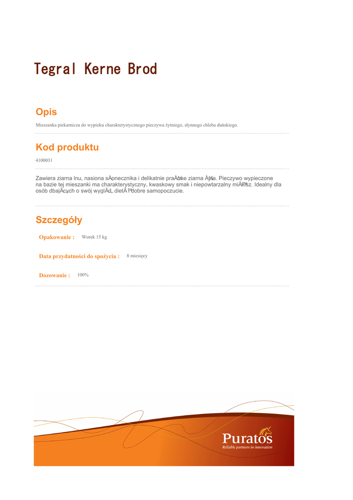 Tegral Kerne Brod Opis Mieszanka piekarnicza do wypieku charakterystycznego pieczywa żytniego, słynnego chleba duńskiego. Kod produktu 4100031 Zawiera ziarna lnu, nasiona sÅ‚onecznika i delikatnie praż one ziarna ż yta. Pieczywo wypieczone na bazie tej mieszanki ma charakterystyczny, kwaskowy smak i niepowtarzalny miÄ™ kisz. Idealny dla osób dbajÄ… cych o swój wyglÄ… d, dietÄ™ i dobre samopoczucie. Szczegóły Opakowanie : Worek 15 kg Data przydatności do spożycia : Dozowanie : 100% 8 miesięcy