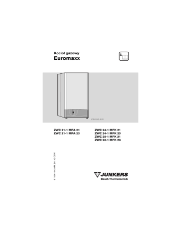 Kocioł gazowy Euromaxx 6 720 610 421- 00.1O 6 720 610 426 PL (01.10) OSW ZWC 21-1 MFA 21 ZWC 21-1 MFA 23 ZWC 24-1 MFK 21 ZWC 24-1 MFK 23 ZWC 28-1 MFK 21 ZWC 28-1 MFK 23 Spis treści Spis treści Wskazówki dotyczące bezpieczeństwa 3 Objaśnienie symboli 4 1 Elementy obsługi 5 2 2.1 2.2 2.3 2.4 2.5 2.6 2.7 2.8 2.9 Uruchomienie Przed uruchomieniem Włączenie/wyłączenie urządzenia Włączenie c.o. Regulacja c.o. Ustawienie temperatury c.w.u. Tryb pracy letniej (tylko c.w.u.) Ochrona przeciwmrozowa Usterki Czujnik ciągu kominowego w urządzeniach z podłączeniem do komina 12 3 Wskazówki dotyczące oszczędzania energii 13 4 Informacje ogólne 15 5 Krótka instrukcja obsługi 16 2 6 6 8 9 9 10 11 12 12 6 720 610 426 PL (01.10) Wskazówki dotyczące bezpieczeństwa Wskazówki dotyczące bezpieczeństwa Jeśli poczujesz zapach gazu: B Zamknij zawór gazu Poz. 172 (patrz str 5). B Otwórz okna. B Nie przełączaj żadnych przełączników elektrycznych. B Nie używaj otwartego ognia. B Natychmiast wezwij pogotowie gazowe. Jeśli poczujesz spaliny: B Wyłącz urządzenie. B Otwórz okna i drzwi. B Powiadom serwis. Montaż, przebudowa B Montaż i przebudowę może prowadzić tylko uprawniony zakład. B Nie zmieniać elementów odprowadzających spaliny. B W przypadku instalacji spalinowej zgodnie z B11: nie zamykać i nie zmniejszać otworów wentylacyjnych w drzwiach, oknach i ścianach. W przypadku montażu szczelnych okien zagwarantować dopływ powietrza do spalania. B Wszelkie przeróbki zaplombowanych elementów zabronione. Konserwacja B Zalecenie dla użytkownika: podpisać umowę na coroczną konserwację z uprawnionym serwisantem. B Użytkownik jest odpowiedzialny za bezpieczeństwo urządzenia i instalacji. B Stosować tylko oryginalne części zamienne! 6 720 610 426 PL (01.10) 3 Objaśnienie symboli Materiały wybuchowe i łatwopalne B Nie wolno składować ani używać w pobliżu urządzenia materiałów łatwopalnych (papier, rozpuszczalniki, farby, itp.). Powietrze do spalania (w pomieszczeniu) B Powietrze do spalania (w pomieszczeniu) powinno być wolne od agresywnych substancji (zawierające związki chloru i fluoru). Uniknie się w ten sposób korozji. Objaśnienie symboli Wskazówki dotyczące bezpieczeństwa będą oznaczone w tekście trójkątem ostrzegawczym i szarym polem. Słowa wytłuszczone oznaczają możliwe niebezpieczeństwo, jeśli nie będzie się przestrzegało odpowiednich zaleceń. • Uwaga oznacza, że mogą nastąpić lekkie uszkodzenia przedmiotów. • Ostrzeżenie oznacza, że może dojść do lekkiego uszkodzenia ciała, lub cięższych uszkodzeń przedmiotów. i Wskazówki w tekście będą oznaczone stojącym obok symbolem. Będą one ograniczone poziomymi liniami nad i pod tekstem. Wskazówki zawierają ważne informacje w przypadkach, gdy nie istnieje niebezpieczeństwo dla ludzi i sprzętu. 4 6 720 610 426 PL (01.10) Elementy obsługi 1 Elementy obsługi 27 367 363 317 366 365 61 310 8.1 ECO 136 364 295 135 38.2 170 171 173 170 15.1 172 6 720 610 423-01.1O 8.1 15.1 27 38.2 61 135 136 170 171 172 173 295 310 317 363 364 365 366 367 manometr rurka wypływowa odpowietrznik automatyczny dźwignia zaworu napełniającego przycisk resetujący wyłącznik główny regulator temperatury c.o. zawory odcinające c.o. wypływ c.w.u. zawór gazowy (zamknięty) zawór odcinający wody zimnej typ urządzenia - naklejka regulator temperatury c.w.u. wskaźnik wielofunkcyjny lampka kontrolna pracy palnika lampka kontrolna zasilania zał przycisk „kominiarz“ przycisk serwisowy przycisk uruchamiający funkcję ECO 6 720 610 426 PL (01.10) 5 Uruchomienie 2 Uruchomienie 2.1 Przed uruchomieniem Otworzyć zawór gazowy (172) B Wcisnąć pokrętło i przekręcić w lewo do oporu (pokrętło w kierunku przepływu = otwarte). Zawory odcinające c.o. (170) B Czworokątny trzpień zaworu przekręcić za pomocą klucza, aż nacięcie będzie skierowane w kierunku przepływu (patrz mały rysunek). Nacięcie prostopadle do kierunku przepływu = zamknięte. Zawór kątowy zimnej wody (173) B Czworokątny trzpień zaworu przekręcić za pomocą klucza, aż nacięcie będzie skierowane w kierunku przepływu (patrz mały rysunek). Nacięcie prostopadle do kierunku przepływu = zamknięte. 170 173 170 172 6 720 610 423-02.1 O 6 6 720 610 426 PL (01.10) Uruchomienie Skontrolować ciśnienie c.o. i Zespół do napełniania znajduje się pod urządzeniem pomiędzy podłączeniem zasilenia c.o. i podłączeniem c.w.u. (str. 5, Poz. 38) B Wskazówka manometru (8.1) powinna znajdować się pomiędzy 1 i 2 bar. B Jeśli wskazówka znajduje się poniżej 1 bar (przy zimnej instalacji), należy dopełnić wodę, aż wskazówka znajdzie się pomiędzy 1 i 2 bar. B Jeśli wymagane jest wyższe ciśnienie wstępne, poinformuje o tym instalator. B Max. ciśnienie 3 bary, przy najwyższej temperaturze c.o., nie powinno być przekroczone (otwiera się zawór bezpieczeństwa (15)). 8.1 38.2 6 720 610 423-03.1 O 6 720 610 426 PL (01.10) 7 Uruchomienie 2.2 Włączenie/wyłączenie urządzenia Włączenie B Włączyć urządzenie za pomocą wyłącznika głównego (I). Zaświeci się zielona lampka kontrolna, a na wyświetlaczu pojawi się wartość temperatury zasilania wody grzewczej. 6 720 610 333-04.1O i Po włączeniu kotła na wyświetlaczu pojawi się na ok. parametr P1 do P6. Wyłączenie B Wyłączyć urządzenie za pomocą wyłącznika głównego (0). Lampka kontrolna gaśnie. Zegar (jeśli jest podłączony) zatrzyma się po upływie rezerwy czasowej zasilania. 8 6 720 610 426 PL (01.10) Uruchomienie 2.3 Włączenie c.o. B Obracać regulator temperatury c.o. , aby dopasować temperaturę zasilania c.o. do instalacji c.o.: – Ustawienie minimalne 1 (ok. 50 ˚C) – Ustawienie dla niskotemperaturowej instalacji c.o.: pozycja E (ok. 75 ˚C) – Temperatura zasilania do 87 ˚C: pozycja max. Podczas pracy palnika świeci się czerwona lampka kontrolna. 6 720 610 333-05.1O 2.4 Regula