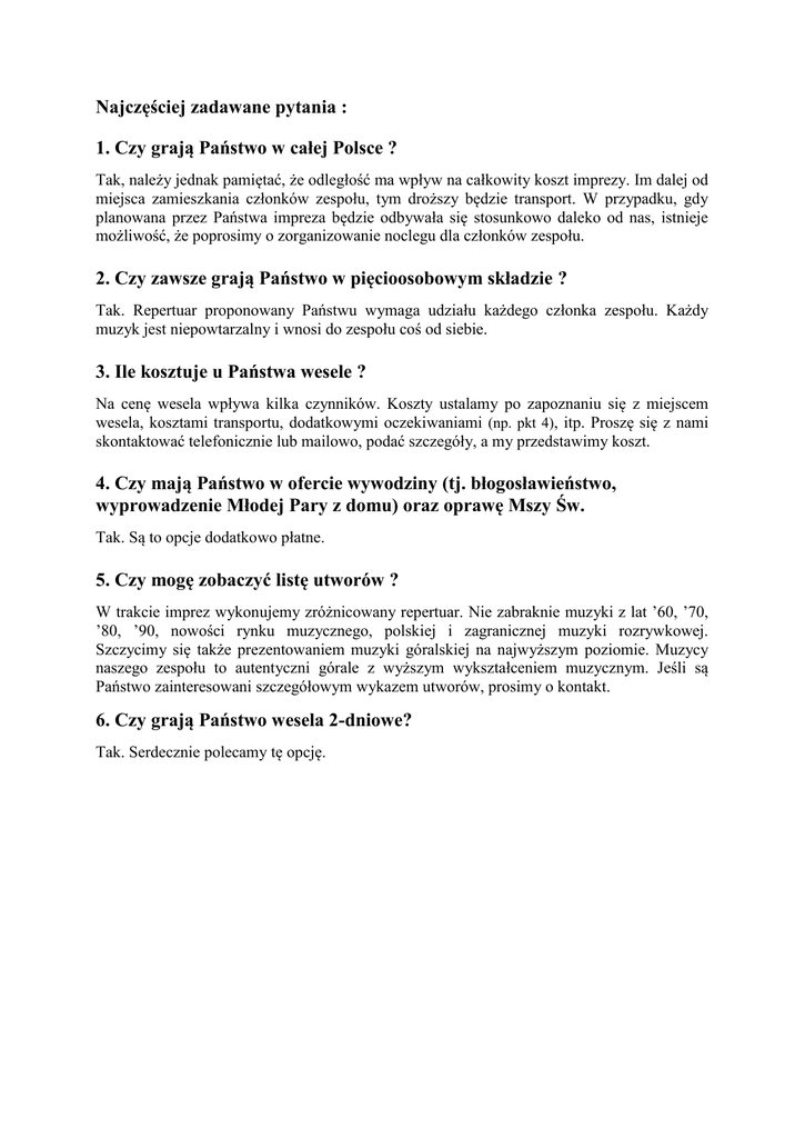 Najczęściej zadawane pytania : 1. Czy grają Państwo w całej Polsce ? Tak, należy jednak pamiętać, że odległość ma wpływ na całkowity koszt imprezy. Im dalej od miejsca zamieszkania członków zespołu, tym droższy będzie transport. W przypadku, gdy planowana przez Państwa impreza będzie odbywała się stosunkowo daleko od nas, istnieje możliwość, że poprosimy o zorganizowanie noclegu dla członków zespołu. 2. Czy zawsze grają Państwo w pięcioosobowym składzie ? Tak. Repertuar proponowany Państwu wymaga udziału każdego członka zespołu. Każdy muzyk jest niepowtarzalny i wnosi do zespołu coś od siebie. 3. Ile kosztuje u Państwa wesele ? Na cenę wesela wpływa kilka czynników. Koszty ustalamy po zapoznaniu się z miejscem wesela, kosztami transportu, dodatkowymi oczekiwaniami (np. pkt 4), itp. Proszę się z nami skontaktować telefonicznie lub mailowo, podać szczegóły, a my przedstawimy koszt. 4. Czy mają Państwo w ofercie wywodziny (tj. błogosławieństwo, wyprowadzenie Młodej Pary z domu) oraz oprawę Mszy Św. Tak. Są to opcje dodatkowo płatne. 5. Czy mogę zobaczyć listę utworów ? W trakcie imprez wykonujemy zróżnicowany repertuar. Nie zabraknie muzyki z lat ’60, ’70, ’80, ’90, nowości rynku muzycznego, polskiej i zagranicznej muzyki rozrywkowej. Szczycimy się także prezentowaniem muzyki góralskiej na najwyższym poziomie. Muzycy naszego zespołu to autentyczni górale z wyższym wykształceniem muzycznym. Jeśli są Państwo zainteresowani szczegółowym wykazem utworów, prosimy o kontakt. 6. Czy grają Państwo wesela 2-dniowe? Tak. Serdecznie polecamy tę opcję.