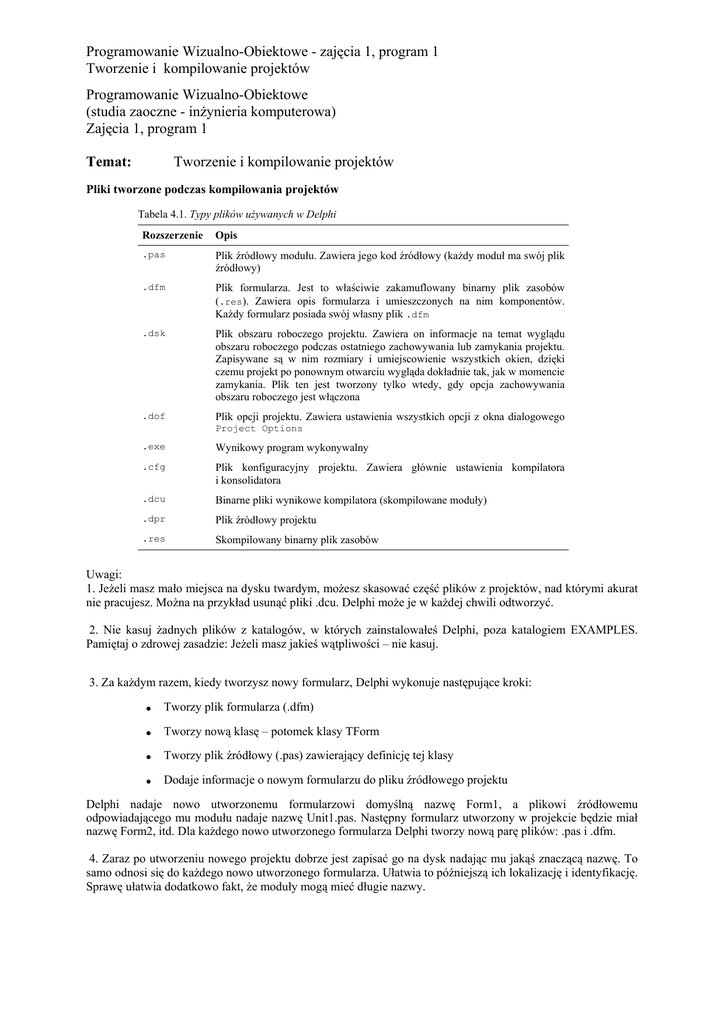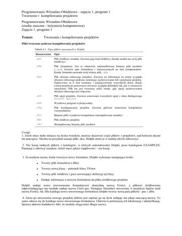 Programowanie Wizualno-Obiektowe - zajęcia 1, program 1 Tworzenie i kompilowanie projektów Programowanie Wizualno-Obiektowe (studia zaoczne - inżynieria komputerowa) Zajęcia 1, program 1 Temat: Tworzenie i kompilowanie projektów Pliki tworzone podczas kompilowania projektów Tabela 4.1. Typy plików używanych w Delphi Rozszerzenie Opis .pas Plik źródłowy modułu. Zawiera jego kod źródłowy (każdy moduł ma swój plik źródłowy) .dfm Plik formularza. Jest to właściwie zakamuflowany binarny plik zasobów (.res). Zawiera opis formularza i umieszczonych na nim komponentów. Każdy formularz posiada swój własny plik .dfm .dsk Plik obszaru roboczego projektu. Zawiera on informacje na temat wyglądu obszaru roboczego podczas ostatniego zachowywania lub zamykania projektu. Zapisywane są w nim rozmiary i umiejscowienie wszystkich okien, dzięki czemu projekt po ponownym otwarciu wygląda dokładnie tak, jak w momencie zamykania. Plik ten jest tworzony tylko wtedy, gdy opcja zachowywania obszaru roboczego jest włączona .dof Plik opcji projektu. Zawiera ustawienia wszystkich opcji z okna dialogowego Project Options .exe Wynikowy program wykonywalny .cfg Plik konfiguracyjny projektu. Zawiera głównie ustawienia kompilatora i konsolidatora .dcu Binarne pliki wynikowe kompilatora (skompilowane moduły) .dpr Plik źródłowy projektu .res Skompilowany binarny plik zasobów Uwagi: 1. Jeżeli masz mało miejsca na dysku twardym, możesz skasować część plików z projektów, nad którymi akurat nie pracujesz. Można na przykład usunąć pliki .dcu. Delphi może je w każdej chwili odtworzyć. 2. Nie kasuj żadnych plików z katalogów, w których zainstalowałeś Delphi, poza katalogiem EXAMPLES. Pamiętaj o zdrowej zasadzie: Jeżeli masz jakieś wątpliwości – nie kasuj. 3. Za każdym razem, kiedy tworzysz nowy formularz, Delphi wykonuje następujące kroki: Tworzy plik formularza (.dfm) Tworzy nową klasę – potomek klasy TForm Tworzy plik źródłowy (.pas) zawierający definicję tej klasy Dodaje informacje o nowym formularzu do pliku źródłowego projektu Delphi nadaje nowo utworzonemu formularzowi domyślną nazwę Form1, a plikowi źródłowemu odpowiadającego mu modułu nadaje nazwę Unit1.pas. Następny formularz utworzony w projekcie będzie miał nazwę Form2, itd. Dla każdego nowo utworzonego formularza Delphi tworzy nową parę plików: .pas i .dfm. 4. Zaraz po utworzeniu nowego projektu dobrze jest zapisać go na dysk nadając mu jakąś znaczącą nazwę. To samo odnosi się do każdego nowo utworzonego formularza. Ułatwia to późniejszą ich lokalizację i identyfikację. Sprawę ułatwia dodatkowo fakt, że moduły mogą mieć długie nazwy. Programowanie Wizualno-Obiektowe - zajęcia 1, program 1 Tworzenie i kompilowanie projektów 5. Niezbędne są tylko pliki .pas, .dfm i .dpr. Wszystkie pozostałe zostaną odtworzone podczas ponownej kompilacji. Oprócz tego, jeżeli chcesz zachować ustawienia obszaru roboczego, musisz również zabezpieczyć plik .dsk.