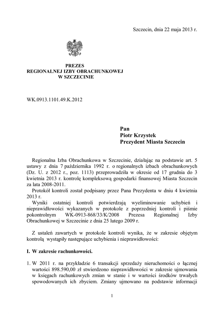 Szczecin, dnia 22 maja 2013 r. PREZES REGIONALNEJ IZBY OBRACHUNKOWEJ W SZCZECINIE WK.0913.1101.49.K.2012 Pan Piotr Krzystek Prezydent Miasta Szczecin Regionalna Izba Obrachunkowa w Szczecinie, działając na podstawie art. 5 ustawy z dnia 7 października 1992 r. o regionalnych izbach obrachunkowych (Dz. U. z 2012 r., poz. 1113) przeprowadziła w okresie od 17 grudnia do 3 kwietnia 2013 r. kontrolę kompleksową gospodarki finansowej Miasta Szczecin za lata 2008-2011. Protokół kontroli został podpisany przez Pana Prezydenta w dniu 4 kwietnia 2013 r. Wyniki ostatniej kontroli potwierdzają wyeliminowanie uchybień i nieprawidłowości wykazanych w protokole z poprzedniej kontroli i piśmie pokontrolnym WK-0913-868/33/K/2008 Prezesa Regionalnej Izby Obrachunkowej w Szczecinie z dnia 25 lutego 2009 r. Z ustaleń zawartych w protokole kontroli wynika, że w zakresie objętym kontrolą wystąpiły następujące uchybienia i nieprawidłowości: I. W zakresie rachunkowości. 1. W 2011 r. na przykładzie 6 transakcji sprzedaży nieruchomości o łącznej wartości 898.590,00 zł stwierdzono nieprawidłowości w zakresie ujmowania w księgach rachunkowych zmian w stanie i w wartości środków trwałych spowodowanych ich zbyciem. Zmiany ujmowano na podstawie informacji 1 kwartalnej o stanie mienia komunalnego przekazywanej do Wydziału Księgowości przez Wydział Gospodarki Nieruchomościami, tj. od 44 do 84 dni po dniu sprzedaży nieruchomości i w konsekwencji od 30 do 61 dni po upływie okresu sprawozdawczego, w którym zostały sprzedane, czym naruszono przepisy art. 20 ust. 1 i art. 24 ust. 1 ustawy z dnia 29 września 1994 r. o rachunkowości (Dz. U. z 2009 roku Nr 152, poz. 1223 z późn. zm.), za co odpowiedzialność ponosi Główny Specjalista Wydziału Księgowości oraz Dyrektor Wydziału Gospodarki Nieruchomościami, a z tytułu nadzoru Dyrektor Wydziału Księgowości – str. 309-311 protokołu kontroli. 2. W 2011 r. na przykładzie 18 raportów kasowych dotyczących operacji gotówkowych na łączną kwotę 110.621,80 zł stwierdzono, iż księgi rachunkowe nie były prowadzone w sposób bieżący. Ustalono, iż operacje dotyczące wypłat gotówkowych (zwroty należności z tytułu nadpłaty w podatku od nieruchomości, podatku rolnym, opłacie skarbowej, opłacie za wieczyste użytkowanie, opłacie za zajęcie pasa jezdni i opłacie od posiadania psa oraz mandatów) ujmowano w innych dniach niż zostały one dokonane, z opóźnieniem sięgającym 208 dni, czym naruszono przepisy art. 20 ust. 1 i art. 24 ust. 1 w związku z art. 24 ust. 5 pkt 3 ustawy z dnia 29 września 1994 r. o rachunkowości oraz § 7 ust. 9 Instrukcji gospodarki kasowej stanowiącej załącznik Nr 4 do zarządzenia Nr 651/10 Prezydenta Miasta Szczecin z dnia 31 grudnia 2010 r. w sprawie zasad prowadzenia rachunkowości, za co odpowiedzialność ponosi Inspektor Referatu Rozliczeń Finansowych, a z tytułu nadzoru Kierownik Referatu – str. 23-25 protokołu kontroli. II. W zakresie spraw budżetowych, finansowych oraz sprawozdawczości. 1. W latach 2010-2011 r. stwierdzono przypadki rozbieżności pomiędzy danymi zawartymi w ewidencji gruntów i budynków a danymi zawartymi w informacjach podatkowych składanych przez podatników oraz przypadki dokonywania niewłaściwego wymiaru należnych podatków: a) w zakresie podatku rolnego: − w decyzji WPiOL/3113/W/000308/2011 z dnia 3 stycznia 2011 r. wobec użytków rolnych o łącznej powierzchni fizycznej 0,8093 ha sklasyfikowanych w ewidencji gruntów i budynków jako ŁIV – 0,2593 ha i B-RV-0,55 ha zastosowano przelicznik powierzchni użytków rolnych (0,3870 ha powierzchni przeliczeniowej i podstawa wymiaru wynosząca 0,1945 ha) oraz stawkę podatku dla gruntów gospodarstw rolnych w wysokości 94,10 zł od 1 ha przeliczeniowego zamiast stawkę dla pozostałych gruntów o charakterze rolnym w wysokości 188,20 zł od 1 ha fizycznego w odniesieniu do gruntu sklasyfikowanego jako ŁIV – 0,2593 ha, dokonując w konsekwencji wymiaru podatku w kwocie 18,00 zł zamiast 49,00 zł – różnica wyniosła 31,00 zł, 2 − w decyzji WPiOL/3113/W/000591/2011 z dnia 3 stycznia 2011 r. wymiaru dokonano w oparciu o dane inne niż wynikające z ewidencji gruntów i budynków, tj. ustalono podatek rolny w wysokości 0,00 zł w odniesieniu do gruntów o łącznej powierzchni fizycznej 0,4464 ha (0,0893 ha powierzchni przeliczeniowej i podstawa wymiaru wynosząca 0,0000 ha) zamiast w odniesieniu do gruntów o łącznej powierzchni fizycznej 0,9377 ha (0,6504 ha powierzchni przeliczeniowej i podstawa wymiaru wynosząca 0,4153 ha) – różnica wyniosła 78,00 zł, co pozostaje w sprzeczności z przepisami art. 1, art. 2 ust. 1 i art. 4 ust. 1 pkt 2 ustawy z dnia 15 listopada 1984 r. o podatku rolnym (Dz. U. z 2006 r. Nr 136, poz. 969 z późn. zm.) oraz art. 21 ust. 1 ustawy z dnia 17 maja 1989 r. Prawo geodezyjne i kartograficzne (Dz. U. z 2010 r. Nr 193, poz. 1287 z późn. zm.), b) w zakresie podatku od nieruchomości: − w 4 przypadkach pomimo wykazania w informacjach podatkowych złożonych przez podatników poszczególnych nieruchomości oraz danych wynikających z ewidencji gruntów i budynków nie objęto wymiarem i nie naliczono podatku w odniesieniu do: budynków mieszkalnych o powierzchni 85 m2 (decyzja WPiOL/3113/W/000374/2011 z dnia 3 stycznia 2011 r. – różnica wyniosła 54,00 zł), budynków mieszkalnych o powierzchni 140 m2, budynków pozostałych o powierzchni 50 m2, gruntów zabudowanych o powierzchni 856 m2 (decyzja WPiOL/3111/W/000279/2011 z dnia 3 stycznia 2011 r. – różnica wyniosła 730,00 zł), budynków pozostałych związanych z prowadzeniem działalności o powierzchni 100 m2 (decyzja WPiOL/3113/W/000735/2011 z dnia 3 stycznia 2011 r. – różnica wyniosła 2.070,00 zł) oraz gruntów o powierzchni 0,77 ha (decyzja WPiOL/3113/W/000591/2011 z dnia 3 stycznia 2011 r. – różnica wyniosła 131,00 zł), − w 2 przypadkach niewłaściwi