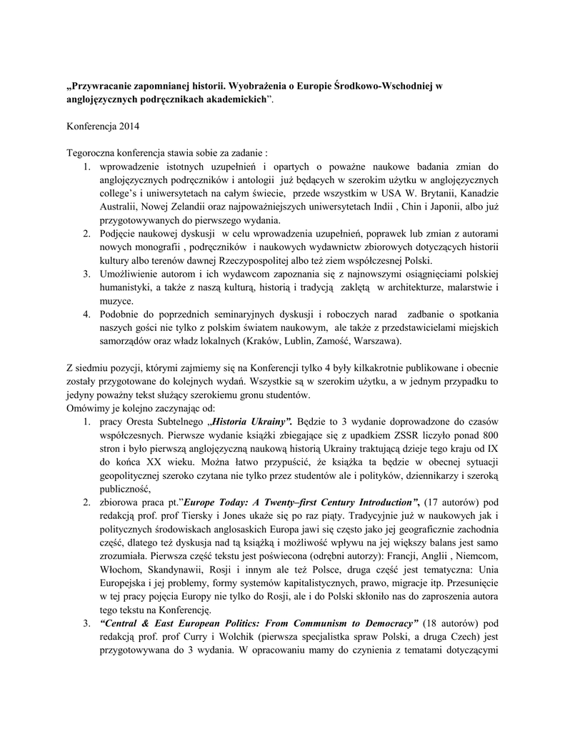 „Przywracanie zapomnianej historii. Wyobrażenia o Europie Środkowo-Wschodniej w anglojęzycznych podręcznikach akademickich”. Konferencja 2014 Tegoroczna konferencja stawia sobie za zadanie : 1. wprowadzenie istotnych uzupełnień i opartych o poważne naukowe badania zmian do anglojęzycznych podręczników i antologii już będących w szerokim użytku w anglojęzycznych college’s i uniwersytetach na całym świecie, przede wszystkim w USA W. Brytanii, Kanadzie Australii, Nowej Zelandii oraz najpoważniejszych uniwersytetach Indii , Chin i Japonii, albo już przygotowywanych do pierwszego wydania. 2. Podjęcie naukowej dyskusji w celu wprowadzenia uzupełnień, poprawek lub zmian z autorami nowych monografii , podręczników i naukowych wydawnictw zbiorowych dotyczących historii kultury albo terenów dawnej Rzeczypospolitej albo też ziem współczesnej Polski. 3. Umożliwienie autorom i ich wydawcom zapoznania się z najnowszymi osiągnięciami polskiej humanistyki, a także z naszą kulturą, historią i tradycją zaklętą w architekturze, malarstwie i muzyce. 4. Podobnie do poprzednich seminaryjnych dyskusji i roboczych narad zadbanie o spotkania naszych gości nie tylko z polskim światem naukowym, ale także z przedstawicielami miejskich samorządów oraz władz lokalnych (Kraków, Lublin, Zamość, Warszawa). Z siedmiu pozycji, którymi zajmiemy się na Konferencji tylko 4 były kilkakrotnie publikowane i obecnie zostały przygotowane do kolejnych wydań. Wszystkie są w szerokim użytku, a w jednym przypadku to jedyny poważny tekst służący szerokiemu gronu studentów. Omówimy je kolejno zaczynając od: 1. pracy Oresta Subtelnego „Historia Ukrainy”. Będzie to 3 wydanie doprowadzone do czasów współczesnych. Pierwsze wydanie książki zbiegające się z upadkiem ZSSR liczyło ponad 800 stron i było pierwszą anglojęzyczną naukową historią Ukrainy traktującą dzieje tego kraju od IX do końca XX wieku. Można łatwo przypuścić, że książka ta będzie w obecnej sytuacji geopolitycznej szeroko czytana nie tylko przez studentów ale i polityków, dziennikarzy i szeroką publiczność, 2. zbiorowa praca pt.”Europe Today: A Twenty–first Century Introduction”, (17 autorów) pod redakcją prof. prof Tiersky i Jones ukaże się po raz piąty. Tradycyjnie już w naukowych jak i politycznych środowiskach anglosaskich Europa jawi się często jako jej geograficznie zachodnia część, dlatego też dyskusja nad tą książką i możliwość wpływu na jej większy balans jest samo zrozumiała. Pierwsza część tekstu jest poświecona (odrębni autorzy): Francji, Anglii , Niemcom, Włochom, Skandynawii, Rosji i innym ale też Polsce, druga część jest tematyczna: Unia Europejska i jej problemy, formy systemów kapitalistycznych, prawo, migracje itp. Przesunięcie w tej pracy pojęcia Europy nie tylko do Rosji, ale i do Polski skłoniło nas do zaproszenia autora tego tekstu na Konferencję. 3. “Central & East European Politics: From Communism to Democracy” (18 autorów) pod redakcją prof. prof Curry i Wolchik (pierwsza specjalistka spraw Polski, a druga Czech) jest przygotowywana do 3 wydania. W opracowaniu mamy do czynienia z tematami dotyczącymi całej Europy, jak: rola kobiet we współczesnym życiu, czy też pojęcie męskości, a dalej bardziej już specjalistyczna dyskusja poszczególnych państw. Wydaje się, że szczególnie tematyczne wątki oraz pewne ważne dla nas zagadnienia dotyczące problemów “wybijania się na wolność” warte są naszej krytycznej uwagi. Między innymi warto będzie podjąć dyskusję zwłaszcza w ocenie roli Solidarności versus Gorbaczow oraz symboliki (upadek muru berlińskiego) a pierwsze wolne wybory w bloku wciąż sowieckim w 1989 r. 4. „Western Cywilizations” pisana obecnie przez prof. prof Cole & Symes, przygotowywana do 20go wydania, jest najdłużej i najszerzej używanym (szczególnie w elitarnych) collegach i uniwersytetach. Autorzy wprowadzają wiele zmian, a w poprzednim seminarium w ramach naszej Konferencji wykazali się ogromnym zainteresowaniem i zapałem w “rozszerzaniu” zasięgu Europy i zmienianiu tradycyjnie negatywnej czarnej legendy naszego kraju (anarchia, ucisk chłopa, prześladowanie Żydów itd.). Ich pobyt tym razem będzie się koncentrował na zdobyciu dużego zasobu fotografii, danych statystycznych i dokumentów ułatwiających ich prace nad przygotowanie do kolejnej edycji, która ma się ukazać pod koniec 2015 r.. Dodajmy, że w dotychczasowych wydaniach wśród 1570 zdjęć zabytków sztuki, portretów, scen historycznych dominuje “tradycyjna” Stara Europa, jest Moskwa i Rosja, a prawie nie ma krajów byłego bloku sowieckiego. Wprowadzenie zmian poprzez pokazanie tradycji Polski jest oczywiście bardzo istotne. Ad pkt. 2: 1. Wśród 4 manuskryptów jest jedna praca zbiorowa (8 autorów) pod red. prof, prof. Mitterbauer i Smith-Prei. Praca ta stawia sobie za cel szerokie (polityka, kultura, społeczeństwo) porównania Europy Środkowo-Wschodniej sprzed I Wojny Światowej, a tej obecnej. Autorzy wydobywają podobieństwa i podkreślenie odmienności. Można przypuszczać, że książka wywoła duże zainteresowanie w kręgach naukowców, a studenci uznają ją za szczególnie przydatną dla pisania “nowatorskich” seminaryjnych esejów. 2. Trzy pozostałe manuskrypty są wynikiem wieloletniej pracy badawczej i przez dziesięciolecia będą służyć jako źródła informacji i interpretacji dla pokoleń ich czytelników. 3. Od dawna oczekiwana monografia ostatnich dwóch wieków Wilna oczywiście wywołuje olbrzymie zainteresowanie wśród Litwinow, Polaków, Żydów, Białorusinów i Rosjan. Na uniwersytetach będzie służyć na popularnych kursach dotyczących porównywania (globalnie) miast szczególnie ważnych w dziejach swych regionów, a także jako świetny materiał dotyczący możliwości współżycia na miejskim szczupłym terenie odmiennyc