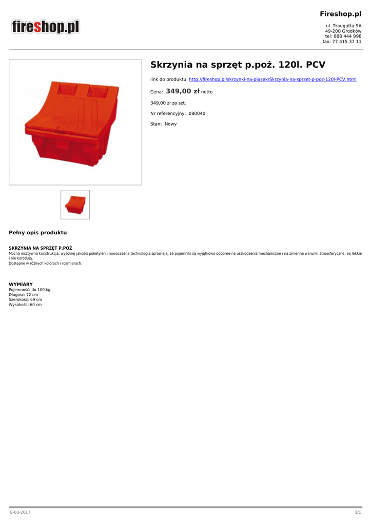 Fireshop.pl ul. Traugutta 9A 49-200 Grodków tel: 888 444 998 fax: 77 415 37 11 Skrzynia na sprzęt p.poż. 120l. PCV link do produktu: http://fireshop.pl/skrzynki-na-piasek/Skrzynia-na-sprzet-p-poz-120l-PCV.html Cena: 349,00 zł netto 349,00 zł za szt. Nr referencyjny: 080040 Stan: Nowy Pełny opis produktu SKRZYNIA NA SPRZĘT P.POŻ Mocna insztywna konstrukcja, wysokiej jakości polietylen i nowoczesna technologia sprawiają, że pojemniki są wyjątkowo odporne na uszkodzenia mechaniczne i na zmienne warunki atmosferyczne. Są lekkie i nie korodują. Dostępne w różnych kolorach i rozmiarach. WYMIARY Pojemność: do 100 kg Długość: 72 cm Szerokość: 69 cm Wysokość: 60 cm 8-03-2017 1/1