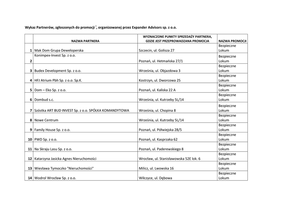 Wykaz Partnerów, zgłoszonych do promocji i, organizowanej przez Expander Advisors sp. z o.o. NAZWA PARTNERA WYZNACZONE PUNKTY SPRZEDAŻY PARTNERA, GDZIE JEST PRZEPROWADZANA PROMOCJA 1 Mak Dom Grupa Deweloperska Konimpex-Invest Sp. z o.o. 2 Szczecin, ul. Golisza 27 3 Budex Development Sp. z o.o. Września, ul. Objazdowa 3 4 HFJ Atrium Pbh Sp. z o.o. Sp.K. Kostrzyn, ul. Dworcowa 25 5 Dom – Eko Sp. z o.o. Poznań, ul. Kaliska 22 A 6 Dombud s.c. Września, ul. Kutrzeby 5L/14 Poznań, ul. Hetmańska 27/1 7 Szóstka ART BUD INVEST Sp. z o.o. SPÓŁKA KOMANDYTOWA Września, ul. Chopina 8 8 Nowe Centrum Września, ul. Kutrzeby 5L/14 9 Family House Sp. z o.o. Poznań, ul. Półwiejska 28/5 10 PWD Sp. z o.o. Poznań, ul. Kasprzaka 62 11 Na Skraju Lasu Sp. z o.o. Poznań, ul. Paderewskiego 8 12 Katarzyna Jasicka Agnes Nieruchomości Wrocław, ul. Stanisławowska 52E lok. 6 13 Wiesława Tymoczko "Nieruchomości" Milicz, ul. Lwowska 16 14 Wodrol Wrocław Sp. z o.o. Wilczyce, ul. Dębowa NAZWA PROMOCJI Bezpieczne Lokum Bezpieczne Lokum Bezpieczne Lokum Bezpieczne Lokum Bezpieczne Lokum Bezpieczne Lokum Bezpieczne Lokum Bezpieczne Lokum Bezpieczne Lokum Bezpieczne Lokum Bezpieczne Lokum Bezpieczne Lokum Bezpieczne Lokum Bezpieczne Lokum 15 Demar Finanse Daniel Marszałek Czernica, ul. Zielona 4 16 Ars-Home Nieruchomości Małgorzata Kozieł Wrocław, ul. Lelewela 4A/1 17 Abram Greens Sp. z o.o. Kraków, ul. Kazimierza Wlk 6 18 Biuro handlowo-usługowe Monada Ingeborga Wierzbicka Wrocław, ul. Zagony 79 lok 4 19 Keradom Sp. z o.o. Kiełczów ul. Wrocławska 11 20 Green Street Sp. z o.o. Wrocław, ul. Lelewela 21 lok 2 21 INKOM S.A. 22 Lokum Deweloper S.A. Wrocław, ul. Chałupnicza 21 Wrocław, ul. Jerzego Bajana 24, ul. Klimasa 4343e 23 Ekdom Sp. j. Ewa Gajda Krzysztof Gajda Brzezina, ul. Zacisze, Wilkszyn, ul. Wiśniowa 9 24 Alina Szlączka Eurodom Nieruchomości Wrocław, ul. Suwalska 16 lok. 8 25 Interium Investment Sp. z o.o. Gdańsk, ul. Malczewskiego 89 26 Bałtyckie Centrum Nieruchomości S.C. Gdynia, I Armii Wojska Polskiego 13/101 27 TresGo Nieruchomości Małgorzata Świąder Gdańsk, Orląt Lwowskich 74 28 Certus - Serwis Dariusz Kunicki Gdynia, ul. Pułkownika Stanisława Dąbka 259 Immobilia Kompleksowa Obsługa Nieruchomości Agnieszka 29 Opiela Chojnice, ul. Stary Rynek 9-10 30 BIURO PROFIT Bożena Giecewicz Gdynia, ul. Helska 8 Bezpieczne Lokum Bezpieczne Lokum Bezpieczne Lokum Bezpieczne Lokum Bezpieczne Lokum Bezpieczne Lokum Bezpieczne Lokum Bezpieczne Lokum Bezpieczne Lokum Bezpieczne Lokum Bezpieczne Lokum Bezpieczne Lokum Bezpieczne Lokum Bezpieczne Lokum Bezpieczne Lokum Bezpieczne Lokum 31 JOT-BE Nieruchomości Sp. z o.o. Wrocław, PIŁSUDSKIEGO 8A Bezpieczne Lokum 32 Incepti Development KP Investment Sp. z o.o. Wrocław, GEN JÓZEFA HALLERAb 182 /1 35 AD Nieruchomości Aneta Fiałek Malbork, Pl. Narutowicza 1a/11 36 Marsol Firma Handlowo-Usługowa Luzino, ul. Kopernika 4 Bezpieczne Lokum Bezpieczne Lokum Bezpieczne Lokum 37 Agora Nieruchomości - Henryk Wojsławski Gdańsk, Ul. Chmielna 26 lok. 115 Bezpieczne Lokum Bezpieczne Lokum Bezpieczne Lokum Bezpieczne Lokum Bezpieczne Lokum 38 Net Nieruchomości Katarzyna Krzemińska Pruszcz Gdański, ul. Chopina 2/22 39 Eko-Bud Banino Sp. z o.o. Banino, ul. Lipowa 8, 80-297 40 Guber House sp. z o.o. Mosina, ul. Marii Konopnickiej 23a 41 M&M Małgorzata Tomaszewska Poznań, ul. Artura Grottgera 16/1 42 Contrabanda Studio Przemysław Przybylak Poznań, ul. Nadolnik 14 B 43 L.A.Z. Joanna Rutkowska - Zoneman Poznań, ul. Strzelecka 29 44 WELLDOM Elżbieta Małek - Suwart Poznań, ul. Kołobrzeska 16 Bezpieczne Lokum Bezpieczne Lokum Bezpieczne Lokum 45 Integra Nieruchomości Barbara Rubinowska Poznań, ul. Górna Wilda 102/5 Bezpieczne Lokum 46 Express House Kurzawa Dąbrowski Smalkowski Szubzda Sp. J Poznań, Winogrady 32 lok. 1 Bezpieczne Lokum 47 Atrium Grunwald Sp. z o.o. Sp. Komandytowa 48 Kares Sp. z o.o. Poznań, ul. Daleka 14 Mrowino, Zmysłowo 1 Bezpieczne Lokum Bezpieczne Lokum 49 DomRat Invest Biuro Obrotu Nieruchomościami Poznań, ul. Dobra 36/1 Bezpieczne Lokum 50 PROINWESTYCJE Biuro Obrotu Nieruchomościami sp. z o.o. Poznań, Al. Karola Marcinkowskiego Bezpieczne Lokum Alternatywa Bis Biuro Obrotu Nieruchomościami Patrycja 51 Marszałek Poznań, ul.Głogowska 81/7 52 Biuro Obrotu Nieruchomościami BON Poznań, ul. Św. Czesława 4 53 Łowiccy Grupa Deweloperska Sp. z o.o. Poznań, ul. Jakuba Krauthofera, 13/1 54 Global Center Sp. z o.o. 55 i2 Development Sp. z o.o. Wrocław, ul. Dmowskiego 17B, "Amsterdam" Wrocław, ul. Szewska 8 oraz wszystkie punkty sprzedaży Partnera 56 Park Land Inwestycje S.C. Częstochowa, ul. Krótka 27A 57 Kilinskiego Property Investment Sp. z o.o. Łódź, ul. Kilińskiego 121/123 Starogard Gdański, os. 60-lecia Odzyskania Niepodległości Polski 1F 58 Użlis Nieruchomości Marcin Użlis Grażyna Wichłacz-Wysocka Biuro Pośrednictwa w Obrocie 59 Nieruchomościami Arkada Kalisz, ul. Szkolna 4/1 60 Greg Grzegorz Gurbała Tychy, ul. "Grota" Roweckiego 12 lok. 2 61 Roksana Chuchacz Bieruń, ul. Granitowa 29 lok. 6 62 ASSET Nieruchomości Agnieszka Zalewska Tychy, Ul. Budowlanych 37 63 Mermaid Properties Sp. z o.o. 64 Kwadrat S.C. Andrzej Kunikowski Iwona Mizerska Łódź, ul. Tymienieckiego 20 Łódź, al. Śmigłego Rydza 20 Bezpieczne Lokum Bezpieczne Lokum Bezpieczne Lokum Bezpieczne Lokum Bezpieczne Lokum Tanio urządzaj swoje lokum Tanio urządzaj swoje lokum Bezpieczne Lokum Bezpieczne Lokum Bezpieczne Lokum Bezpieczne Lokum Bezpieczne Lokum Tanio urządzaj swoje lokum Tanio urządzaj 65 BN Promotion Małgorzata Bauman, Bogna Nowotna 67 Makbud sc Poznań, ul. Stanisława Kunickiego 1 Warszawa, ul. Santocka (Zengarden Mokotów), Piaseczno, ul. Jarząbka (Osiedle Róż Piaseczno), Warszawa ul. Szeligi (Zengarden - Szeligi) Grodzisk Mazowiecki, ul. Nadarzyńska 77 (Osiedle Chłapowskiego - ul. Sportowa, Osiedle Sportowa III, Osiedle na Laski, Osiedle Szczęsna II) 68 Kreator Dom Development 