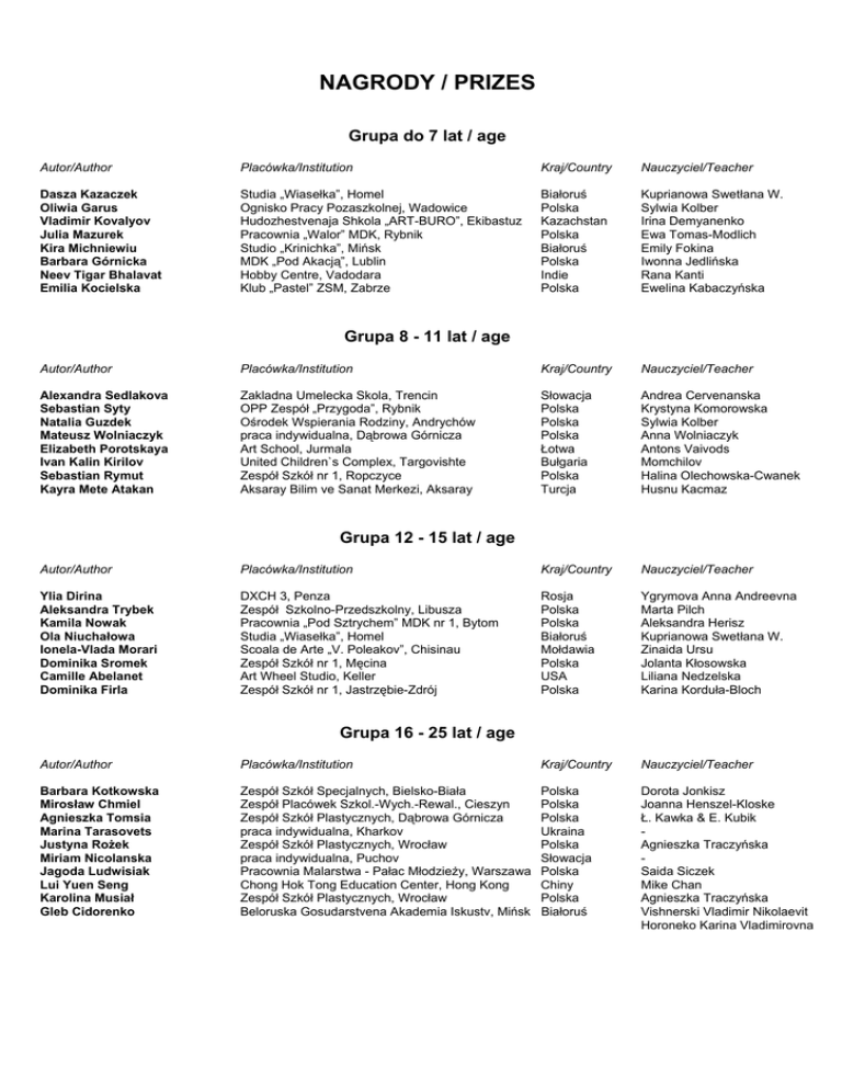 NAGRODY / PRIZES Grupa do 7 lat / age Autor/Author Placówka/Institution Kraj/Country Nauczyciel/Teacher Dasza Kazaczek Oliwia Garus Vladimir Kovalyov Julia Mazurek Kira Michniewiu Barbara Górnicka Neev Tigar Bhalavat Emilia Kocielska Studia „Wiasełka”, Homel Ognisko Pracy Pozaszkolnej, Wadowice Hudozhestvenaja Shkola „ART-BURO”, Ekibastuz Pracownia „Walor” MDK, Rybnik Studio „Krinichka”, Mińsk MDK „Pod Akacją”, Lublin Hobby Centre, Vadodara Klub „Pastel” ZSM, Zabrze Białoruś Polska Kazachstan Polska Białoruś Polska Indie Polska Kuprianowa Swetłana W. Sylwia Kolber Irina Demyanenko Ewa Tomas-Modlich Emily Fokina Iwonna Jedlińska Rana Kanti Ewelina Kabaczyńska Grupa 8 - 11 lat / age Autor/Author Placówka/Institution Kraj/Country Nauczyciel/Teacher Alexandra Sedlakova Sebastian Syty Natalia Guzdek Mateusz Wolniaczyk Elizabeth Porotskaya Ivan Kalin Kirilov Sebastian Rymut Kayra Mete Atakan Zakladna Umelecka Skola, Trencin OPP Zespół „Przygoda”, Rybnik Ośrodek Wspierania Rodziny, Andrychów praca indywidualna, Dąbrowa Górnicza Art School, Jurmala United Children`s Complex, Targovishte Zespół Szkół nr 1, Ropczyce Aksaray Bilim ve Sanat Merkezi, Aksaray Słowacja Polska Polska Polska Łotwa Bułgaria Polska Turcja Andrea Cervenanska Krystyna Komorowska Sylwia Kolber Anna Wolniaczyk Antons Vaivods Momchilov Halina Olechowska-Cwanek Husnu Kacmaz Grupa 12 - 15 lat / age Autor/Author Placówka/Institution Kraj/Country Nauczyciel/Teacher Ylia Dirina Aleksandra Trybek Kamila Nowak Ola Niuchałowa Ionela-Vlada Morari Dominika Sromek Camille Abelanet Dominika Firla DXCH 3, Penza Zespół Szkolno-Przedszkolny, Libusza Pracownia „Pod Sztrychem” MDK nr 1, Bytom Studia „Wiasełka”, Homel Scoala de Arte „V. Poleakov”, Chisinau Zespół Szkół nr 1, Męcina Art Wheel Studio, Keller Zespół Szkół nr 1, Jastrzębie-Zdrój Rosja Polska Polska Białoruś Mołdawia Polska USA Polska Ygrymova Anna Andreevna Marta Pilch Aleksandra Herisz Kuprianowa Swetłana W. Zinaida Ursu Jolanta Kłosowska Liliana Nedzelska Karina Korduła-Bloch Grupa 16 - 25 lat / age Autor/Author Placówka/Institution Kraj/Country Nauczyciel/Teacher Barbara Kotkowska Mirosław Chmiel Agnieszka Tomsia Marina Tarasovets Justyna Rożek Miriam Nicolanska Jagoda Ludwisiak Lui Yuen Seng Karolina Musiał Gleb Cidorenko Zespół Szkół Specjalnych, Bielsko-Biała Zespół Placówek Szkol.-Wych.-Rewal., Cieszyn Zespół Szkół Plastycznych, Dąbrowa Górnicza praca indywidualna, Kharkov Zespół Szkół Plastycznych, Wrocław praca indywidualna, Puchov Pracownia Malarstwa - Pałac Młodzieży, Warszawa Chong Hok Tong Education Center, Hong Kong Zespół Szkół Plastycznych, Wrocław Beloruska Gosudarstvena Akademia Iskustv, Mińsk Polska Polska Polska Ukraina Polska Słowacja Polska Chiny Polska Białoruś Dorota Jonkisz Joanna Henszel-Kloske Ł. Kawka & E. Kubik Agnieszka Traczyńska Saida Siczek Mike Chan Agnieszka Traczyńska Vishnerski Vladimir Nikolaevit Horoneko Karina Vladimirovna WYRÓŻNIENIA / HONOURABLES Grupa do 7 lat / age Autor/Author Placówka/Institution Kraj/Country Nauczyciel/Teacher Hind Abdulaziz Ahmed Mohammed Al Nkhailawi Darius Lim Wei Chen Georgij Kvantaliani Polina Novitckaya Julia Bartnik Lena Gasińska Inga Czarnecka Nikola Kukla Al Salam Kindergarten, Sharjah Mee Toh School, Singapore NC Centre for Children and Youth, Mińsk Children`s Art School, Zaporozhye Przedszkole nr 77, Wrocław Ognisko Pracy Pozaszkolnej, Wadowice Młodzieżowy Dom Kultury, Płock OPP Zespół „Przygoda”, Rybnik Emiraty Arabskie Singapur Białoruś Ukraina Polska Polska Polska Polska Aisha Baker Juri Ivanov Irina A. Makovskaya A. Skowerska-Zamorska Agnieszka Pasternak-Fraś Sylwia Serwach-Barucha Krystyna Komorowska Kraj/Country Nauczyciel/Teacher Polska Polska Polska Mołdawia Bułgaria USA Bułgaria Polska Danuta Sarna Elżbieta Kupny Saida Siczek Tamara Samohin Kremena Popova Liliana Nedzelska Momchilov Zuzanna Starzyńska Grupa 8 - 11 lat / age Autor/Author Placówka/Institution Wiktor Śliwiński Pracownia Plastyczna „Kameleon” MDK, Rybnik Maja Zorychta Klub „Pastel” ZSM, Zabrze Katarzyna Nasiłowska Pracownia Malarstwa - Pałac Młodzieży, Warszawa Anna Chetreanu Scoala de Arte „V. Poleokov”, Chisnau Kameliya Danailova Nikolova Art School „Geya” MCHC, Lovech Haleigh Hendrix Art Wheel Studio, Keller Ekaterina Vladimirova Stoyanova United Children`s Complex, Targovishte Gabriela Patyńska Młodzieżowy Dom Kultury, Kielce Grupa 12 - 15 lat / age Autor/Author Placówka/Institution Kraj/Country Nauczyciel/Teacher Zuzanna Skowronek Neda Varpukauskaite Maria Klezovich Nikolay Vladislavov Georgiev Laura Valachova Zuzanna Kaczmarczyk Patrycja Dziemidowicz Anna Bielawska Pracownia Klubu Osiedlowego ”Borsuczek”, Kraków School of Art, Salantai Gimnazjum nr 3, Soligorsk Art School „Geya” MCHC, Lovech Zakladna Umelecka Skola, Trencin Młodzieżowy Dom Kultury, Kielce Gimnazjum nr 1, Konstantynów Łódzki Gimnazjum nr 49, Bydgoszcz Polska Litwa Białoruś Bułgaria Słowacja Polska Polska Polska Maria Cisło Ingrida Taujanskiene Irina Filimonava Kremena Popova Andrea Cervenanska Zuzanna Starzyńska Wiesława Przybyło-Cieślik Aleksandra Arke Grupa 16 - 25 lat / age Autor/Author Placówka/Institution Kraj/Country Nauczyciel/Teacher Mariusz Ostapowicz Marek Walczak Klaudia Kolovics Katia Lazar Kwan Sharmaine Galina Smolenschi Magdalena Zięba Michalina Wachowicz Pola Daniel Maciej Gil Zespół Szkół Specjalnych, Skoczów Zespół Szkół Specjalnych, Skoczów MKC Nepker, Subotica State Art, Mińsk Simply Art, Hong Kong Colegiu Tehnologic, Chisinau Zespół Szkół Plastycznych, Dąbrowa Górnicza MDK „Pod Akacją”, Lublin Klub „Pastel” ZSM, Zabrze Centrum Kultury i Sztuki, Konin Polska Polska Serbia Białoruś Chiny Mołdawia Polska Polska Polska Polska Teresa Frydrychowska Teresa Krusze-Kusińska Gyorgy Boros Karina Kharaneka Alexa Raisa Łukasz Kawk