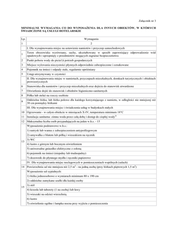 Załącznik nr 3 MINIMALNE WYMAGANIA CO DO WYPOSAŻENIA DLA INNYCH OBIEKTÓW, W KTÓRYCH ŚWIADCZONE SĄ USŁUGI HOTELARSKIE Wymagania Lp. 1 2 I. Dla wynajmowania miejsc na ustawienie namiotów i przyczep samochodowych 1 Teren obozowiska wyrównany, suchy, ukształtowany w sposób zapewniający odprowadzenie wód opadowych i uprzątnięty z przedmiotów mogących zagrażać bezpieczeństwu 2 Punkt poboru wody do picia1)i potrzeb gospodarczych 3 Miejsce wylewania nieczystości płynnych odpowiednio zabezpieczone i oznakowane 4 Pojemnik na śmieci i odpady stałe, regularnie opróżniany 5 Ustęp utrzymywany w czystości II. Dla wynajmowania miejsc w namiotach, przyczepach mieszkalnych, domkach turystycznych i obiektach prowizorycznych 6 Stanowiska dla namiotów i przyczep mieszkalnych oraz dojścia do stanowisk utwardzone 7 Oświetlenie dojść do stanowisk i obiektów higieniczno-sanitarnych 8 Półka lub stelaż na rzeczy osobiste 9 Oddzielne łóżka, lub łóżka polowe dla każdego korzystającego z namiotu, w odległości nie mniejszej niż 30 cm pomiędzy łóżkami III. Dla wynajmowania miejsc i świadczenia usług w budynkach stałych 10 Ogrzewanie - w całym obiekcie w miesiącach X-IV, temperatura minimum 18°C 11 Instalacja sanitarna: zimna woda przez całą dobę i dostęp do ciepłej wody2) 12 Maksymalna liczba osób przypadających na jeden w.h.s. - 15 Wyposażenie podstawowe w.h.s.: 1) natrysk lub wanna z zabezpieczeniem antypoślizgowym 2) umywalka z blatem lub półką i wieszakiem na ręcznik 13 3) WC 4) lustro z górnym lub bocznym oświetleniem 5) uniwersalne gniazdko elektryczne z osłoną 6) pojemnik na śmieci (niepalny lub trudnopalny) 7) dozownik do płynnego mydła i ręczniki papierowe IV. Dla wynajmowania miejsc noclegowych w pomieszczeniach wspólnych (salach) 14 Powierzchnia sal nie mniejsza niż 2,5 m2 - na jedną osobę (przy łóżkach piętrowych 1,5 m2) Wyposażenie sal sypialnych: 1) łóżka jednoosobowe o wymiarach minimum 80 x 190 cm 2) oddzielne zamykane szafki dla każdej osoby 15 3) stół 4) krzesła lub taborety (1 na osobę) lub ławy 5) wieszaki na odzież wierzchnią 6) lustro 7) oświetlenie ogólne i lampka nocna przy wyjściu z pomieszczenia Dostęp do w.h.s. jak w lp. 12 i 13 V. Dla wynajmowania samodzielnych pokoi Powierzchnia mieszkalna w m2: 17 1) pokój 1- i 2-osobowy - 6 m2 2) pokój większy niż 2-osobowy - dodatkowo 2 m2 na każdą następną osobę3) Zestaw wyposażenia meblowego: 1) łóżka jednoosobowe o wymiarach minimum 80 x 190 cm 2) łóżko dwuosobowe o wymiarach minimum 120 x 190 cm 18 3) nocny stolik lub półka przy każdym łóżku 4) stół lub stolik 5) krzesło lub taboret (1 na osobę, lecz nie mniej niż 2 na pokój) lub ława 6) wieszak na odzież oraz półka lub stelaż na rzeczy osobiste Pościel dla jednej osoby: 1) kołdra lub dwa koce 19 2) poduszka 3) poszwa 4) poszewka na poduszkę 5) prześcieradło 20 Oświetlenie - minimum jeden punkt świetlny o mocy 60 W 21 Zasłony okienne zaciemniające 22 Dostęp do w.h.s. jak w lp. 12 i 13 23 Kosz na śmieci niepalny lub trudno zapalny Objaśnienia skrótów; 1 dopuszcza się miejsca biwakowania przy szlakach wodnych bez punktu poboru wody do picia 2 minimum dwie godziny rano i dwie godziny wieczorem o ustalonych porach 3 w pomieszczeniach o wysokości co najmniej 2,5 m dopuszcza się łóżka piętrowe powierzchnia pokoju może zostać zmniejszona o 20 % whs; węzeł higieniczno - sanitarny