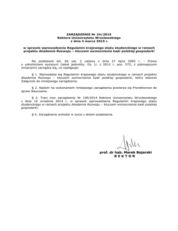 ZARZĄDZENIE Nr 24/2015 Rektora Uniwersytetu Wrocławskiego z dnia 4 marca 2015 r. w sprawie wprowadzenia Regulamin krajowego stażu studenckiego w ramach projektu Akademia Rozwoju – kluczem wzmocnienia kadr polskiej gospodarki Na podstawie art. 66 ust. 2 ustawy z dnia 27 lipca 2005 r. - Prawo o szkolnictwie wyższym (tekst jednolity: Dz. U. z 2012 r. poz. 572, z późniejszymi zmianami) zarządza się, co następuje: § 1. Wprowadza się Regulamin krajowego stażu studenckiego w ramach projektu Akademia Rozwoju – kluczem wzmocnienia kadr polskiej gospodarki, który stanowi Załącznik do niniejszego zarządzenia. § 2. Nadzór na wykonaniem niniejszego zarządzenia powierza się Prorektorowi do spraw Nauczania. § 3. Traci moc zarządzenie Nr 106/2014 Rektora Uniwersytetu Wrocławskiego z dnia 16 września 2014 r. w sprawie wprowadzenia Regulamin krajowego stażu studenckiego w ramach projektu Akademia Rozwoju – kluczem wzmocnienia kadr polskiej gospodarki. § 4. Zarządzenie wchodzi w życie z dniem podpisania. Załącznik do zarządzenia Nr 24/2015 z dnia 4 marca 2015 r. Regulamin krajowego stażu studenckiego w ramach projektu Akademia Rozwoju – kluczem wzmocnienia kadr polskiej gospodarki I . POSTANOWIENIA OGÓLNE §1 Na potrzeby niniejszego Regulaminu przyjmuje się następujące definicje: 1/ Regulamin – regulamin krajowego płatnego stażu studenckiego w ramach Projektu Akademia Rozwoju – kluczem wzmocnienia kadr polskiej gospodarki; 2/ Projekt – projekt Akademia Rozwoju – kluczem wzmocnienia kadr polskiej gospodarki, współfinansowany ze środków Unii Europejskiej w ramach Europejskiego Funduszu Społecznego i wdrażany w ramach Programu Operacyjnego Kapitał Ludzki (PO KL), Priorytet IV Szkolnictwo Wyższe i Nauka, Działanie 4.3 Wzmocnienie potencjału dydaktycznego uczelni w obszarach kluczowych w kontekście celów strategii Europa 2020; 3/ Biuro Karier – jednostka Uniwersytetu Wrocławskiego: Biuro Zawodowej Promocji Studentów i Absolwentów - Biuro Karier; 4/ Organizator stażu – Uniwersytet Wrocławski, pl. Uniwersytecki 1, 50-137 Wrocław, który realizuje projekt Akademia Rozwoju – kluczem wzmocnienia kadr polskiej gospodarki; 5/ Staż – oznacza odpłatne wykonywanie przez Stażystę zadań określonych w programie stażu w Jednostce przyjmującej na staż, bez nawiązywania stosunku pracy; 6/ Kandydat – osoba ubiegająca się o możliwość odbycia stażu, będąca studentem trzeciego lub czwartego roku studiów I stopnia albo studentem studiów II stopnia kierunku kluczowego, na którym kształcenie wpisuje się w dziedziny szczególnie istotne w kontekście realizacji strategii Europa 2020; 7/ Stażysta – oznacza studenta odbywającego staż w ramach Projektu; 8/ Kierunek kluczowy- kierunek realizowany na jednym z Wydziałów, o których mowa w § 2 ust. 4, kształcenie na którym wpisuje się w Obszary kształcenia kluczowe w kontekście realizacji strategii Europa 2020; 9/ Obszary kształcenia kluczowe w kontekście realizacji strategii Europa 2020 – obszary kształcenia zdefiniowane na potrzeby konkursu zamkniętego nr 1/POKL/4.3/2012 opisane w Załączniku Nr 1 do Regulaminu; 10/ Jednostka przyjmująca na staż – instytucja państwowa, samorządowa, organizacja pozarządowa, przedsiębiorstwo, przyjmujące stażystę na staż; 11/ Opiekun stażu – osoba wyznaczona w Jednostce przyjmującej na staż do sprawowania nadzoru nad organizacją i przebiegiem stażu w miejscu jego odbywania oraz nad realizacją zadań przez Stażystę; 12/ Program stażu - dokument zawierający m.in. szczegółowy opis zakresu obowiązków i zadań, jakie będą wykonywane podczas stażu oraz rodzaj uzyskanych kwalifikacji lub umiejętności zawodowych po odbytym stażu, którego zakres związany jest z przynajmniej jednym z obszarów kształcenia kluczowych w kontekście realizacji strategii Europa 2020. Wzór Programu stażu stanowi Załącznik Nr 2 do Regulaminu; _____________________________________________________________________________________________ Projekt „Akademia Rozwoju - kluczem wzmocnienia kadr polskiej gospodarki” współfinansowany ze środków Unii Europejskiej w ramach Europejskiego Funduszu Społecznego 13/ Umowa stażowa – trójstronna umowa zawarta pomiędzy Organizatorem stażu, Jednostką przyjmującą na staż i Stażystą, która określa prawa i obowiązki stron; 14/ Ogłoszenie rekrutacyjne – dokument zawierający szczegółowe informacje dotyczące rekrutacji na konkretną turę staży (m.in. o terminarzu, dostępnych programach staży, limicie miejsc itp.); 15/ Kierownik projektu - oznacza osobę powołaną przez Prorektora ds. Nauczania do pełnienia funkcji kierownika projektu; 16/ Komisja stażowa – oznacza komisję powołaną przez Prorektora ds. Nauczania w celu dokonania wyboru Jednostek przyjmujących na staż oraz wykonywania innych czynności przewidzianych niniejszym Regulaminem. W skład Komisji stażowej wchodzą dwaj przedstawiciele Biura Karier oraz Kierownik Projektu. §2 1. Regulamin określa tryb i zasady przyznawania oraz odbywania krajowego płatnego stażu studenckiego w ramach projektu pn. Akademia Rozwoju – kluczem wzmocnienia kadr polskiej gospodarki, współfinansowanego ze środków Unii Europejskiej w ramach Europejskiego Funduszu Społecznego. Projekt realizowany jest przez Uniwersytet Wrocławski w ramach Priorytetu IV, Działanie 4.3 Programu Operacyjnego Kapitał Ludzki. 2. Staże mają na celu umożliwienie Stażyście zdobycia wiedzy w zakresie funkcjonowania podmiotów gospodarczych, jak również zdobycie doświadczenia zawodowego w obszarach kluczowych w kontekście realizacji strategii Europa 2020, ułatwiającego start na rynku pracy, m.in. poprzez poznanie własnych predyspozycji zawodowych oraz powiązanie wiedzy teoretycznej zdobytej na studiach z umiejętnościami praktycznymi kluczowymi z punktu widzenia rozwoju nowoczesnej gospodarki. 3. Zakłada się organizację ł