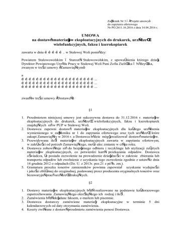Załącznik Nr 3 – „Projekt umowy” do zapytania ofertowego Nr PO.2611.16.2016 z dnia 14.04.2016 r. UMOWA na dostawę materiałów eksploatacyjnych do drukarek, urządzeń wielofunkcyjnych, faksu i kserokopiarek zawarta w dniu …………….. w Stalowej Woli pomiędzy: Powiatem Stalowowolskim – Starostą Stalowowolskim, z upoważnienia którego działa Dyrektor Powiatowego Urzędu Pracy w Stalowej Woli Pani Zofia Zielińska – Nędzyńska, zwanym w treści umowy „Zamawiającym” a ……………………………………………………... ……………………………………………………... ……………………………………………………... zwaną w treści umowy „Dostawcą” §1 1. Przedmiotem niniejszej umowy jest sukcesywna dostawa do 31.12.2016 r. materiałów eksploatacyjnych do drukarek, urządzeń wielofunkcyjnych, faksu i kserokopiarek znajdujących się w PUP w Stalowej Woli. 2. Dostawca zapewni dostawę materiałów eksploatacyjnych dla każdego urządzenia wymienionego w załączniku nr 1 do zapytania ofertowego oraz tych urządzeń, które zakupi Zamawiający w 2016 r. a Dostawca będzie mógł zrealizować dostawę materiałów. 3. Przewidywana ilość materiałów eksploatacyjnych zawarta w zapytaniu ofertowym, w zależności od potrzeb Zamawiającego, może ulec zmianie w ciągu roku. 4. Dostawca zobowiązuje się do bezpłatnego odbioru i recyklingu lub utylizacji zużytych materiałów eksploatacyjnych, co potwierdzi kartą przekazania odpadów. Dostawca oświadcza, że posiada zezwolenie na prowadzenie działalności w zakresie zbierania lub transportu odpadów lub zwolnienie z uzyskania tego zezwolenia zgodnie z ustawą z dnia 14 grudnia 2012 o odpadach (Dz. U. z 2013r. poz.21 z późn. zm.). 5. Gramatura proszku tonerów zamienników powinna zapewniać uzyskanie wydajności i jakości zbliżonej do oryginalnej, podawanej przez producenta oryginalnych tonerów oraz bezawaryjną pracę urządzeń drukujących. §2 1. Dostawy materiałów eksploatacyjnych będą realizowane na podstawie każdorazowego zapotrzebowania Zamawiającego określającego ich rodzaj i ilość. 2. Zamówienia będą składane faksem, e-mailem lub pisemnie. 3. Dostawca dostarczy zamówione materiały eksploatacyjne w terminie 5 dni kalendarzowych od daty otrzymania zamówienia. 4. Koszty związane z dostawą przedmiotu zamówienia ponosi Dostawca. 5. W przypadku opóźnienia w dostawie zamówionych materiałów eksploatacyjnych, Dostawca będzie zobowiązany do zapłaty kary umownej za każdy dzień opóźnienia w wysokości 1% wartości realizowanej dostawy. §3 1. W przypadku stwierdzenia przez Zamawiającego wad jakościowych w dostarczonych materiałach eksploatacyjnych, Dostawca zobowiązuje się wymienić wadliwe materiały eksploatacyjne na wolne od wad w terminie 5 dni od zgłoszenia reklamacji. 2. Zgłoszenie reklamacji przez Zamawiającego nastąpi faksem, e-mailem lub pisemnie. 3. W przypadku dostarczenia materiałów eksploatacyjnych, których użycie spowoduje uszkodzenie urządzenia drukującego, potwierdzone przez przedstawiciela autoryzowanego serwisu producenta urządzeń, Dostawca zobowiązuje się do usunięcia tych uszkodzeń na swój koszt oraz zwrotu kosztów związanych z wydaniem opinii/ekspertyzy. 4. W przypadku gdy w okresie realizacji umowy liczba wadliwych materiałów eksploatacyjnych w stosunku do zakupionych przekroczy 5% Zamawiającemu będzie przysługiwać prawo naliczenia kary umownej za każdy produkt, w stosunku do którego takie zdarzenie stwierdzono, w wysokości 50,00 złotych. Naliczenie wskazanych kar nie wpływa na zobowiązania Wykonawcy z tytułu gwarancji w zakresie wymiany wadliwego produktu, w tym poniesienia kosztów jego wymiany lub naprawy uszkodzenia sprzętu spowodowanego przez produkt. §5 1. 2. Ceny jednostkowe zaoferowane przez Dostawcę w przedłożonej ofercie cenowej z dnia ……………….. obowiązują w całym okresie realizacji umowy. Ceny materiałów eksploatacyjnych niewymienionych w załączniku nr 1 do zapytania ofertowego nie mogą odbiegać od cen rynkowych i muszą być każdorazowo uzgadniane z Zamawiającym. W przypadku braku akceptacji ceny Zamawiający może dokonać zakupu u innego Wykonawcy. §6 1. Wraz z dostawą materiałów eksploatacyjnych Dostawca przedłoży fakturę VAT, wystawioną na: Powiatowy Urząd Pracy w Stalowej Woli, ul. R. Dmowskiego 8, 37-450 Stalowa Wola, NIP: 865-15-30-619. 2. Należność za dostawę zostanie uregulowana przez Zamawiającego przelewem na rachunek bankowy w terminie określonym w prawidłowo wystawionej fakturze, nie krótszym niż 14 dni od daty otrzymania. 3. W razie opóźnienia w uiszczeniu należności Dostawcy służy prawo naliczania ustawowych odsetek na podstawie obowiązujących przepisów. §7 Umowa niniejsza zostaje zawarta na okres do dnia 31.12.2016 r. §8 Osobą upoważnioną do kontaktów z Dostawcą ze strony Zamawiającego jest: § ……………………………… Osobą upoważnioną do kontaktów z Zamawiającym ze strony Dostawcy jest: § ……………………………… §9 1. Niniejsza umowa może zostać rozwiązana w trybie natychmiastowym w formie pisemnej: 1) ze strony Zamawiającego w przypadku: a) zajęcia majątku Dostawcy uniemożliwiającego wykonanie przedmiotu zamówienia, b) złożenia wniosku o ogłoszenie upadłości Dostawcy lub wszczęcie postępowania naprawczego, c) nieprzystąpienia przez Dostawcę bez uzasadnionych przyczyn do wykonania umowy w sprawie Zamówienia w wyznaczonym terminie, d) gdy liczba wadliwych materiałów eksploatacyjnych w stosunku do zakupionych przekroczy 10% , e) dwukrotnego opóźnienia w dostawie lub wymianie powyżej 2 dni kalendarzowych. 2) ze strony Dostawcy w przypadku nieregulowania należności przez Zamawiającego za dostawę przedmiotu zamówienia. 2. Dostawcy, w przypadku rozwiązania umowy przez Zamawiającego z przyczyn leżących po stronie Dostawcy, n