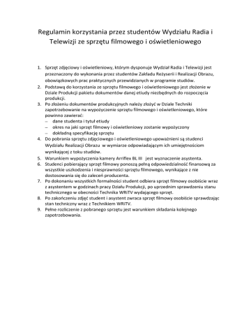 Regulamin korzystania przez studentów Wydziału Radia i Telewizji ze sprzętu filmowego i oświetleniowego 1. Sprzęt zdjęciowy i oświetleniowy, którym dysponuje Wydział Radia i Telewizji jest przeznaczony do wykonania przez studentów Zakładu Reżyserii i Realizacji Obrazu, obowiązkowych prac praktycznych przewidzianych w programie studiów. 2. Podstawą do korzystania ze sprzętu filmowego i oświetleniowego jest złożenie w Dziale Produkcji pakietu dokumentów danej etiudy niezbędnych do rozpoczęcia produkcji. 3. Po złożeniu dokumentów produkcyjnych należy złożyć w Dziale Techniki zapotrzebowanie na wypożyczenie sprzętu filmowego i oświetleniowego, które powinno zawierać: dane studenta i tytuł etiudy okres na jaki sprzęt filmowy i oświetleniowy zostanie wypożyczony dokładną specyfikację sprzętu 4. Do pobrania sprzętu zdjęciowego i oświetleniowego upoważnieni są studenci Wydziału Realizacji Obrazu w wymiarze odpowiadającym ich umiejętnościom wynikającej z toku studiów. 5. Warunkiem wypożyczenia kamery Arriflex BL III jest wyznaczenie asystenta. 6. Studenci pobierający sprzęt filmowy ponoszą pełną odpowiedzialność finansową za wszystkie uszkodzenia i niesprawności sprzętu filmowego, wynikające z nie dostosowania się do zaleceń producenta. 7. Po dokonaniu wszystkich formalności student odbiera sprzęt filmowy osobiście wraz z asystentem w godzinach pracy Działu Produkcji, po uprzednim sprawdzeniu stanu technicznego w obecności Technika WRiTV wydającego sprzęt. 8. Po zakończeniu zdjęć student i asystent zwraca sprzęt filmowy osobiście sprawdzając stan techniczny wraz z Technikiem WRiTV. 9. Pełne rozliczenie z pobranego sprzętu jest warunkiem składania kolejnego zapotrzebowania.