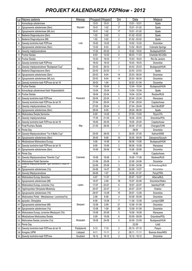 PROJEKT KALENDARZA PZPNow - 2012 Lp Nazwa zadania Miesiąc Dni Data Miejsce 13-01 15-01 2 13.01 - 15.01 Spała 15-01 1-02 17 15.01 - 01.02 Spała 3 Zgrupowanie szkoleniowe (Mł,Jun) 15-01 1-02 17 15.01 - 01.02 Spała 4 Badania Diagnostyczne (Sen) 1-02 3-02 2 01.02 - 03.02 Spała 5 Badania Diagnostyczne (Mł) 1-02 3-02 2 01.02 - 03.02 Spała 10-02 12-02 2 10.02 - 12.02 Drzonków Colorado Springs 1 Konsultacje szkoleniowe 2 Zgrupowanie szkoleniowe (Sen) 6 Zawody kontrolne kadr PZPnow Styczeń Luty Przyjazd Wyjazd 7 Zgrupowanie szkoleniowe (Sen) 13-02 6-03 22 13.02 - 06.03 8 Zawody międzynarodowe 17-02 20-02 3 18.02 - 19.02 Budapeszt/HUN 9 Puchar Świata 6-03 12-03 6 08.03 - 11.03 Charlotte NC/USA 10 Puchar Świata 12-03 19-03 7 15.03 - 18.03 Rio De Janeiro 11 Zawody kontrolne kadr PZPnow 16-03 18-03 2 16.03 - 18.03 Drzonków 12 Zawody międzynarodowe "Budapeszt Cup" 23-03 26-03 3 24.03 - 25.03 Budapeszt/HUN 13 Badania Diagnostyczne (Sen) Marzec 22-03 23-03 1 22.03 - 23.03 Spała 14 Zgrupowanie szkoleniowe (Sen) 25-03 8-04 14 25.03 - 08.04 Drzonków 15 Zgrupowanie szkoleniowe (Mł,Jun) 25-03 8-04 14 25.03 - 08.04 Drzonków 16 Zawody kontrolne kadr PZPnow do lat 16 30-03 1-04 2 30.03 - 01.04 Drzonków 17 Puchar Świata 11-04 16-04 5 12.04 - 15.04 Budapeszt/HUN 18 Konsultacje szkoleniowe Kadr Wojewódzkich 13-04 15-04 2 13.04 - 15.04 Spała 18-04 23-04 5 19.04 - 22.04 Rostów/RUS 20-04 22-04 2 20.04 - 22.04 Warszawa 21 Zawody kontrolne kadr PZPnow do lat 16 27-04 29-04 2 27.04 - 29.04 Częstochowa 22 Zawody międzynarodowe (Ya) 27-04 29-04 2 27.04 - 29.04 Sant Boi/ESP 23 Zgrupowanie szkoleniowe (Sen) 29-04 6-05 7 29.04 - 06.05 Spała 24 Mistrzostwa Świata Seniorów 6-05 14-05 8 07.05 - 13.05 Rzym/ITA 25 Zawody międzynarodowe 17-05 21-05 4 18.05 - 20.05 Drzonków/POL 26 Zawody kontrolne kadr PZPnow do lat 16 18-05 20-05 2 18.05 - 20.05 Częstochowa 21-05 28-05 7 26.05 - 27.05 Chengdu/CHN 26.05 Drzonków 29 Zawody Międzynarodowe "Ya A Baltic Cup" 25-05 28-05 3 26.05 - 27.05 Kalmar/SWE 30 Zgrupowanie szkoleniowe (Sen) 30-05 9-06 10 30.05 - 09.05 Zakopane/Szczyrk 31 Młodzieżowe Mistrzostwa Europy 5-06 14-06 9 06.06 - 13.06 Budapeszt/HUN 32 Zawody kontrolne kadr PZPnow do lat 16 8-06 10-06 2 08.06 - 10.06 Warszawa 33 Zgrupowanie szkoleniowe (Sen) 10-06 29-06 19 10.06 - 29.06 Drzonków 16.06 Częstochowa Moskwa/RUS 19 Puchar Świata 20 Zawody kontrolne kadr PZPnow 27 Finał Pucharu Świata Kwiecień Maj 28 Penta Day 34 Penta Day 35 Zawody Międzynarodowe "Kremlin Cup" Czerwiec 15-06 18-06 3 16.06 - 17.06 36 Mistrzostwa Polski Seniorów Zawody Międzynarodowe "Igor Novikov's Youth A 37 Cup" 38 Zgrupowanie szkoleniowe (Ya) 21-06 25-06 4 22.06 - 24.06 Drzonków 22-06 25-06 3 23.06 - 24.06 St.Petesburg/RUS 24-06 14-07 20 24.06 - 14.07 Drzonków 39 Zawody Międzynarodowe 29-06 1-07 2 30.06 - 01.07 Paryż/FRA 40 Mistrzostwa Europy Seniorów 4-07 11-07 7 05.07 - 10.07 Albena/BUL 41 Zgrupowanie szkoleniowe (Mł) 15-07 2-08 18 15.07 - 02.08 Drzonków/Wałcz Istambuł/TUR 42 Mistrzostwa Europy Juniorów (Ya) Lipiec 17-07 23-07 6 18.07 - 22.07 43 Ogólnopolska Olimpiada Młodzieży 20-07 22-07 2 20.07 - 22.07 Kraków 44 Zgrupowanie szkoleniowe (Yb) 29-07 13-08 15 29.07 - 13.08 Drzonków 45 Mistrzostwa Polski - Młodzieżowe i Juniorów(Ya) 2-08 6-08 4 03.08 - 05.08 Drzonków 46 Igrzyska Olimpijskie 6-08 13-08 7 11.08 - 12.08 Londyn/GBR Drzonków 47 Zgrupowanie szkoleniowe (Mł) Sierpień 12-08 2-09 21 12.08 - 01.09 48 Zgrupowanie szkoleniowe (Ya) 12-08 1-09 20 12.08 - 01.09 Drzonków 49 Mistrzostwa Europy Juniorów Młodszych (Yb) 15-08 20-08 5 16.08 - 19.08 Warszawa 50 Młodzieżowe Mistrzostwa Świata 51 Mstrzostwa Świata Juniorów (Ya) 2-09 10-09 8 03.09 - 09.09 Drzonków/POL Wrzesień 19-09 24-09 5 20.09 - 23.09 Budapeszt/HUN 22.09 Łódź Październik 5-10 7-10 2 05.10 - 07.10 Pasym 52 Penta Day 53 Zawody kontrolne kadr PZPnow do lat 16 54 Kongres UIPM Listopad 9-11 11-11 2 09.11 - 11.11 Buenos Aires/ARG 55 Zawody kontrolne kadr PZPnow Grudzień 16-12 18-12 2 16.12 - 18.12 Drzonków