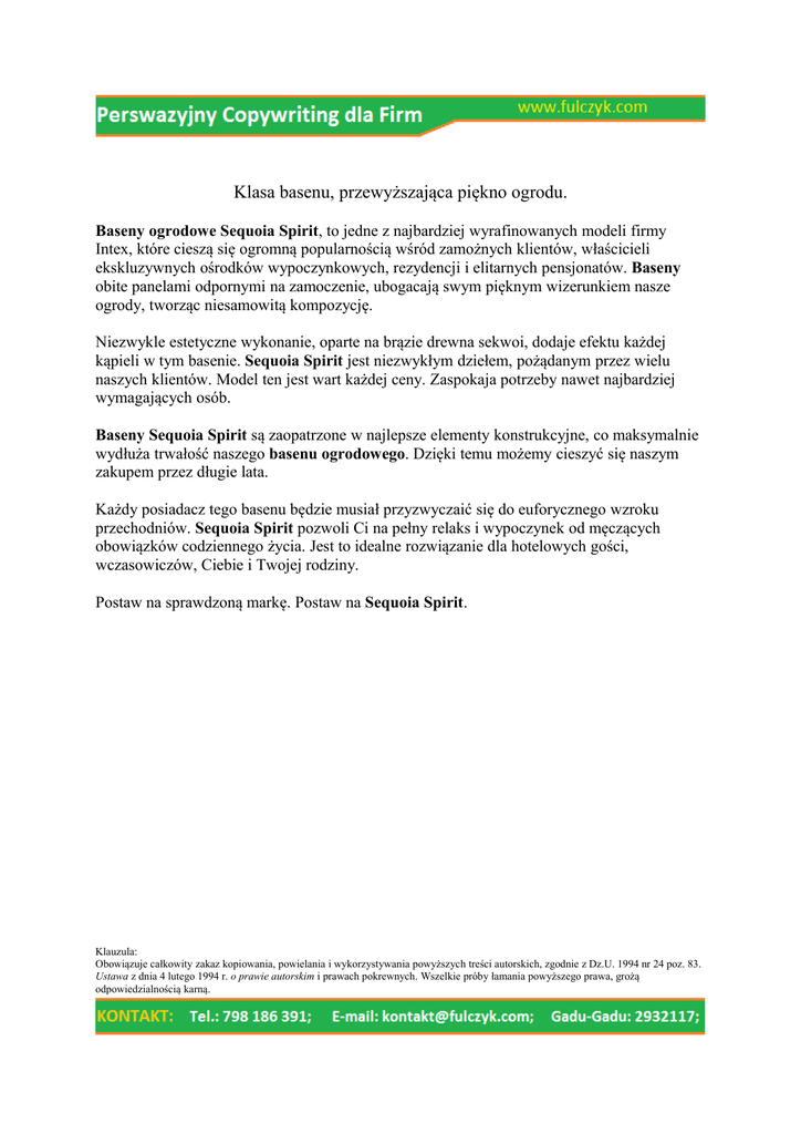 Klasa basenu, przewyższająca piękno ogrodu. Baseny ogrodowe Sequoia Spirit, to jedne z najbardziej wyrafinowanych modeli firmy Intex, które cieszą się ogromną popularnością wśród zamożnych klientów, właścicieli ekskluzywnych ośrodków wypoczynkowych, rezydencji i elitarnych pensjonatów. Baseny obite panelami odpornymi na zamoczenie, ubogacają swym pięknym wizerunkiem nasze ogrody, tworząc niesamowitą kompozycję. Niezwykle estetyczne wykonanie, oparte na brązie drewna sekwoi, dodaje efektu każdej kąpieli w tym basenie. Sequoia Spirit jest niezwykłym dziełem, pożądanym przez wielu naszych klientów. Model ten jest wart każdej ceny. Zaspokaja potrzeby nawet najbardziej wymagających osób. Baseny Sequoia Spirit są zaopatrzone w najlepsze elementy konstrukcyjne, co maksymalnie wydłuża trwałość naszego basenu ogrodowego. Dzięki temu możemy cieszyć się naszym zakupem przez długie lata. Każdy posiadacz tego basenu będzie musiał przyzwyczaić się do euforycznego wzroku przechodniów. Sequoia Spirit pozwoli Ci na pełny relaks i wypoczynek od męczących obowiązków codziennego życia. Jest to idealne rozwiązanie dla hotelowych gości, wczasowiczów, Ciebie i Twojej rodziny. Postaw na sprawdzoną markę. Postaw na Sequoia Spirit. Klauzula: Obowiązuje całkowity zakaz kopiowania, powielania i wykorzystywania powyższych treści autorskich, zgodnie z Dz.U. 1994 nr 24 poz. 83. Ustawa z dnia 4 lutego 1994 r. o prawie autorskim i prawach pokrewnych. Wszelkie próby łamania powyższego prawa, grożą odpowiedzialnością karną.