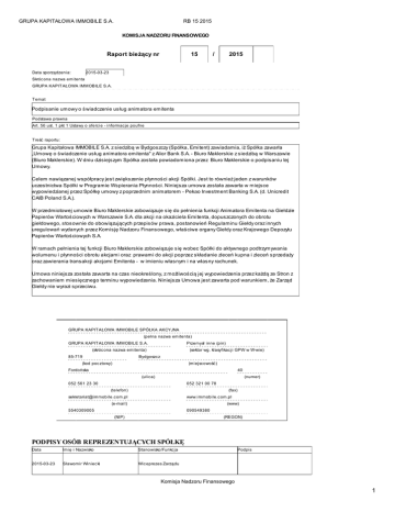 GRUPA KAPITAŁOWA IMMOBILE S.A. RB 15 2015 KOMISJA NADZORU FINANSOWEGO Raport bieżący nr 15 / 2015 2015-03-23 Data sporządzenia: Skróc ona nazwa emitenta GRUPA KAPITAŁOWA IMMOBILE S.A. Temat Podpisanie umowy o świadczenie usług animatora emitenta Podstawa prawna Art. 56 ust. 1 pkt 1 Ustawy o oferc ie - informac je poufne Treść raportu: Grupa Kapitałowa IMMOBILE S.A. z siedzibą w Bydgoszczy (Spółka, Emitent) zawiadamia, iż Spółka zawarła „Umowę o świadczenie usług animatora emitenta" z Alior Bank S.A. - Biuro Maklerskie z siedzibą w Warszawie (Biuro Maklerskie). W dniu dzisiejszym Spółka została powiadomiona przez Biuro Maklerskie o podpisaniu tej Umowy. Celem nawiązanej współpracy jest zwiększenie płynności akcji Spółki. Jest to również jeden z warunków uczestnictwa Spółki w Programie Wspierania Płynności. Niniejsza umowa została zawarta w miejsce wypowiedzianej przez Spółkę umowy z poprzednim animatorem - Pekao Investment Banking S.A. (d. Unicredit CAIB Poland S.A.). W przedmiotowej umowie Biuro Maklerskie zobowiązuje się do pełnienia funkcji Animatora Emitenta na Giełdzie Papierów Wartościowych w Warszawie S.A. dla akcji na okaziciela Emitenta, dopuszczonych do obrotu giełdowego, stosownie do obowiązujących przepisów prawa, postanowień Regulaminu Giełdy oraz innych uregulowań wydanych przez Komisję Nadzoru Finansowego, właściwe organy Giełdy oraz Krajowego Depozytu Papierów Wartościowych S.A. W ramach pełnienia tej funkcji Biuro Maklerskie zobowiązuje się wobec Spółki do aktywnego podtrzymywania wolumenu i płynności obrotu akcjami oraz prawami do akcji poprzez składanie zleceń kupna i zleceń sprzedaży oraz zawierania transakcji akcjami Emitenta - w imieniu własnym i na własny rachunek. Umowa niniejsza została zawarta na czas nieokreślony, z możliwością jej wypowiedzenia przez każdą ze Stron z zachowaniem miesięcznego terminu wypowiedzenia. Niniejsza Umowa jest zawarta pod warunkiem, że Zarząd Giełdy nie wyrazi sprzeciwu. GRUPA KAPITAŁOWA IMMOBILE SPÓŁKA AKCYJNA (pełna nazwa emitenta) GRUPA KAPITAŁOWA IMMOBILE S.A. Przemysł inne (pin) (skróc ona nazwa emitenta) 85-719 (sektor wg. klasyfikac ji GPW w W-wie) Bydgoszcz (kod poc ztowy) (miejscowość) Fordońska 40 (ulica) (numer) 052 561 23 30 052 321 00 78 (telefon) (fax) [email protected] www.immobile.c om.pl (e-mail) (www) 5540309005 090549380 (NIP) (REGON) PODPISY OSÓB REPREZENTUJĄCYCH SPÓŁKĘ Data Imię i Nazwisko Stanowisko/Funkc ja 2015-03-23 Sławomir Winiecki Wic eprezes Zarządu Podpis Komisja Nadzoru Finansowego 1 GRUPA KAPITAŁOWA IMMOBILE S.A. 2015-03-23 Piotr Fortuna RB 15 2015 Członek Zarządu Komisja Nadzoru Finansowego 2