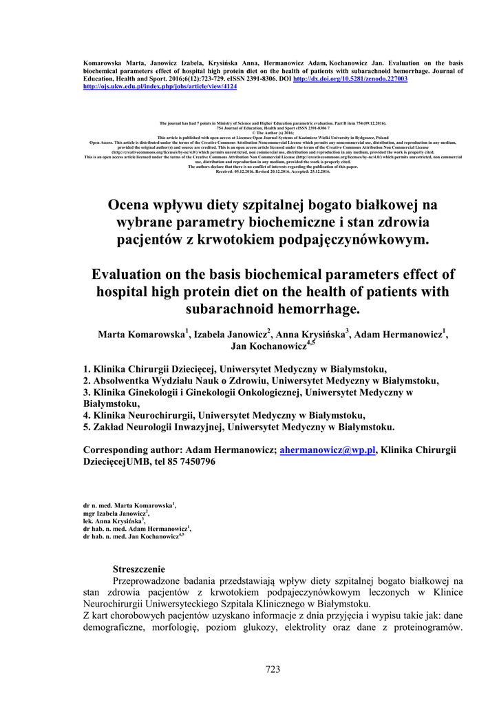 Komarowska Marta, Janowicz Izabela, Krysińska Anna, Hermanowicz Adam, Kochanowicz Jan. Evaluation on the basis biochemical parameters effect of hospital high protein diet on the health of patients with subarachnoid hemorrhage. Journal of Education, Health and Sport. 2016;6(12):723-729. eISSN 2391-8306. DOI http://dx.doi.org/10.5281/zenodo.227003 http://ojs.ukw.edu.pl/index.php/johs/article/view/4124 The journal has had 7 points in Ministry of Science and Higher Education parametric evaluation. Part B item 754 (09.12.2016). 754 Journal of Education, Health and Sport eISSN 2391-8306 7 © The Author (s) 2016; This article is published with open access at Licensee Open Journal Systems of Kazimierz Wielki University in Bydgoszcz, Poland Open Access. This article is distributed under the terms of the Creative Commons Attribution Noncommercial License which permits any noncommercial use, distribution, and reproduction in any medium, provided the original author(s) and source are credited. This is an open access article licensed under the terms of the Creative Commons Attribution Non Commercial License (http://creativecommons.org/licenses/by-nc/4.0/) which permits unrestricted, non commercial use, distribution and reproduction in any medium, provided the work is properly cited. This is an open access article licensed under the terms of the Creative Commons Attribution Non Commercial License (http://creativecommons.org/licenses/by-nc/4.0/) which permits unrestricted, non commercial use, distribution and reproduction in any medium, provided the work is properly cited. The authors declare that there is no conflict of interests regarding the publication of this paper. Received: 05.12.2016. Revised 20.12.2016. Accepted: 25.12.2016. Ocena wpływu diety szpitalnej bogato białkowej na wybrane parametry biochemiczne i stan zdrowia pacjentów z krwotokiem podpajęczynówkowym. Evaluation on the basis biochemical parameters effect of hospital high protein diet on the health of patients with subarachnoid hemorrhage. Marta Komarowska1, Izabela Janowicz2, Anna Krysińska3, Adam Hermanowicz1, Jan Kochanowicz4,5 1. Klinika Chirurgii Dziecięcej, Uniwersytet Medyczny w Białymstoku, 2. Absolwentka Wydziału Nauk o Zdrowiu, Uniwersytet Medyczny w Białymstoku, 3. Klinika Ginekologii i Ginekologii Onkologicznej, Uniwersytet Medyczny w Białymstoku, 4. Klinika Neurochirurgii, Uniwersytet Medyczny w Białymstoku, 5. Zakład Neurologii Inwazyjnej, Uniwersytet Medyczny w Białymstoku. Corresponding author: Adam Hermanowicz; [email protected], Klinika Chirurgii DziecięcejUMB, tel 85 7450796 dr n. med. Marta Komarowska1, mgr Izabela Janowicz2, lek. Anna Krysińska3, dr hab. n. med. Adam Hermanowicz1, dr hab. n. med. Jan Kochanowicz4,5 Streszczenie Przeprowadzone badania przedstawiają wpływ diety szpitalnej bogato białkowej na stan zdrowia pacjentów z krwotokiem podpajeczynówkowym leczonych w Klinice Neurochirurgii Uniwersyteckiego Szpitala Klinicznego w Białymstoku. Z kart chorobowych pacjentów uzyskano informacje z dnia przyjęcia i wypisu takie jak: dane demograficzne, morfologię, poziom glukozy, elektrolity oraz dane z proteinogramów. 723 Ponadto oceniono dekadowy jadłospis diety szpitalnej bogatobiałkowej. Na końcu przedstawiono wnioski wynikające z powyższych analiz. Słowa kluczowe: dieta szpitalna bogato białkowa, jadłospis dekadowy, krwotok podpajęczynówkowy. Abstract The studies show influence of protein-rich hospital diet on health condition of the patient with subarachnoid hemorrhage treated at the Department of Neurosurgery in Medical University in Bialystok. The analysis was made retrospectively. We obtain all data from the day of the admission and discharge day. The data included demographic data, blood count, glucose level, electrolytes and blood protein level. We also analyzed the hospital protein rich average menu since ten years. Key words: protein-reach diet, decade diet menu, subarachnoid hemorrhage Wstęp Stosowanie odpowiedniego rodzaju diety we wszystkich schorzeniach od dawna ma kluczowe znaczenie w poprawie stanu zdrowia pacjentów. Do tej pory skuteczność diety wysokobiałkowej była potwierdzona po zabiegach w obrębie różnych narządów. Nie badano jednak jej wpływu na stan zdrowia pacjentów po krwotoku podpajęczynówkowym. Krwotok podpajęczynówkowy (SAH) jest specyficznym rodzajem udaru krwotocznego. Stanowi około 10–12% wszystkich śródczaszkowych incydentów naczyniowych. Częstość jego występowania wynosi 6–7 osób/100000 / rok [1, 2]. Krwawienie podpajęczynówkowe dotyka przeważnie pacjentów w średnim wieku (50. r. życia), a bardziej predysponowane są kobiety. Choroba ta, dotycząca 2–8% populacji, mimo postępu diagnostyki oraz metod operacyjnych i embolizacyjnych, wciąż niejednokrotnie wiąże się ze złym rokowaniem dla pacjenta. Według statystyk tętniaki tętnic mózgowych i malformacje tętniczo-żylne znacznie zwiększają ryzyko krwotoku, gdyż w schorzeniach tych wykazano zaburzenia w budowie ścian naczyń krwionośnych, które są, w tych miejscach, bardziej podatne na pęknięcie [3,4,5]. Ryzyko krwotoku zwiększa się dodatkowo u osób z nadciśnieniem tętniczym, miażdżycą i chorobami prowadzącymi do zaburzeń krzepnięcia krwi np. białaczka [3]. Pacjenci z krwawieniem podpajeczynówkowym poddawani leczeniu operacyjnemu są w grupie wysokiego ryzyka, jeśli chodzi o niedobór białka. Mają na to wpływ deficyty neurologiczne utrudniające spożywanie posiłków, zwiększone zapotrzebowanie wynikające z choroby jak i stosowane w leczeniu procedury operacyjne. Dodatkowo zabieg operacyjny wiąże się ze znacznym stresem i uszkodzeniem tkanek organizmu. Dlatego cały czas jest aktualne pytanie czy pacjent poddany zabiegowi operacyjnemu dostaje w okresie pooperacyjnym z posiłkiem właściwą dawkę substancji odżywczych? Ten niedoceniany jak dotąd problem był podstawą do przeprowadzenia badań potwierdzających lub 