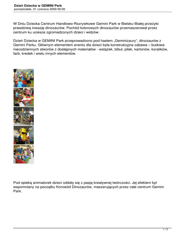 Dzień Dziecka w GEMINI Park poniedziałek, 01 czerwca 2009 00:00 W Dniu Dziecka Centrum Handlowo-Rozrywkowe Gemini Park w Bielsku-Białej przeżyło prawdziwą inwazję dinozaurów. Pochód kolorowych dinozaurów przemaszerował przez centrum ku uciesze zgromadzonych dzieci i widzów. Dzień Dziecka w GEMINI Park przeprowadzono pod hasłem „Geminizaury”, dinozaurów z Gemini Parku. Głównym elementem eventu dla dzieci była konstrukcyjna zabawa – budowa niecodziennych stworów z dostępnych materiałów - wstążek, bibuł, piłek, kartonów, koralików, farb, kredek i wielu innych elementów. Pod opieką animatorek dzieci oddały się z pasją kreatywnej twórczości. Jej efektem był wspomniany na początku Korowód Dinozaurów, maszerujących przez całe centrum Gemini Park. 1/2 Dzień Dziecka w GEMINI Park poniedziałek, 01 czerwca 2009 00:00 WZdjęcia: mogły brać ramach udział także atrakcji wspróbować poszukiwaniach przeprowadzone zrobić ukrytego maskę były dinozaura, jaja także dinozaura. zabawy współtworzyć olbrzymi Wszystkie komiks o chętne dinozaurach, dzieci Całość zorganizowała i przeprowadziła ACTIGRA Eventzręcznościowe. (ACTIGRA Group). ACTIGRA Foto 2/2