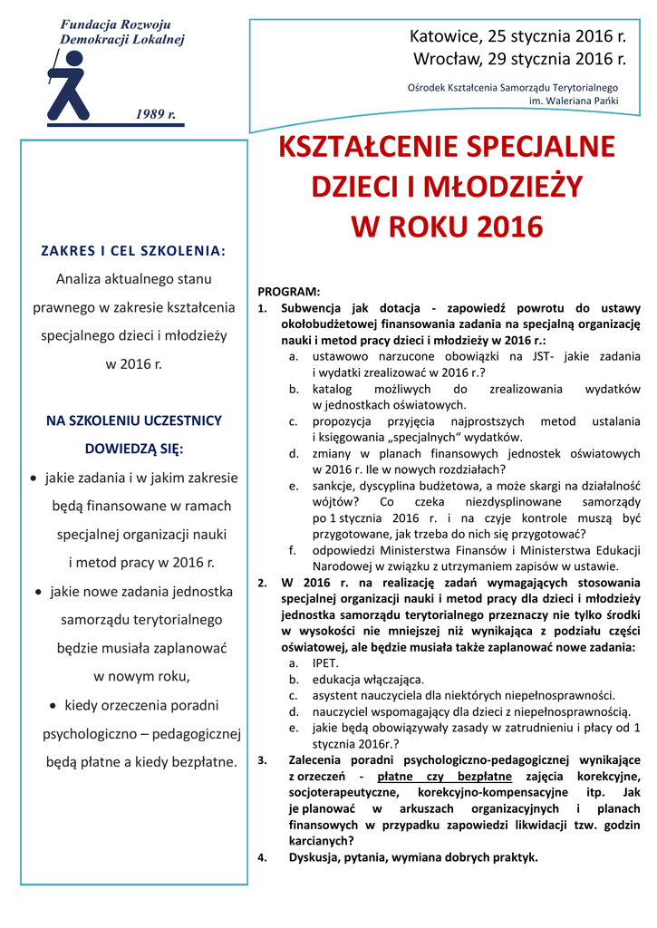 25 stycznia 2016 r. Rozwiązania Katowice, informatyczne Wrocław, 29 stycznia 2016 r. Ośrodek Kształcenia Samorządu Terytorialnego im. Waleriana Pańki ZAKRES I CEL SZKOLENIA: Analiza aktualnego stanu prawnego w zakresie kształcenia specjalnego dzieci i młodzieży w 2016 r. NA SZKOLENIU UCZESTNICY DOWIEDZĄ SIĘ: jakie zadania i w jakim zakresie będą finansowane w ramach specjalnej organizacji nauki i metod pracy w 2016 r. jakie nowe zadania jednostka samorządu terytorialnego będzie musiała zaplanować w nowym roku, kiedy orzeczenia poradni psychologiczno – pedagogicznej będą płatne a kiedy bezpłatne. KSZTAŁCENIE SPECJALNE DZIECI I MŁODZIEŻY W ROKU 2016 PROGRAM: 1. Subwencja jak dotacja - zapowiedź powrotu do ustawy okołobudżetowej finansowania zadania na specjalną organizację nauki i metod pracy dzieci i młodzieży w 2016 r.: a. ustawowo narzucone obowiązki na JST- jakie zadania i wydatki zrealizować w 2016 r.? b. katalog możliwych do zrealizowania wydatków w jednostkach oświatowych. c. propozycja przyjęcia najprostszych metod ustalania i księgowania „specjalnych“ wydatków. d. zmiany w planach finansowych jednostek oświatowych w 2016 r. Ile w nowych rozdziałach? e. sankcje, dyscyplina budżetowa, a może skargi na działalność wójtów? Co czeka niezdysplinowane samorządy po 1 stycznia 2016 r. i na czyje kontrole muszą być przygotowane, jak trzeba do nich się przygotować? f. odpowiedzi Ministerstwa Finansów i Ministerstwa Edukacji Narodowej w związku z utrzymaniem zapisów w ustawie. 2. W 2016 r. na realizację zadań wymagających stosowania specjalnej organizacji nauki i metod pracy dla dzieci i młodzieży jednostka samorządu terytorialnego przeznaczy nie tylko środki w wysokości nie mniejszej niż wynikająca z podziału części oświatowej, ale będzie musiała także zaplanować nowe zadania: a. IPET. b. edukacja włączająca. c. asystent nauczyciela dla niektórych niepełnosprawności. d. nauczyciel wspomagający dla dzieci z niepełnosprawnością. e. jakie będą obowiązywały zasady w zatrudnieniu i płacy od 1 stycznia 2016r.? 3. Zalecenia poradni psychologiczno-pedagogicznej wynikające z orzeczeń - płatne czy bezpłatne zajęcia korekcyjne, socjoterapeutyczne, korekcyjno-kompensacyjne itp. Jak je planować w arkuszach organizacyjnych i planach finansowych w przypadku zapowiedzi likwidacji tzw. godzin karcianych? 4. Dyskusja, pytania, wymiana dobrych praktyk. SZKOLENIE SKIEROWANE DO: Osób odpowiedzialnych w szkołach i gimnazjach za rozliczanie subwencji, w tym dyrektorów i księgowych szkół podstawowych i gimnazjów, osób odpowiedzialnych w urzędach gmin, starostwach powiatowych, jednostkach obsługi finansowej placówek oświatowych za rozliczanie subwencji w tym naczelników wydziałów oświaty, dyrektorów i głównych księgowych tzw. ZESAÓW. DANE DO KONTAKTU: Ośrodek Kształcenia Samorządu Terytorialnego im. Waleriana Pańki 40-014 Katowice ul. Mariacka 1 MIEJSCE SZKOLENIA: Katowice, siedziba Ośrodka, ul. Mariacka 1 (II piętro). Wrocław, siedziba Ośrodka, ul. Piłsudskiego 49- 57, (III piętro). TERMIN I GODZINA: Katowice: 25 stycznia 2016 r., godz. 10.00 – 15.00. Wrocław: 29 stycznia 2016 r., godz.10.00 – 15.00 CENA: 339 zł netto/os. Udział w szkoleniu zwolniony z VAT w przypadku finansowania szkolenia ze środków publicznych. Cena zawiera materiały szkoleniowe, zaświadczenie o ukończeniu szkolenia, poczęstunek i serwis kawowy. ZGŁOSZENIA: Wypełnioną kartę zgłoszenia należy przesłać mailem lub faksem do 26 stycznia 2016 r. (Wrocław) do 20 stycznia 2016 r. (Katowice). Uwaga: Liczba miejsc ograniczona. Brak pisemnej rezygnacji ze szkolenia najpóźniej na 3 dni przed terminem będzie równoznaczny z obciążeniem Państwa należnością za to szkolenie. NIP 522-000-18-95 tel/fax. 32 259 86 73, 32 253 84 09 e-mail: [email protected] www.okst.pl OSOBA DO KONTAKTU: Ewa Pytasz, tel. 32 206 98 43 w. 23, [email protected] Karta zgłoszenia – kod szkolenia: Wrocław: 195/16D/E Katowice 194/16/E Nazwa Nabywcy (dane do FVAT):.................................................................................………………………………………… Ulica: ........................................... Miejscowość…………………..………………kod pocztowy………….….………………………. NIP: ............................................................. Tel......................................…………e-mail………………………..……………… 1. ............................................................................................................................................................................. imię i nazwisko, (wypełnić drukowanymi) wydział/ stanowisko 2............................................................................................................................................................................... imię i nazwisko, (wypełnić drukowanymi) wydział/ stanowisko Oświadczam, że szkolenie dla ww. pracowników jest kształceniem zawodowym finansowanym w całości lub co najmniej 70% ze środków publicznych (właściwe zaznaczyć) TAK / NIE ......…………………………………. Podpis UWAGA! Ilość miejsc ograniczona. O udziale w szkoleniu decyduje kolejność zgłoszeń. Zgłoszenie na szkolenie musi zostać potwierdzone przesłaniem do Ośrodka karty zgłoszenia. Brak pisemnej rezygnacji ze szkolenia najpóźniej na trzy dni przed terminem będzie równoznaczny z obciążeniem Państwa należnością za to szkolenie. Należność należy płacić przelewem 3 dni przed szkoleniem (na przelewie prosimy podać nazwę szkolenia lub jego numer). NR RACHUNKU: BPH: 68-10600076-0000321000197618