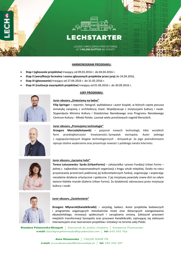 HARMONOGRAM PROGRAMU: Etap I (zgłaszanie projektów) trwający od 09.03.2016 r. do 04.04.2016 r. Etap II (weryfikacja formalna i ocena zgłoszonych projektów przez jury) do 24.04.2016, Etap III (głosowanie) trwający od 27.04.2016 r. do 31.05.2016 r. Etap IV (realizacja zwycięskich projektów) trwający od 01.06.2016 r. do 30.09.2016 r. JURY PROGRAMU: Juror obszaru „Zmieniamy na ładne” Filip Springer – reporter, fotograf, wykładowca i autor książek, w których często porusza tematykę związaną z architekturą miast. Współpracuje z instytucjami kultury i nauki. Stypendysta Ministra Kultury i Dziedzictwa Narodowego oraz Programu Narodowego Centrum Kultury - Młoda Polska. Laureat wielu prestiżowych nagród literackich. Juror obszaru „Promujemy technologie” Grzegorz Marczak(Antyweb) – pasjonat nowych technologii, kibic wszelkich form przedsiębiorczości kreatywności. Sympatyk startupów. Autor jednego z najpopularniejszych blogów technologicznych - Antyweb.pl. Za jego pośrednictwem opisuje istotne wydarzenia oraz prezentuje nowości z polskiego świata Internetu. Juror obszaru „Łączymy ludzi” Teresa Latuszewska- Syrda (UrbanForms) – założycielka i prezes Fundacji Urban Forms – jednej z najbardziej rozpoznawalnych organizacji z kręgu sztuki miejskiej. Działa na rzecz przywracania przestrzeni publicznej jej kulturotwórczych funkcji, organizując i wspierając niezależne działania artystyczne i społeczne. Z jej inicjatywy powstały znane dziś na całym świecie łódzkie murale (Galeria Urban Forms). Za działalność odznaczana przez instytucje kultury i nauki. Juror obszaru „Zazielenianie” Grzegorz Młynarski(Kwiatkibratki) – socjolog, badacz. Autor projektów badawczych i programów angażujących mieszkańców miast oraz dotyczących zaangażowania obywatelskiego, innowacji społecznych i zarządzania zmianą. Założyciel pracowni miejskich transformacji Sociopolis oraz pracowni Kwiatkibratki, zajmującej się zielonymi interwencjami oraz tworzeniem projektów i instalacji na terenie całej Polski. Klaudyna Polanowska-Skrzypek | Kierownik ds. public relations | Kompania Piwowarska e-mail: [email protected] | tel: 695 592 926 Anna Staszewska | TAILOR MADE PR e-mail: [email protected] | tel: 534 882 537