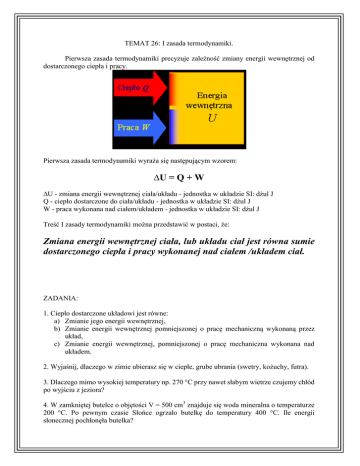 TEMAT 26: I zasada termodynamiki. Pierwsza zasada termodynamiki precyzuje zależność zmiany energii wewnętrznej od dostarczonego ciepła i pracy. Pierwsza zasada termodynamiki wyraża się następującym wzorem: ∆U = Q + W ∆U - zmiana energii wewnętrznej ciała/układu - jednostka w układzie SI: dżul J Q - ciepło dostarczone do ciała/układu - jednostka w układzie SI: dżul J W - praca wykonana nad ciałem/układem - jednostka w układzie SI: dżul J Treść I zasady termodynamiki można przedstawić w postaci, że: Zmiana energii wewnętrznej ciała, lub układu ciał jest równa sumie dostarczonego ciepła i pracy wykonanej nad ciałem /układem ciał. ZADANIA: 1. Ciepło dostarczone układowi jest równe: a) Zmianie jego energii wewnętrznej, b) Zmianie energii wewnętrznej pomniejszonej o pracę mechaniczną wykonaną przez układ, c) Zmianie energii wewnętrznej, pomniejszonej o pracę mechaniczna wykonana nad układem. 2. Wyjaśnij, dlaczego w zimie ubierasz się w ciepłe, grube ubrania (swetry, kożuchy, futra). 3. Dlaczego mimo wysokiej temperatury np. 270 °C przy nawet słabym wietrze czujemy chłód po wyjściu z jeziora? 4. W zamkniętej butelce o objętości V = 500 cm3 znajduje się woda mineralna o temperaturze 200 °C. Po pewnym czasie Słońce ogrzało butelkę do temperatury 400 °C. Ile energii słonecznej pochłonęła butelka?