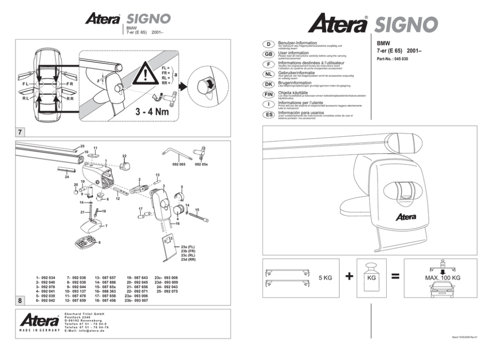 SIGNO BMW 7-er (E 65) SIGNO 2001– D GB FL a FR RL FL = FR = RL = RR = F a RR 3 - 4 Nm BMW 7-er (E 65) 2001– Benutzer-Information Vor Gebrauch des Trägersystems/Zubehörs sorgfältig und vollständig lesen! User information Please read all instructions carefully before using the carrying system/accessories! Part-No. : 045 030 Informations destinées à l’utilisateur Veuillez lire soigneusement toutes les instructions avant l’utilisation du système de porte-charges/des accessoires! NL Gebruikerinformatie DK Brugerinformation FIN Ohjeita käyttälle Voor gebruik van het dragersysteem en/of de accessoires zorgvuldig en volledig lezen! Læs betjeningsvejledningen grundigt igennem inden ibrugtagning. Lue ohje huolellisesti ja kokonaan ennen kattotelinejärjestelmän/lisävarusteiden käyttöönottoa. I Informatione per l’utente ES Información para usarios Prima dell’uso del sistema di trasporto/dell’accessorio leggere attentamente tutte le indicazioni! ¡Leer cuidadosamente las instrucciones completas antes de usar el sistema portador / los accesorios! 7 25 11 10 22 1 092 065 092 05x 13 24 20 2 19 3 5 9 6 12 14 14 17 18 21 15 4 16 7 8 23a (FL) 23b (FR) 23c (RL) 23d (RR) KG 8 123456- 092 034 092 040 092 078 092 041 092 039 092 042 789101112- 092 036 092 038 092 044 093 137 087 478 087 659 131415161718- 087 657 087 886 087 65x 088 363 087 658 087 456 1920212223a23b- 087 643 092 045 087 656 092 071 093 006 093 007 23c23d2425- 093 008 093 009 092 043 092 075 5 KG + KG = MAX. 100 KG Eberhard Tittel GmbH Postfach 2240 D-88192 Ravensburg Te l e f o n 0 7 5 1 - 7 6 0 4 - 0 Te l e f a x 0 7 5 1 - 7 6 0 4 - 7 6 E-Mail: [email protected] Stand 15/05/2006 Rev.01 SIGNO BMW 7-er (E 65) 1 SIGNO BMW 7-er (E 65) 2001– FL FR RL RR 2001– A 2 FL = FR = RL = RR = 1064 mm FL A A FR 5 FL FR RL RR 1048 mm RR RL 2 3 B ? RR FR FL FR RL RR c b=c e=0 d=0 b ? 1 RL 2 FL ≈ 6 Nm 4 1 6