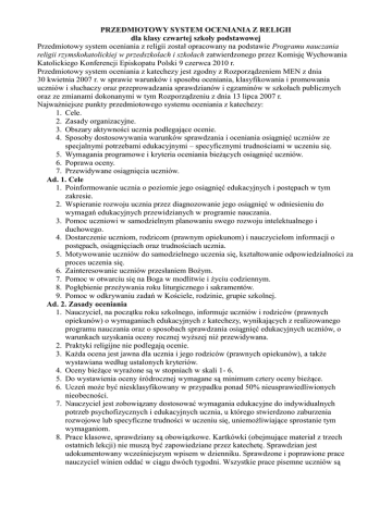 PRZEDMIOTOWY SYSTEM OCENIANIA Z RELIGII dla klasy czwartej szkoły podstawowej Przedmiotowy system oceniania z religii został opracowany na podstawie Programu nauczania religii rzymskokatolickiej w przedszkolach i szkołach zatwierdzonego przez Komisję Wychowania Katolickiego Konferencji Episkopatu Polski 9 czerwca 2010 r. Przedmiotowy system oceniania z katechezy jest zgodny z Rozporządzeniem MEN z dnia 30 kwietnia 2007 r. w sprawie warunków i sposobu oceniania, klasyfikowania i promowania uczniów i słuchaczy oraz przeprowadzania sprawdzianów i egzaminów w szkołach publicznych oraz ze zmianami dokonanymi w tym Rozporządzeniu z dnia 13 lipca 2007 r. Najważniejsze punkty przedmiotowego systemu oceniania z katechezy: 1. Cele. 2. Zasady organizacyjne. 3. Obszary aktywności ucznia podlegające ocenie. 4. Sposoby dostosowywania warunków sprawdzania i oceniania osiągnięć uczniów ze specjalnymi potrzebami edukacyjnymi – specyficznymi trudnościami w uczeniu się. 5. Wymagania programowe i kryteria oceniania bieżących osiągnięć uczniów. 6. Poprawa oceny. 7. Przewidywane osiągnięcia uczniów. Ad. 1. Cele 1. Poinformowanie ucznia o poziomie jego osiągnięć edukacyjnych i postępach w tym zakresie. 2. Wspieranie rozwoju ucznia przez diagnozowanie jego osiągnięć w odniesieniu do wymagań edukacyjnych przewidzianych w programie nauczania. 3. Pomoc uczniowi w samodzielnym planowaniu swego rozwoju intelektualnego i duchowego. 4. Dostarczenie uczniom, rodzicom (prawnym opiekunom) i nauczycielom informacji o postępach, osiągnięciach oraz trudnościach ucznia. 5. Motywowanie uczniów do samodzielnego uczenia się, kształtowanie odpowiedzialności za proces uczenia się. 6. Zainteresowanie uczniów przesłaniem Bożym. 7. Pomoc w otwarciu się na Boga w modlitwie i życiu codziennym. 8. Pogłębienie przeżywania roku liturgicznego i sakramentów. 9. Pomoc w odkrywaniu zadań w Kościele, rodzinie, grupie szkolnej. Ad. 2. Zasady oceniania 1. Nauczyciel, na początku roku szkolnego, informuje uczniów i rodziców (prawnych opiekunów) o wymaganiach edukacyjnych z katechezy, wynikających z realizowanego programu nauczania oraz o sposobach sprawdzania osiągnięć edukacyjnych uczniów, o warunkach uzyskania oceny rocznej wyższej niż przewidywana. 2. Praktyki religijne nie podlegają ocenie. 3. Każda ocena jest jawna dla ucznia i jego rodziców (prawnych opiekunów), a także wystawiana według ustalonych kryteriów. 4. Oceny bieżące wyrażone są w stopniach w skali 1- 6. 5. Do wystawienia oceny śródrocznej wymagane są minimum cztery oceny bieżące. 6. Uczeń może być niesklasyfikowany w przypadku ponad 50% nieusprawiedliwionych nieobecności. 7. Nauczyciel jest zobowiązany dostosować wymagania edukacyjne do indywidualnych potrzeb psychofizycznych i edukacyjnych ucznia, u którego stwierdzono zaburzenia rozwojowe lub specyficzne trudności w uczeniu się, uniemożliwiające sprostanie tym wymaganiom. 8. Prace klasowe, sprawdziany są obowiązkowe. Kartkówki (obejmujące materiał z trzech ostatnich lekcji) nie muszą być zapowiedziane przez katechetę. Sprawdzian jest udokumentowany wcześniejszym wpisem w dzienniku. Sprawdzone i poprawione prace nauczyciel winien oddać w ciągu dwóch tygodni. Wszystkie prace pisemne uczniów są przechowywane do końca roku szkolnego. 9. Uczeń jest zobowiązany do prowadzenia i noszenia noszenia zeszytu i katechizmu przedmiotowego oraz do systematycznego odrabiania prac domowych. 10. Sprawdziany wiedzy odbywają się minimum raz w semestrze i są zapowiadane z tygodniowym wyprzedzeniem. Sprawdziany są obowiązkowe, jeśli uczeń w tym czasie był nieobecny na lekcji, powinien zaliczyć sprawdzian w terminie późniejszym, uzgodnionym z nauczycielem. 11. W przypadku nieobecności uczeń ma obowiązek uzupełnić braki w ciągu 2 tygodni od powrotu do szkoły. 12. W przypadku wystąpienia poważnych przyczyn losowych, które przeszkodziły w przygotowaniu się ucznia do lekcji, uczeń nie ponosi żadnych konsekwencji, jeżeli są one potwierdzone pisemnie lub ustnie przez rodzica (opiekuna) przed lekcją. 13. Zgodnie z Wewnątrzszkolnym Systemem Oceniania i na określonych w nim zasadach uczeń może skorzystać ze zwolnienia z odpowiedzi ustnej (np. tzw. ,,szczęśliwy numerek” i innych form przyjętych w danej szkole), nie dotyczy to zapowiedzianych sprawdzianów. 14. Jeśli uczeń ma trudności w opanowaniu materiału, ma prawo do pomocy ze strony nauczyciela lub innego ucznia. Warunkiem jest aktywna obecność na lekcjach lub usprawiedliwiona dłuższa nieobecność. 15. O ocenie niedostatecznej śródrocznej czy rocznej uczeń informowany jest ustnie, a jego rodzice (prawni opiekunowie) w formie pisemnej na miesiąc przed radą pedagogiczną klasyfikacyjną. Za pisemne poinformowanie rodzica (prawnego opiekuna) odpowiada wychowawca. Szczegółowe postępowanie określa Wewnątrzszkolny System Oceniania. 16. Na 7 dni przed posiedzeniem klasyfikacyjnym rady pedagogicznej uczniowie są informowani o przewidywanych ocenach śródrocznych lub rocznych. 17. Kryteria odpowiadające poszczególnym śródrocznym i rocznym stopniom szkolnym są zgodne Wewnątrzszkolnym Systemem Oceniania. Ad. 3. Obszary aktywności ucznia podlegające ocenie 1. Wiadomości i umiejętności określone w programie nauczania: – Formy ustne: odpowiedzi ustne, opowiadania odtwórcze i twórcze, dialog. – Formy pisemne: sprawdziany, testy, kartkówki, zadania domowe, ćwiczenia wykonane na lekcji. – Poprawne stosowanie podstawowych pojęć religijnych. – Rozumienie znaczenia poznanych zagadnień i zastosowanie ich w praktyce. – Łączenie elementów wiedzy z życiem. 2. Aktywność na lekcji: – Zainteresowanie tematem katechezy. – Kreatywność, inicjatywa. – Pilność, samodyscyplina. – Współpraca w zespole. 3. Przygotowanie do katechezy, prowadzenie zeszytu: – Staranne i estetyczne prowadzenie zeszytu przedmiotowego. 4. Pr