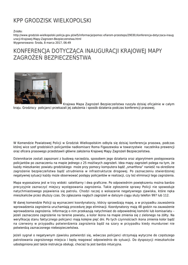 KPP GRODZISK WIELKOPOLSKI Źródło: http://www.grodzisk-wielkopolski.policja.gov.pl/wl5/informacje/pomoc-ofiarom-przesteps/29030,Konferencja-dotyczaca-inaug uracji-Krajowej-Mapy-Zagrozen-Bezpieczenstwa.html Wygenerowano: Środa, 8 marca 2017, 06:49 KONFERENCJA DOTYCZĄCA INAUGURACJI KRAJOWEJ MAPY ZAGROŻEŃ BEZPIECZEŃSTWA Krajowa Mapa Zagrożeń Bezpieczeństwa ruszyła dzisiaj oficjalnie w całym kraju. Grodziscy policjanci przekazali jej założenia i sposób działania podczas konferencji prasowej. W Komendzie Powiatowej Policji w Grodzisk Wielkopolskim odbyła się dzisiaj konferencja prasowa, podczas której wice szef grodziskich policjantów nadkomisarz Roma Figaszewska w towarzystwie naczelnika prewencji oraz oficera prasowego przedstawili główne założenia Krajowej Mapy Zagrożeń Bezpieczeństwa. Dziennikarze zostali zapoznani z budową narzędzia, sposobem jego działania oraz algorytmem postępowania policjantów po zaznaczeniu na mapie jednego z 25 możliwych zagrożeń. Idea mapy zagrożeń polega na tym, że każdy mieszkaniec powiatu grodziskiego może przy pomocy komputera bądź „smartfona” nanieść na określone zagrożenie bezpieczeństwa bądź utrudnienia w infrastrukturze drogowej. Po zaznaczeniu stwierdzonej negatywnej sytuacji każdy może obserwować postępy policjantów w realizacji, czy też eliminacji tego zagrożenia. Mapa wyposażona jest w trzy widoki: satelitarny i dwa graficzne. Po odpowiednim powiększeniu można bardzo precyzyjnie zaznaczyć miejscy występowania zagrożenia. Takie zgłoszenie sprawy Policji nie spowoduje natychmiastowego pojawienia się patrolu. Chodzi raczej o wskazanie negatywnego zjawiska, które nęka mieszkańców przez dłuższy czas. Do zgłaszania nagłych zagrożeń w dalszym ciągu służy telefon 997 lub 112. W danej komendzie Policji są wyznaczeni koordynatorzy, którzy sprawdzają mapę, a w przypadku zauważenia wprowadzenia zagrożenia uruchamiają procedurę jego eliminacji. Koordynatorzy mają 48 godzin na zauważenie wprowadzenia zagrożenia. Informację o nim przekazują natychmiast do odpowiedniej komórki lub komisariatu – jeżeli zaznaczono zagrożenie na terenie powiatu, a kolor ikona na mapie zmienia się z zielonego na żółty. Na weryfikację stanu faktycznego policjanci mają kolejne pięć dni. Po tych czynnościach ikona zmienia kolor bądź na czerwony w przypadku potwierdzenia zagrożenia bądź na szary w przypadku kiedy mundurowi nie potwierdzą zaznaczonego niebezpieczeństwa. Jeżeli sygnał o negatywnym zjawisku potwierdzi się, wówczas policjanci otrzymają wytyczne do częstszego patrolowania zagrożonego miejsca i będą reagować odpowiednio do sytuacji. Do dyspozycji mieszkańców udostępniona jest także instrukcja obsługi, chociaż ta jest bardzo intuicyjna. Ocena: 0/5 (0) Tweetnij