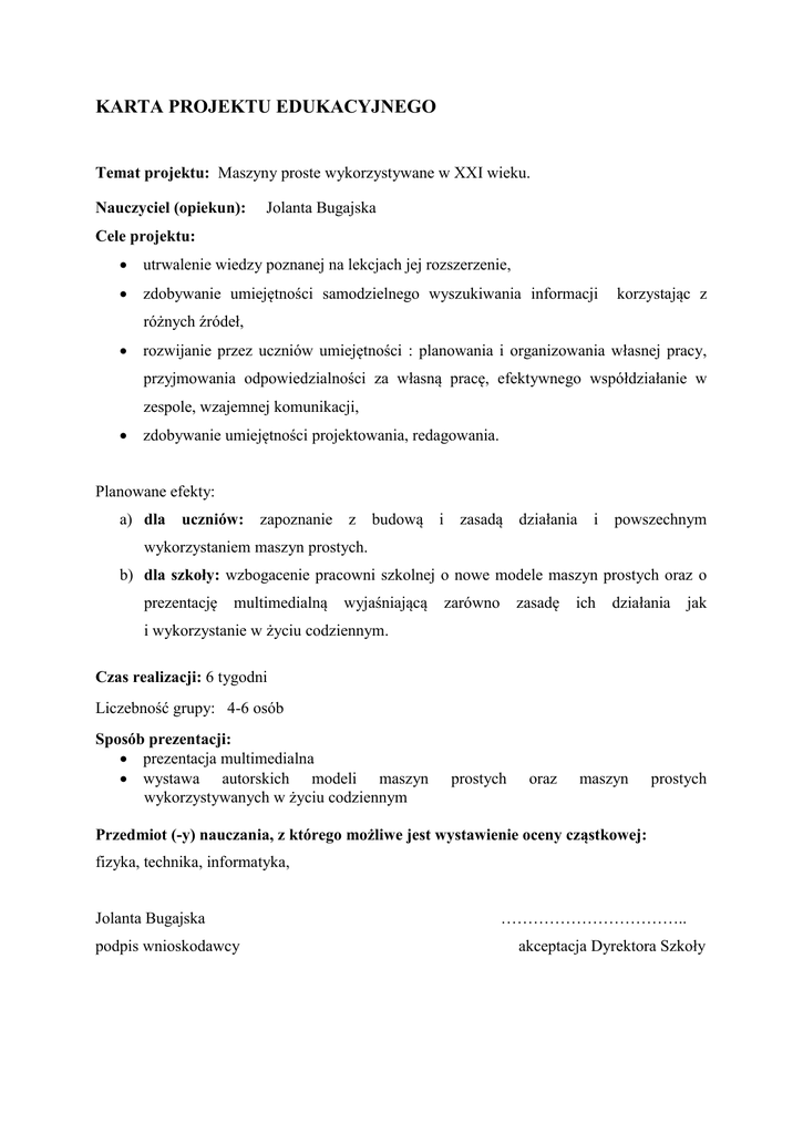 KARTA PROJEKTU EDUKACYJNEGO Temat projektu: Maszyny proste wykorzystywane w XXI wieku. Nauczyciel (opiekun): Jolanta Bugajska Cele projektu: utrwalenie wiedzy poznanej na lekcjach jej rozszerzenie, zdobywanie umiejętności samodzielnego wyszukiwania informacji korzystając z różnych źródeł, rozwijanie przez uczniów umiejętności : planowania i organizowania własnej pracy, przyjmowania odpowiedzialności za własną pracę, efektywnego współdziałanie w zespole, wzajemnej komunikacji, zdobywanie umiejętności projektowania, redagowania. Planowane efekty: a) dla uczniów: zapoznanie z budową i zasadą działania i powszechnym wykorzystaniem maszyn prostych. b) dla szkoły: wzbogacenie pracowni szkolnej o nowe modele maszyn prostych oraz o prezentację multimedialną wyjaśniającą zarówno zasadę ich działania jak i wykorzystanie w życiu codziennym. Czas realizacji: 6 tygodni Liczebność grupy: 4-6 osób Sposób prezentacji: prezentacja multimedialna wystawa autorskich modeli maszyn wykorzystywanych w życiu codziennym prostych oraz maszyn prostych Przedmiot (-y) nauczania, z którego możliwe jest wystawienie oceny cząstkowej: fizyka, technika, informatyka, Jolanta Bugajska podpis wnioskodawcy …………………………….. akceptacja Dyrektora Szkoły