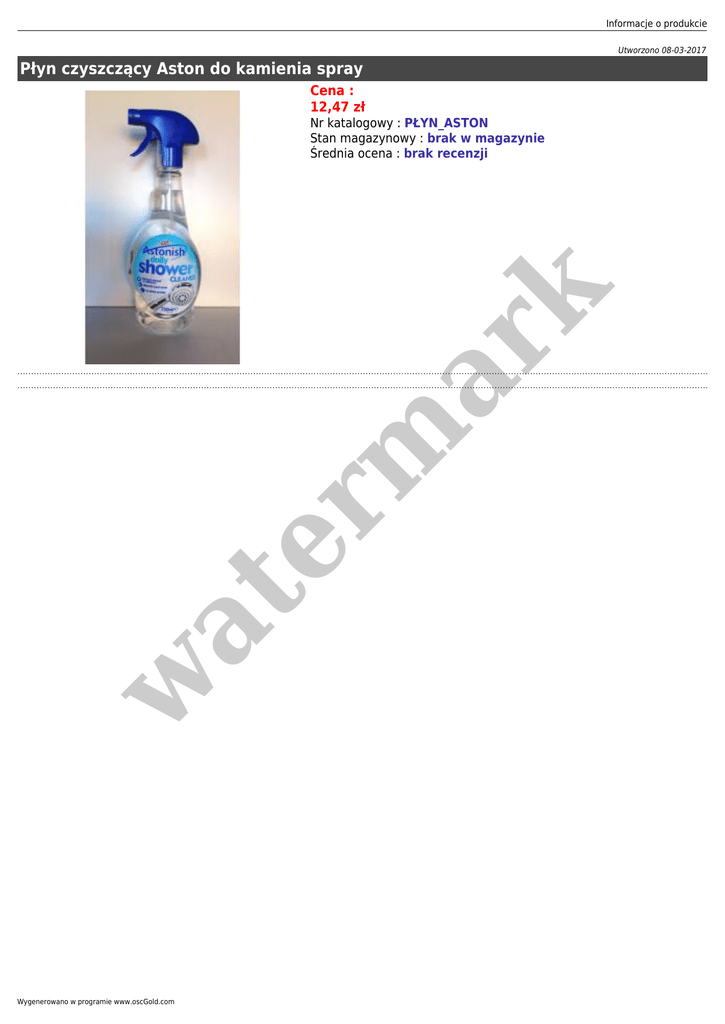 Informacje o produkcie Utworzono 08-03-2017 Płyn czyszczący Aston do kamienia spray Cena : 12,47 zł w at er m ar k Nr katalogowy : PŁYN_ASTON Stan magazynowy : brak w magazynie Średnia ocena : brak recenzji Wygenerowano w programie www.oscGold.com
