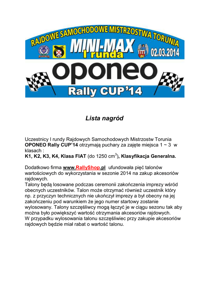 Lista nagród Uczestnicy I rundy Rajdowych Samochodowych Mistrzostw Torunia OPONEO Rally CUP’14 otrzymają puchary za zajęte miejsca 1 ~ 3 w klasach : K1, K2, K3, K4, Klasa FIAT (do 1250 cm3), Klasyfikacja Generalna. Dodatkowo firma www.RallyShop.pl ufundowała pięć talonów wartościowych do wykorzystania w sezonie 2014 na zakup akcesoriów rajdowych. Talony będą losowane podczas ceremonii zakończenia imprezy wśród obecnych uczestników. Talon może otrzymać również uczestnik który np. z przyczyn technicznych nie ukończył imprezy a był obecny na jej zakończeniu pod warunkiem że jego numer startowy zostanie wylosowany. Talony szczęśliwcy mogą łączyć je w ciągu sezonu tak aby można było powiększyć wartość otrzymania akcesoriów rajdowych. W przypadku wylosowania talonu szczęśliwiec przy zakupie akcesoriów rajdowych będzie miał rabat o wartość talonu.