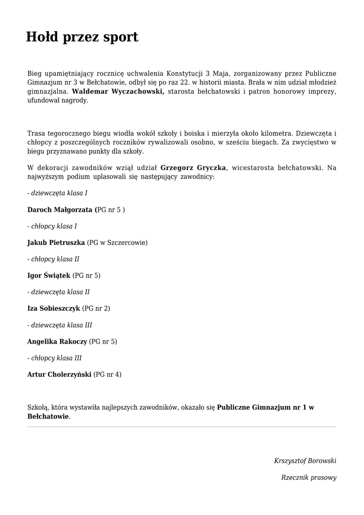 Hołd przez sport Bieg upamiętniający rocznicę uchwalenia Konstytucji 3 Maja, zorganizowany przez Publiczne Gimnazjum nr 3 w Bełchatowie, odbył się po raz 22. w historii miasta. Brała w nim udział młodzież gimnazjalna. Waldemar Wyczachowski, starosta bełchatowski i patron honorowy imprezy, ufundował nagrody. Trasa tegorocznego biegu wiodła wokół szkoły i boiska i mierzyła około kilometra. Dziewczęta i chłopcy z poszczególnych roczników rywalizowali osobno, w sześciu biegach. Za zwycięstwo w biegu przyznawano punkty dla szkoły. W dekoracji zawodników wziął udział Grzegorz Gryczka, wicestarosta bełchatowski. Na najwyższym podium uplasowali się następujący zawodnicy: - dziewczęta klasa I Daroch Małgorzata (PG nr 5 ) - chłopcy klasa I Jakub Pietruszka (PG w Szczercowie) - chłopcy klasa II Igor Świątek (PG nr 5) - dziewczęta klasa II Iza Sobieszczyk (PG nr 2) - dziewczęta klasa III Angelika Rakoczy (PG nr 5) - chłopcy klasa III Artur Cholerzyński (PG nr 4) Szkołą, która wystawiła najlepszych zawodników, okazało się Publiczne Gimnazjum nr 1 w Bełchatowie. Krszysztof Borowski Rzecznik prasowy Starostwo Powiatowe w Bełchatowie