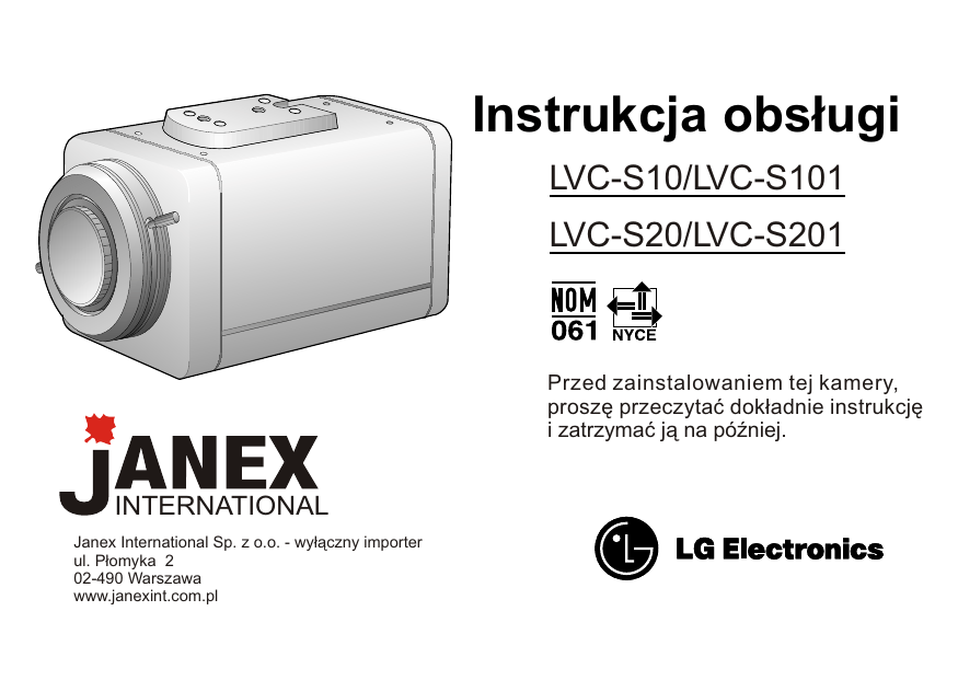 Instrukcja obsługi LVC-S10/LVC-S101 LVC-S20/LVC-S201 Przed zainstalowaniem tej kamery, proszę przeczytać dokładnie instrukcję i zatrzymać ją na później. INTERNATIONAL Janex International Sp. z o.o. - wyłączny importer ul. Płomyka 2 02-490 Warszawa www.janexint.com.pl UWAGA! RYZYKO PORAŻENIA PRĄDEM NIE OTWIERAĆ OBUDOWY NIE OTWIERAĆ OBUDOWY URZĄDZENIA, WEWNĄTRZ NIE MA ELEMENTÓW WYMAGAJĄCYCH REGULACJI PRZEZ UŻYTKOWNIKA. WSZELKIE NAPRAWY MOGĄ BYĆ DOKONYWANE TYLKO PRZEZ AUTORYZOWANY SERWIS. Ten symbol ostrzega użytkownika urządzenia, że wewnątrz obudowy występują niebezpieczne napięcia, które przy niewłaściwym użytkowaniu mogą stworzyć niebezpieczeństwo porażenia prądem elektrycznym. Ten symbol ma na celu zwrócenie uwagi użytkownika na ważne czynności związane z obsługą i konserwacją sprzętu. UWAGA: Urządzenie nie może być narażone na kontakt z wodą lub jakąkolwiek inną cieczą. 2 Spis treści Właściwości ........................................................................................................................3 Wskazówki bezpieczeństwa................................................................................................4 Sterowanie i funkcjonalność.............................................................................................5-6 Podłączenia......................................................................................................................7-8 Regulacja Back Focus.........................................................................................................9 Instalacja kamery...............................................................................................................10 Programowanie kamery.....................................................................................................11 Specyfikacja......................................................................................................................19 WŁAŚCIWOŚCI Kamery kolorowe firmy LG Electronics zaprojektowano do stosowania w profesjonalnych systemach monitorowania. Charakteryzują się one: ! Wysoką rozdzielczością oraz czułością w oparciu o przetwornik 1/3” Super HAD ! Wbudowanym cyfrowym zoomem 2x ! Wbudowaną funkcją detekcji ruchu ! Zewnętrzną synchronizacją ! Menu ekranowym ! Izolowanymi obwodami zasilania ! Możliwością montażu obiektywów typu C/CS 3 Obsługa urządzenia ! Wszelkie zanieczyszczenia obiektywu należy usunąć sprężonym powietrzem. ! Obudowę przecieraj suchą miękką szmatką. W przypadku większych zabrudzeń, użyj małej ilości neutralnego detergentu, po wyczyszczeniu wytrzyj do sucha. ! Nie używaj do czyszczenia rozpuszczalników, benzyny, alkoholu; mogą one zniszczyć obudowę. Ważne zalecenia Zasilanie S10, S20: Zasilanie prądem zmiennym 24V lub stałym 12V W przypadku synchronizacji napięciem zasilania, pamiętaj o częstotliwości: AC24V (50Hz): S10HP/S10NP/S20HP/S20NP Bezpieczeństwo Należy unikać kontaktu kamery z wodą bądź jakąkolwiek inną cieczą. Nie wolno umieszczać żadnych przewodzących materiałów ani narzędzi we wnętrzu kamery, ponieważ może to spowodować trwałe uszkodzenie kamery, jak również porażenie prądem. S101, S201: zasilanie prądem zmiennym o napięciu 230V W przypadku synchronizacji napięciem zasilania, pamiętaj o częstotliwości: 50Hz: S101HP/S101NP/S201HP/S201NP Warunki pracy i przechowywania Należy unikać instalacji kamery w miejscach, które są: Spoza zakresu temperatury od -10°C do +50°C. Rekomendowany zakres temperatur pracy: 0°C do +45°C. Wilgotne lub zakurzone. Narażone na opady deszczu. Narażone na silne wibracje. Blisko generatorów napięcia lub nadajników radiowych. Kamera nie może być skierowana na silne źródła światła. 4 ELEMENTY STERUJĄCE I ICH FUNKCJE 1 3 7 4 2 Rozmieszczenie 5 6 8 %8K/( %8K/( 6C 100-2@0VI :a:aL VCC :rL :rVideo =9: 6larm 8ut 6C 2@V +9 1 :C 12V +9 :a:aL VCC :rL :rVideo =9: 6larm 8ut 2 =/9-L8C; V+:/8 /LC :C Class 1 8nly 9 V+:/8 87 10 =/9-L8C; V+:/8 87 V+:/8 /LC :C V.%*6S/ V.%*6S/ Class 2 8nly 11 12 13 14 S101,S201’S 5 =9: S10,S20’S 1. Gniazdo uchwytu. Gniazdo można zamontować na dolnej lub górnej części obudowy. 2. Pierścień regulacji położenia przetwornika. Za jego pomocą można również regulować ostrość. Przekręć do oporu w prawo (zgodnie z ruchem wskazówek zegara) dla obiektywów C, do oporu w lewo dla obiektywów CS. 3. Osłona przycisków funkcyjnych. 4. Przyciski funkcyjne (patrz str. 13). 5. Gniazdo przyłączeniowe obiektywu z automatyczą przysłoną. 6. Zaślepka przetwornika. 7. Wskaźnik zasilania kamery. 8. Zaciski podłączeniowe. 4 zaciski do podłączenia sterowania przysłoną obiektywu. Pierwszy zacisk od prawej - wyjście alarmowe. 9. Gniazdo przewodu zasilającego. 10. Przełącznik wyboru trybu sterowania przysłoną. 11. Regulacja przesunięcia fazowego. 12. Zaciski zasilania (DC12V/AC24V). 13. Wejście sygnału synchronizacji zewnętrznej. 14.Wyjście Video. ELEMENTY STERUJĄCE I ICH FUNKCJE 1 2 Metoda regulacji poprawnej synchronizacji Jeśli wykorzystujesz funkcje przełącznik sekwencyjny z co najmniej 2 kamerami, wówczas podczas przełączania kamer możesz zauważyć niepożądane przesunięcie obrazu. W takim przypadku należy wyregulować przesunięcie fazowe. Przesunięcie fazowe może być regulowane w zakresie od -90° do +90° za pomocą potencjometru PHASE znajdującego się z boku kamery. Jeżeli np. przesunięcie obrazu występuje na monitorze przy przełączaniu z kamery 1 na kamerę 2, przesunięcie fazowe kamery 2 należy tak wyregulować potencjometrem PHASE, aby nie było przesunięcia obrazu na monitorze podczas przełączania. Jeśli podłączonych jest więcej kamer, należy powtórzyć procedurę regulacji dla każdej z nich. Uwaga! Jeżeli nie możesz wyregulować poprawnie przesunięcia fazowego kamery, zmień polaryzację jej zasilania. 3 1 Przełącznik wi