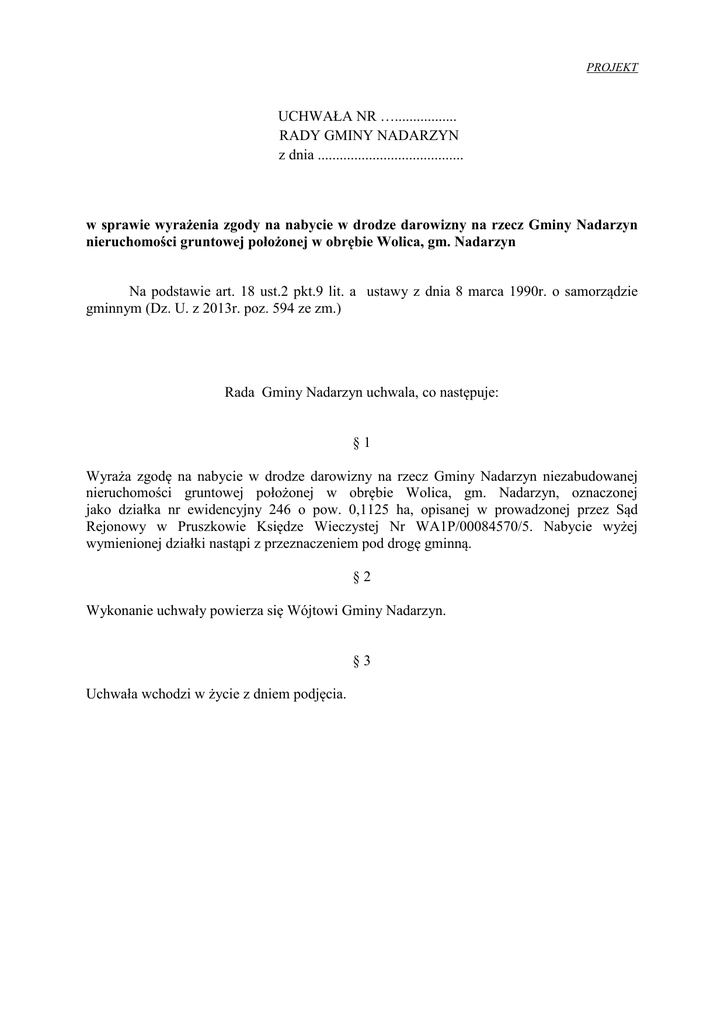 PROJEKT UCHWAŁA NR …................. RADY GMINY NADARZYN z dnia ........................................ w sprawie wyrażenia zgody na nabycie w drodze darowizny na rzecz Gminy Nadarzyn nieruchomości gruntowej położonej w obrębie Wolica, gm. Nadarzyn Na podstawie art. 18 ust.2 pkt.9 lit. a ustawy z dnia 8 marca 1990r. o samorządzie gminnym (Dz. U. z 2013r. poz. 594 ze zm.) Rada Gminy Nadarzyn uchwala, co następuje: §1 Wyraża zgodę na nabycie w drodze darowizny na rzecz Gminy Nadarzyn niezabudowanej nieruchomości gruntowej położonej w obrębie Wolica, gm. Nadarzyn, oznaczonej jako działka nr ewidencyjny 246 o pow. 0,1125 ha, opisanej w prowadzonej przez Sąd Rejonowy w Pruszkowie Księdze Wieczystej Nr WA1P/00084570/5. Nabycie wyżej wymienionej działki nastąpi z przeznaczeniem pod drogę gminną. §2 Wykonanie uchwały powierza się Wójtowi Gminy Nadarzyn. §3 Uchwała wchodzi w życie z dniem podjęcia.