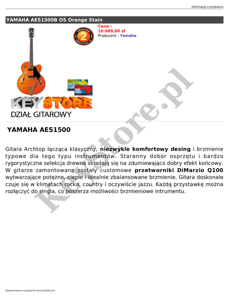 Informacje o produkcie YAMAHA AES1500B OS Orange Stain Cena : 10.089,00 zł YAMAHA AES1500 or e. pl Producent : Yamaha K ey St Gitara Archtop łącząca klasyczny, niezwykle komfortowy desing i brzmienie typowe dla tego typu instrumentów. Staranny dobór osprzętu i bardzo rygorystyczna selekcja drewna składają się na zdumiewająco dobry efekt końcowy. W gitarze zamontowane zostały customowe przetworniki DiMarzio Q100 wytwarzające potężne, ciepłe i idealnie zbalansowane brzmienie. Gitara doskonale czuje się w klimatach rocka, country i oczywiście jazzu. Każdą przystawkę można rozłączyć do singla, co poszerza możliwości brzmieniowe intrumentu. Wygenerowano w programie www.oscGold.com or e. pl St ey K Informacje o produkcie Dane techniczne: K ey St or e. pl - Wklejany gryf - Skala długości 25,5' - Klonowa szyjka z palisandrową podstrunnicą - Top z sezonowanego jaworu, boki i tył z klonu - Mostek Bigsby Vibrato Original - Trójpozycyjny przełącznik, 4 potencjometry (2x Volume, 2x Tone). - Potencjometry Tone z systemem Push-Push, który odpowiada za rozłączanie humbuckerów do singli. Wygenerowano w programie www.oscGold.com