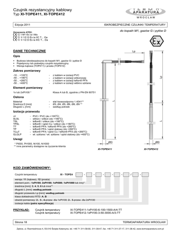 Czujnik rezystancyjny kablowy Typ XI-TOPE411, XI-TOPE412 Edycja 2011 ISKROBEZPIECZNE CZUJNIKI TEMPERATURY do kopalń M1, gazów G i pyłów D Oznaczenie ATEX: I M1 Ex ia I Ma II 1/2 G Ex ia IIC T... Ga II 1/2 D Ex ia IIIC T... Da DANE TECHNICZNE Opis Budowa iskrobezpieczna do kopalń M1, gazów G i pyłów D Pojedynczy lub podwójny czujnik rezystancyjny Wersja kątowa (TOP411) i prosta (TOP412) Zakres pomiarowy o -10 .. +105 C o -50 .. +180 C o -50 .. +260 C o -50 .. +400 C - z kablem w izolacji PVC z kablem w izolacji silikonowej z kablem w izolacji teflon® PFA z kablem w izolacji włókno szklane Element pomiarowy 1x lub 2xPt100 * Klasa A lub B, zgodnie z PN-EN 60751 Osłona Materiał Średnica D [mm] Długość L [mm] - stal kwasoodporna 1.4541** Ø3, Ø4, Ø5, Ø6, Ø8, Ø9 ** według potrzeb Izolacja przewodu JJ SLSL TSL TPSL TT TP TCuT GLGLP - o PVC / PVC (do +105 C) o silikon / silikon (do +180 C) o teflon® / silikon (do +180 C) o teflon® / oplot Cu / silikon (do +180 C) o teflon® PFA / teflon® PFA (do +260 C) o teflon® PFA / oplot stalowy (do +260 C) o teflon® PFA / oplot Cu / teflon® PFA (do +260 C) o wł. szklane / wł. szklane / oplot stalowy (do +400 C) Uwagi * Pt500, Pt1000, Ni100, Ni1000 ** inne parametry dostępne na życzenie klienta XI-TOPE411 XI-TOPE412 KOD ZAMÓWIENIOWY: Czujnik temperatury XI - TOPE4 - - - - - / - wersja: 11 (kątowa), 12 (prosta) element pom.: 1xPt100, 2xPt100, 1xPt500, 1xPt1000 lub inny* średnica [mm]: 3, 4, 5, 6 lub inna** długość L [mm]: według potrzeb długość przewodu Lp [mm]: według potrzeb klasa dokładności RTD: A, B obwód pomiarowy: 2-, 3-, 4-przew. dla 1xPt100; 2-, 3-przew. dla 2xPt100 izolacja kabla (patrz specyfikacja) PRZYKŁAD: Strona 18 Czujnik temperatury Czujnik temperatury XI-TOPE411-1xPt100-6-100-1500-A/4-TT XI-TOPE412-1xPt100-3-50-3000-A/3-TT TERMOAPARATURA WROCŁAW Zębice, ul. Rzemieślnicza 4, 55-010 Święta Katarzyna, tel. +48 71 311-58-60, 311-38-47, fax. +48 71 311-37-17, 311-38-42, www.termoaparatura.com.pl