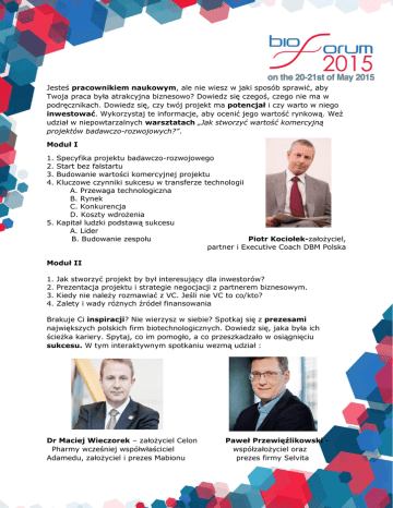 Jesteś pracownikiem naukowym, ale nie wiesz w jaki sposób sprawić, aby Twoja praca była atrakcyjna biznesowo? Dowiedz się czegoś, czego nie ma w podręcznikach. Dowiedz się, czy twój projekt ma potencjał i czy warto w niego inwestować. Wykorzystaj te informacje, aby ocenić jego wartość rynkową. Weź udział w niepowtarzalnych warsztatach „Jak stworzyć wartość komercyjną projektów badawczo-rozwojowych?”. Moduł I 1. 2. 3. 4. Specyfika projektu badawczo-rozwojowego Start bez falstartu Budowanie wartości komercyjnej projektu Kluczowe czynniki sukcesu w transferze technologii A. Przewaga technologiczna B. Rynek C. Konkurencja D. Koszty wdrożenia 5. Kapitał ludzki podstawą sukcesu A. Lider B. Budowanie zespołu Piotr Kociołek-założyciel, partner i Executive Coach DBM Polska Moduł II 1. 2. 3. 4. Jak stworzyć projekt by był interesujący dla inwestorów? Prezentacja projektu i strategie negocjacji z partnerem biznesowym. Kiedy nie należy rozmawiać z VC. Jeśli nie VC to co/kto? Zalety i wady różnych źródeł finansowania Brakuje Ci inspiracji? Nie wierzysz w siebie? Spotkaj się z prezesami największych polskich firm biotechnologicznych. Dowiedz się, jaka była ich ścieżka kariery. Spytaj, co im pomogło, a co przeszkadzało w osiągnięciu sukcesu. W tym interaktywnym spotkaniu wezmą udział : Dr Maciej Wieczorek – założyciel Celon Pharmy wcześniej współwłaściciel Adamedu, założyciel i prezes Mabionu Paweł Przewięźlikowski współzałożyciel oraz prezes firmy Selvita Dr hab. Wojciech Kamysz, prof. nadzw. założyciel i właściciel firmy Lipopharm.pl Dr Filip Jeleń – prezes firmy Pure Biologics Uczestnicy Bioforum mają także wziąć udział w wykładzie Franklina Pitchera Johnsona jr. Jest on inwestorem venture, współzałożycielem Asset Management Company Bioforum to niepowtarzalna szansa spotkania tych interesujących ludzi w jednym miejscu. Konferencja odbywa się 20-21 maja we Wrocławiu w Hotelu Haston. Koszt udziału w wyżej wymienionych warsztatach, to tylko 149 PLN + VAT. Więcej informacji pod adresem: http://cebioforum.com/we-are-pleased-to-announce/ http://cebioforum.com/students-workshop/ W razie jakichkolwiek pytań, prosimy o kontakt : [email protected]