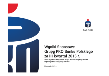 Wyniki finansowe Grupy PKO Banku Polskiego za III kwartał 2015 r. Silna dynamika wyników dzięki wzrostowi przychodów i synergiom z integracji Nordea 9 listopada 2015 r. Wybrane inicjatywy biznesowe w III kwartale 2015 r. PKO Bank Polski wybrany na kolejne cztery lata do obsługi transakcyjnej ZUS PKO Bank Polski został wybrany w przetargu na prowadzenie skonsolidowanych rachunków Funduszy oraz rachunków ZUS, a także realizację wypłat masowych. Bank będzie odpowiedzialny za prowadzenie i obsługę rachunków skonsolidowanych ZUS, Funduszu Ubezpieczeń Społecznych oraz Funduszu Emerytur Pomostowych przez kolejne cztery lata. Dzięki bogatej ofercie, nowoczesnym systemom transakcyjnym i rozliczeniowym, zindywidualizowanemu podejściu do potrzeb klientów oraz profesjonalnej obsłudze PKO Bank Polski jest wiodącym partnerem największych firm i podmiotów sektora publicznego. Kredobank pozostaje najbezpieczniejszym bankiem na Ukrainie z ROE w 2015 r. powyżej 15% Należący do Grupy Kapitałowej PKO Banku Polskiego Kredobank po raz drugi z rzędu zajął pierwsze miejsce w rankingu rentowności ukraińskich banków tworzonym przez lokalną wersję Forbesa. Celem rankingu jest wyłonienie najbezpieczniejszych instytucji na rynku mających największe szanse na przetrwanie obecnego okresu niestabilności systemu finansowego na Ukrainie. Wysoka ocena wiarygodności Kredobanku potwierdza skuteczność działań restrukturyzacyjnych prowadzonych wobec niego przez PKO Bank Polski. Bank posiada stabilne wyniki finansowe w 2015 r. (po 3Q’15 zysk netto 18,4 mln PLN i ROE 27%). Wrocławska Karta Płatnicza 10 września PKO Bank Polski we współpracy z Gminą Wrocław wprowadził do oferty Wrocławską Kartę Płatniczą – kartę do konta osobistego w PKO, na której można kodować imienne bilety okresowe komunikacji miejskiej. Nowa karta jest oferowana do wszystkich rodzajów rachunków oszczędnościowo-rozliczeniowych. Posiadanie takiej karty pozwala na pełne wykorzystywanie funkcji płatniczych, jak również dodatkowo kodowanie biletów komunikacji miejskiej we Wrocławiu oraz innych usług oferowanych w ramach URBANCARD. PKO Bank Polski beneficjentem transakcji nabycia Visa Europe przez Visa Inc. 2 listopada 2015 r. Visa Inc. zawarła umowę nabycia akcji spółki Visa Europe Ltd. Zamknięcie transakcji przewidywane jest w II kw. 2016 r. i zgodnie z treścią umowy jej wartość wynosi max. do 21,2 mld EUR. PKO Bank Polski, jako członek Visa Europe Ltd., znajduje się w gronie beneficjentów transakcji proporcjonalnie do udziału Banku w skorygowanych przychodach Visa Europe Ltd. Z uwagi na ten udział, Bank spodziewa się istotnych wpływów z tytułu zamknięcia transakcji. Pakiet Mobilny dla firm w PKO Banku Polskim PKO Bank Polski oferuje przedsiębiorcom nowy Pakiet Mobilny dla firm, który jest uzupełnieniem zróżnicowanego wachlarza pakietów biznesowych. Jest to idealne rozwiązanie dla osób fizycznych prowadzących jednoosobową działalność gospodarczą, oczekujących kompleksowego i nowoczesnego zarządzania finansami firmy za pośrednictwem aplikacji na telefon. W ramach pakietu klienci mogą liczyć na bezpłatne prowadzenie rachunku bieżącego, który w wygodny sposób można obsługiwać przez bankowość elektroniczną iPKO oraz w aplikacji mobilnej IKO. Ponadto, w ramach pakietu oferowane są bezpłatne przelewy do ZUS i Urzędu Skarbowego za pośrednictwem serwisu internetowego iPKO, przelewy na numer telefonu w kanale mobilnym IKO oraz wydanie karty debetowej. 2 Podsumowanie wyników finansowych • Skonsolidowany zysk netto uzyskany w III kwartale 2015 r. wyniósł 815 mln PLN i był o 16% wyższy niż w poprzednim kwartale, głównie dzięki zwiększeniu wyniku z tytułu odsetek oraz obniżeniu ogólnych kosztów administracyjnych, w tym dzięki realizacji synergii z integracji Nordea Wynik finansowy netto wypracowany przez Grupę PKO Banku Polskiego w okresie 3 kwartałów 2015 r. wyniósł 2.165 mln PLN i był pod presją wzrostu składek na BFG, obniżonych limitów opłat interchange oraz historycznie niskich rynkowych stóp procentowych, których negatywne efekty w znacznym stopniu wyrównało efektywne zarządzanie ryzykiem kredytowym skutkujące istotną poprawą wyniku z tytułu odpisów Skonsolidowany wynik na działalności biznesowej w III kw. 2015 r. roku na poziomie 2,7 mld PLN (+4,0% q/q) determinowany przez wzrost wyniku z odsetek (+8,0 % q/q) głównie dzięki zwiększeniu przychodów odsetkowych o 3,3% q/q i obniżeniu kosztów odsetkowych o 8,4% q/q Utrzymanie wiodącej pozycji rynkowej − wzrost aktywów do poziomu 254,9 mld PLN (+4,3% r/r) w efekcie wzrostu kredytów netto do 185,2 mld PLN (+3,8% r/r), finansowanego wzrostem depozytów klientów do 178,3 mld PLN (+4,1% r/r) − utrzymanie wysokiego udziału w rynku kredytów (17,5%) i depozytów (16,8%) oraz wzrost udziału w rynku kredytów konsumpcyjnych − wysoka nowa sprzedaż kredytów konsumpcyjnych, dla MSP i korporacyjnych Znacząca poprawa jakości portfela kredytowego − obniżenie kosztu ryzyka o 31 pb. r/r (-4 pb. q/q) do poziomu 78 pb. w ujęciu rocznym − istotny wzrost coverage ratio o 5,4 pp. r/r (+0,6 pp. q/q) do poziomu 63,5% − spadek udziału kredytów z rozpoznaną utratą wartości o 0,11 pp. r/r (+0,08 pp. q/q) do poziomu 6,94% Utrzymanie wysokiej efektywności działania − wskaźnik kosztów do dochodów (C/I) na poziomie 52,2% (49,5% w III kw. 2015) − zwrot z kapitałów (ROE) na poziomie 10,2% (11,1% w III kw. 2015) − zwrot z aktywów (ROA) na poziomie 1,1% (1,3% w III kw. 2015) − marża odsetkowa na poziomie 3,1% (3,1% w III kw. 2015) Solidna pozycja płynnościowa i wzmocnienie siły kapitałowej − wskaźnik kredytów do stabilnych źródeł finansowania na poziomie 88% − współczynnik wypłacalności na poziomie 14,5% a Core Tier 1 13,2% (dla Banku: 15,0% i Core Tier 1 13,7%) – wzrost o 0,6 pp. q/q w efekcie wdrożenia w III kw. 20