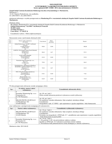 OGŁOSZENIE O WYBORZE NAJKORZYSTNIEJSZEJ OFERTY Numer ogłoszenia BZP: 212588 - 2013; data zamieszczenia: 03.06.2013 Zespół Szkół Centrum Kształcenia Rolniczego im.chor.J.Szymańskiego w Marianowie, Marianowo 7 , 18-421 Piątnica Poduchowna, woj. podlaskie, tel. ()862166611, fax ()862166611, niniejszym informuje o wyniku postępowania na Monitoring IP w warsztatach szkolnych Zespołu Szkół Centrum Kształcenia Rolniczego w Marianowie. Wybrano ofertę: dla zadania: Monitoring IP w warsztatach szkolnych Zespołu Szkół Centrum Kształcenia Rolniczego w Marianowie Zakład Elektroniczny "ELFRO" inż.Henryk Fronczek 18-400 Łomża 33 Pułku Piechoty 1 Cena oferty - 37 145.07 zł Uzasadnienie wyboru: Oferta najkorzystniejsza Streszczenie oceny i porównania złożonych ofert Nr tem atu 1 2 3 4 5 6 7 Nazwa i adres wykonawcy (Nr oferty) Zakład Elektroniczny "ELFRO" inż.Henryk Fronczek 33 Pułku Piechoty 1 18-400 Łomża (8) KARTEL TECH Import-export Paweł Zdziarski Narutowicza 2 09-200 Sierpc (4) ALAR Andrzej Rogalski Kraszewskiego 45 15-024 Białystok (7) Purzeczko-Grupa Securitas Sp. z o.o. Nowa 3A 18-400 Łomża (6) Przedsiębiorstwo Wdrożeniowo-Handlowe BRABORK-LABORATORIUM Sp. z o.o. Ratuszowa 11 03-450 Warszawa (3) PHU ETNA PLUS Edgar Wartałowicz Wyszyńskiego 16 26-015 Pierzchnica (2) MicroComp Sp. z o.o. M.C.Skłodowskiej 12 /2 26-600 Radom (1) Cena (koszt) Okres gwarancji Razem 90,00 10,00 100,00 88,64 6,67 95,31 83,58 10,00 93,58 79,96 6,67 86,63 76,56 6,67 83,23 67,01 10,00 77,01 65,49 10,00 75,49 W toku postępowania odrzucone zostały następujące oferty: Lp.: Nr oferty, nazwa i adres wykonawcy: 9 Konsalnet Monitoring Sp. z o.o. Przasnyska 6A 01-756 Warszawa 5 BRAND PIOTR CZURYŁŁO Al.Piłsudskiego 72C 10-450 Olsztyn 1 2 Uzasadnienie odrzucenia oferty: Art. 89. ust.1 pkt 5 Oferta została odrzucona ponieważ wykonawca został wykluczony Art. 89. ust.1 pkt 5 Nie spełniono warunku dokumentu: Opis urządzeń, instrukcja obsługi Uzasadnienie : Niezgodność z pkt. 8.7 SIWZ - opis rejestratora w języku angielskim - brak tłumaczenia oraz wykluczono z postępowania następujących wykonawców: Lp.: Nazwa i adres wykonawcy: 1 BRAND PIOTR CZURYŁŁO Al.Piłsudskiego 72C 10-450 Olsztyn 2 Konsalnet Monitoring Sp. z o.o. Przasnyska 6A 01-756 Warszawa Uzasadnienie wykluczenia wykonawcy: Art. 24 ust. 2 pkt 4 Nie spełniono warunku dokumentu: Opis urządzeń, instrukcja obsługi Uzasadnienie : Stwierdza się niezgodność z SIWZ pkt. 8.7 - przedłożono opis rejestratora w języku angielskim - brak tłumaczenia na język polski Art. 24 ust. 2 pkt 4 1. Do godziny 11:00 nie potwierdzono wpływu wadium. Zgodnie ze SIWZ pkt. 9.2 wykonawca powinien wnieść wadium. 2. Stwierdzono brak pełnomocnictwa osoby działającej w imieniu wykonawcy Marianowo dnia: 2013-06-03 System ProPublico © Datacomp Strona 1/1