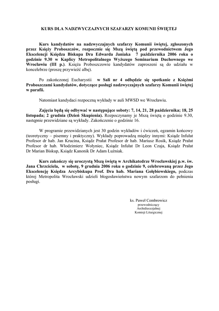 KURS DLA NADZWYCZAJNYCH SZAFARZY KOMUNII ŚWIĘTEJ Kurs kandydatów na nadzwyczajnych szafarzy Komunii świętej, zgłoszonych przez Księży Proboszczów, rozpocznie się Mszą świętą pod przewodnictwem Jego Ekscelencji Księdza Biskupa Dra Edwarda Janiaka 7 października 2006 roku o godzinie 9.30 w Kaplicy Metropolitalnego Wyższego Seminarium Duchownego we Wrocławiu (III p.). Księża Proboszczowie kandydatów zaproszeni są do udziału w koncelebrze (proszę przywieźć albę). Po zakończonej Eucharystii w Sali nr 4 odbędzie się spotkanie z Księżmi Proboszczami kandydatów, dotyczące posługi nadzwyczajnych szafarzy Komunii świętej w parafii. Natomiast kandydaci rozpoczną wykłady w auli MWSD we Wrocławiu. Zajęcia będą się odbywać w następujące soboty: 7, 14, 21, 28 października; 18, 25 listopada; 2 grudnia (Dzień Skupienia). Rozpoczynamy je Mszą świętą o godzinie 9.30, następnie przewidziane są wykłady. Zakończenie o godzinie 16. W programie przewidzianych jest 30 godzin wykładów i ćwiczeń, egzamin końcowy (teoretyczny – pisemny i praktyczny). Wykłady poprowadzą między innymi: Ksiądz Infułat Profesor dr hab. Jan Krucina, Ksiądz Prałat Profesor dr hab. Mariusz Rosik, Ksiądz Prałat Profesor dr hab. Włodzimierz Wołyniec, Ksiądz Infułat Dr Leon Czaja, Ksiądz Prałat Dr Marian Biskup, Ksiądz Kanonik Dr Adam Łuźniak. Kurs zakończy się uroczystą Mszą świętą w Archikatedrze Wrocławskiej p.w. św. Jana Chrzciciela, w sobotę, 9 grudnia 2006 roku o godzinie 9, celebrowaną przez Jego Ekscelencję Księdza Arcybiskupa Prof. Dra hab. Mariana Gołębiewskiego, podczas której Metropolita Wrocławski udzieli błogosławieństwa nowym szafarzom do pełnienia posługi. ks. Paweł Cembrowicz przewodniczący Archidiecezjalnej Komisji Liturgicznej
