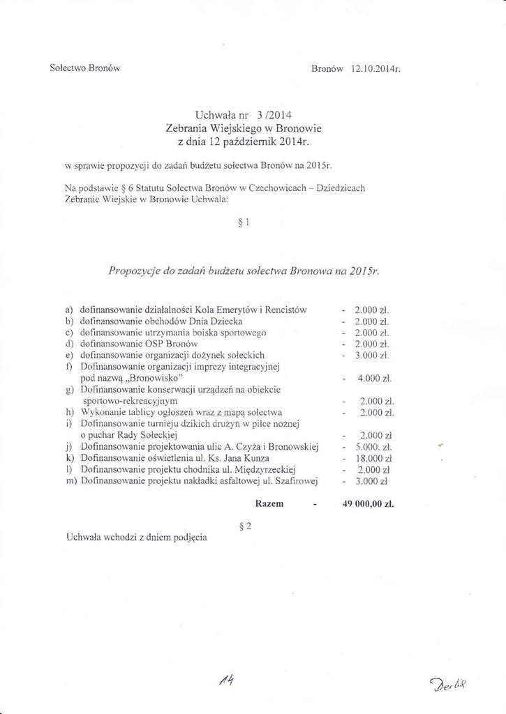 Bronów sołectwo B.onów 12'10-2014r. Uchwała ru' 3 /2014 Zebrania Wiejskiego w Bronowie z Ąrla 1Ż pużdziemtk Ż0I4t. w sprałie propozycji do zadań budżet! sołeclwa Bronów na 20l5r. Na podstawie $ 6 stafutu Sołectwa Blonó}v w Czechowicach _ Dziedzicach Zebranie Wie.jskie u, Bronowie Uchwala: $1 Propozycje do zadań budżetu sołectwa Bronowąną 20l5r. Rencistó\ł )żecka c) spodo\łego d) dofinansowanie oSP Bronórł e) dofinansowa[ie olganizacji dożynek sołeckich a) b) do1inansorłanie działalnościKola EEerytów i dot]nansowanie obchodów Dnia dofinansowanie utEymania boiska ł) Dofinansowaaie g) organiŻacji impleŻy integlacyjnej ,,Bronowisko'' spońowo'rekreacyjnym pod fiaŻwą DofilT ansowaoie konserwacj i urządzeń na obiekcie h) Ńykonanie sołectwa rablicy ogłoszeń wraz z mapa Dofinansowalie tułnieju dŻikich dfużyn w piłce nożnej o pucha_r Rady projektowalia uiic A. Czyża i Brolorłskiej Dofinałsowanie .j) k) Dofinansowat]ie oświet1enia ul. Ks. Jana 1) Dofinansowanie p.ojekfu chodnika ul' m) Dofinansowanie plojektu nakładki asfaltor'vej ul- Szafirowej i) sołecki"j 2'000 zł. - 2.a0a ń' ' 2'000 zł' - 2'000 zł. - 3'000 zł. _ 4'000 zł' _ 2'0a0 zł 2'oo0 zł. _ Kunza Międzyrzeckiej _ Razem Uch\ła'a wchodzi z dni€n _ 2.000 zł 5-000. zł' 18'000z] 2'000 z) 3'000 z1 49 000,00..1. s2 podjęcia /14 2",tł