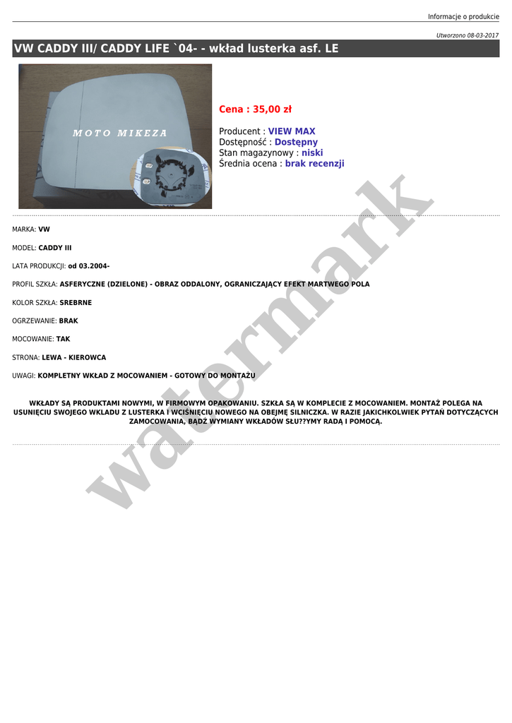 Informacje o produkcie Utworzono 08-03-2017 VW CADDY III/ CADDY LIFE `04- - wkład lusterka asf. LE Cena : 35,00 zł MARKA: VW MODEL: CADDY III LATA PRODUKCJI: od 03.2004- er m ar k Producent : VIEW MAX Dostępność : Dostępny Stan magazynowy : niski Średnia ocena : brak recenzji PROFIL SZKŁA: ASFERYCZNE (DZIELONE) - OBRAZ ODDALONY, OGRANICZAJĄCY EFEKT MARTWEGO POLA KOLOR SZKŁA: SREBRNE OGRZEWANIE: BRAK MOCOWANIE: TAK STRONA: LEWA - KIEROWCA UWAGI: KOMPLETNY WKŁAD Z MOCOWANIEM - GOTOWY DO MONTAŻU w at WKŁADY SĄ PRODUKTAMI NOWYMI, W FIRMOWYM OPAKOWANIU. SZKŁA SĄ W KOMPLECIE Z MOCOWANIEM. MONTAŻ POLEGA NA USUNIĘCIU SWOJEGO WKLADU Z LUSTERKA I WCIŚNIĘCIU NOWEGO NA OBEJMĘ SILNICZKA. W RAZIE JAKICHKOLWIEK PYTAŃ DOTYCZĄCYCH ZAMOCOWANIA, BĄDŹ WYMIANY WKŁADÓW SŁU??YMY RADĄ I POMOCĄ.