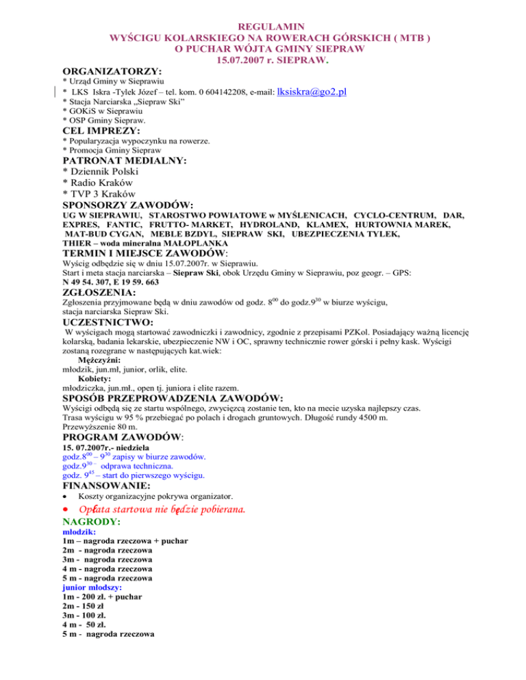 REGULAMIN WYŚCIGU KOLARSKIEGO NA ROWERACH GÓRSKICH ( MTB ) O PUCHAR WÓJTA GMINY SIEPRAW 15.07.2007 r. SIEPRAW. ORGANIZATORZY: * Urząd Gminy w Sieprawiu * LKS Iskra -Tylek Józef – tel. kom. 0 604142208, e-mail: [email protected] * Stacja Narciarska „Siepraw Ski” * GOKiS w Sieprawiu * OSP Gminy Siepraw. CEL IMPREZY: * Popularyzacja wypoczynku na rowerze. * Promocja Gminy Siepraw PATRONAT MEDIALNY: * Dziennik Polski * Radio Kraków * TVP 3 Kraków SPONSORZY ZAWODÓW: UG W SIEPRAWIU, STAROSTWO POWIATOWE w MYŚLENICACH, CYCLO-CENTRUM, DAR, EXPRES, FANTIC, FRUTTO- MARKET, HYDROLAND, KLAMEX, HURTOWNIA MAREK, MAT-BUD CYGAN, MEBLE BZDYL, SIEPRAW SKI, UBEZPIECZENIA TYLEK, THIER – woda mineralna MAŁOPLANKA TERMIN I MIEJSCE ZAWODÓW: Wyścig odbędzie się w dniu 15.07.2007r. w Sieprawiu. Start i meta stacja narciarska – Siepraw Ski, obok Urzędu Gminy w Sieprawiu, poz geogr. – GPS: N 49 54. 307, E 19 59. 663 ZGŁOSZENIA: Zgłoszenia przyjmowane będą w dniu zawodów od godz. 800 do godz.930 w biurze wyścigu, stacja narciarska Siepraw Ski. UCZESTNICTWO: W wyścigach mogą startować zawodniczki i zawodnicy, zgodnie z przepisami PZKol. Posiadający ważną licencję kolarską, badania lekarskie, ubezpieczenie NW i OC, sprawny technicznie rower górski i pełny kask. Wyścigi zostaną rozegrane w następujących kat.wiek: Mężczyźni: młodzik, jun.mł, junior, orlik, elite. Kobiety: młodziczka, jun.mł., open tj. juniora i elite razem. SPOSÓB PRZEPROWADZENIA ZAWODÓW: Wyścigi odbędą się ze startu wspólnego, zwycięzcą zostanie ten, kto na mecie uzyska najlepszy czas. Trasa wyścigu w 95 % przebiegać po polach i drogach gruntowych. Długość rundy 4500 m. Przewyższenie 80 m. PROGRAM ZAWODÓW: 15. 07.2007r.- niedziela godz.800 – 930 zapisy w biurze zawodów. godz.930 – odprawa techniczna. godz. 945 – start do pierwszego wyścigu. FINANSOWANIE: • Koszty organizacyjne pokrywa organizator. • Opłata startowa nie będzie pobierana. NAGRODY: młodzik: 1m – nagroda rzeczowa + puchar 2m - nagroda rzeczowa 3m - nagroda rzeczowa 4 m - nagroda rzeczowa 5 m - nagroda rzeczowa junior młodszy: 1m - 200 zł. + puchar 2m - 150 zł 3m - 100 zł. 4 m - 50 zł. 5 m - nagroda rzeczowa junior : 1 m - 250 zł. + puchar 2 m – 200 zł. 3 m – 150 zł. 4 m – 100 zł. 5 m - nagroda rzeczowa orlik: 1 m – 250 zł. + puchar 2 m – 200 zł. 3 m – 150 zł. 4 m – 100 zł. 5 m - nagroda rzeczowa elite: 1 m – 500 zł + puchar 2 m – 400 zł. 3 m – 300 zł 4 m – 150 zł. 5 m - nagroda rzeczowa młodziczka: 1m – nagroda rzeczowa+ puchar 2m - nagroda rzeczowa 3m - nagroda rzeczowa 4 m - nagroda rzeczowa 5 m - nagroda rzeczowa juniorka młodsza: 1m – 150 zł+ puchar 2m – 100 zł 3m - 50 zł 4 m - nagroda rzeczowa 5 m - nagroda rzeczowa kobiety open ( jun. + elite): 1m – 300 zł. + puchar 2 m – 200 zł. 3 m – 100 zł. 4 m- 50 zł. 5 m- nagroda rzeczowa Każdy uczestnik po oddaniu numeru startowego otrzyma upominek. POSTANOWIENIA KOŃCOWE: Wyścig zostanie rozegrany zgodnie z przepisami kolarstwa górskiego (MTB) PZKol, oraz niniejszego reg. We wszystkich sprawach nie objętych tymi przepisami będzie decydowała Komisja Sędziowska w porozumieniu z organizatorem. Organizatorzy nie ponoszą odpowiedzialności za zaistniałe wypadki na trasie oraz rzeczy zaginione. Około godz. 15.00 odbędą się „Rekreacyjne Zawody Rowerowe Dla Dzieci” od 5 do 12 lat. oraz „ Rowerowa Sztafeta Rodzinna wg oddzielnego regulaminu. Regulaminy, mapka, profil trasy, dostępne także w internecie na str. http://www.lksiskraglogoczow.lap.pl, http://www.zawody.info http://www.siepraw.pl Zapraszamy do wzięcia udziału w imprezie. Regulamin zatwierdzono w MZKol. w Krakowie.
