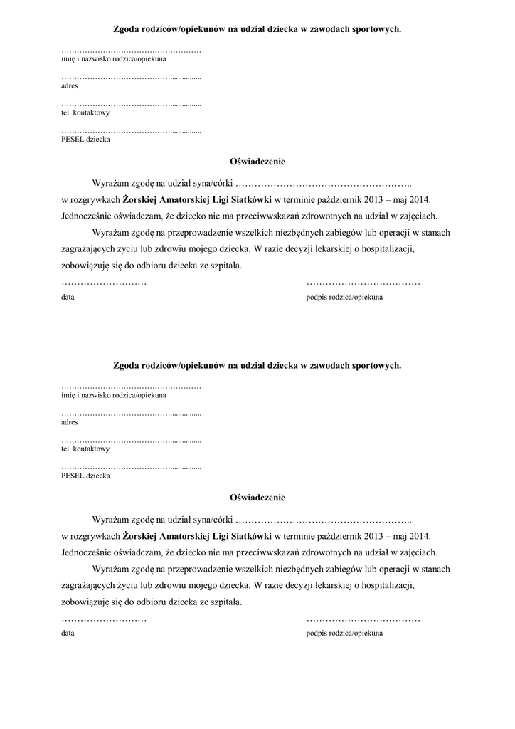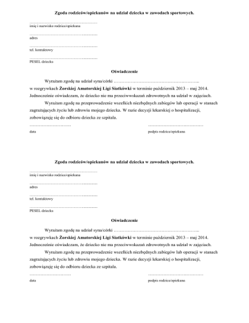 Zgoda rodziców/opiekunów na udział dziecka w zawodach sportowych. ……………………………………………… imię i nazwisko rodzica/opiekuna ……………………………………................ adres ……………………………………................ tel. kontaktowy ……………………………………................ PESEL dziecka Oświadczenie Wyrażam zgodę na udział syna/córki ……………………………………………….. w rozgrywkach Żorskiej Amatorskiej Ligi Siatkówki w terminie październik 2013 – maj 2014. Jednocześnie oświadczam, że dziecko nie ma przeciwwskazań zdrowotnych na udział w zajęciach. Wyrażam zgodę na przeprowadzenie wszelkich niezbędnych zabiegów lub operacji w stanach zagrażających życiu lub zdrowiu mojego dziecka. W razie decyzji lekarskiej o hospitalizacji, zobowiązuję się do odbioru dziecka ze szpitala. ……………………… ……………………………… data podpis rodzica/opiekuna Zgoda rodziców/opiekunów na udział dziecka w zawodach sportowych. ……………………………………………… imię i nazwisko rodzica/opiekuna ……………………………………................ adres ……………………………………................ tel. kontaktowy ……………………………………................ PESEL dziecka Oświadczenie Wyrażam zgodę na udział syna/córki ……………………………………………….. w rozgrywkach Żorskiej Amatorskiej Ligi Siatkówki w terminie październik 2013 – maj 2014. Jednocześnie oświadczam, że dziecko nie ma przeciwwskazań zdrowotnych na udział w zajęciach. Wyrażam zgodę na przeprowadzenie wszelkich niezbędnych zabiegów lub operacji w stanach zagrażających życiu lub zdrowiu mojego dziecka. W razie decyzji lekarskiej o hospitalizacji, zobowiązuję się do odbioru dziecka ze szpitala. ……………………… ……………………………… data podpis rodzica/opiekuna