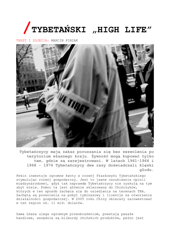 /TYBETAŃSKI „HIGH LIFE” TEKST I ZDJĘCIA: MARCIN PINIAK Tybetańczycy mają zakaz poruszania się bez zezwolenia po terytorium własnego kraju. Żywność mogą kupować tylko tam, gdzie są zarejestrowani. W latach 1961-1964 i 1968 - 1974 Tybetańczycy dwa razy doświadczali klęski głodu. Pekin inwestuje ogromne kwoty w rozwój Płaskowyżu Tybetańskiego stymulując rozwój gospodarczy. Jest to jawne oszukiwanie opinii międzynarodowej, gdyż tak naprawdę Tybetańczycy nie zyskują na tym zbyt wiele. Pomoc ta jest głównie skierowana do Chińczyków, których w ten sposób zachęca się do osiedlenia na terenach TRA. Zachętą są pozwolenia na pobyt tymczasowy i licencje na otworzenie działalności gospodarczej. W 2005 roku Chiny obiecały zainwestować w ten region ok. 11 mld. dolarów. Sama Lhasa ulega ogromnym przeobrażeniom, powstają pasaże handlowe, wszędzie są bilbordy chińskich produktów, pełno jest sklepów i restauracji (najczęściej prowadzą je Chińczycy), kin i kawiarni internetowych. Handel i przemysł zdominowany jest przez Chińczyków, Tybetańczycy głównie utrzymują się z pracy w rolnictwie i z pracy dla Chińczyków. Młodzi Tybetańczycy próbują się dostosować, wpasować w chińskie warunki życia w Tybecie. Tybetańczycy mają zakaz poruszania się bez zezwolenia po terytorium własnego kraju. Żywność mogą kupować tylko tam, gdzie są zarejestrowani. W latach 1961-1964 i 1968 - 1974 Tybetańczycy dwa razy doświadczali klęski głodu. Był to rezultat idiotycznej polityki kolektywizacji. Skonfiskowano bydło a rolników podzielono na brygady i komuny. Warto wspomnieć, że coś takiego miało pierwszy raz miejsce w całej historii Tybetu. Chińczycy raz tylko przyznali się do błędów swej polityki w Tybecie ustami Hu Yaobanga (byłego sekretarza komunistycznej partii). W oficjalnych statystykach i badaniach rządu Chin Tybet przoduje pod względem rozwoju gospodarczego i ekonomicznego jednak warto pamiętać, że wszelkiego typu takie dokumenty w Chinach najczęściej służą celom politycznym i propagandzie międzynarodowej. Już w tej chwili Tybetańczycy są mniejszością narodową w własnym kraju ich warunki życiowe różnią się znacznie od poziomu życia Chińczyków. W 1990 roku TRA osiągnął roczny dochód na głowę mieszkańca w wysokości 80 dol, średnia długość życia wynosiła 40 lat, a analfabetyzm wśród dorosłych sięgał 80 %. Sklasyfikowało to TRA na 153 pozycji (na 160 możliwych) w Indeksie rozwoju ludzkości ONZ. Chińczycy wciąż zapewniają o wysokich kosztach jakie ponoszą w związku z rozwojem Tybetu, jednak milczą jeżeli chodzi o bogacenie się kosztem Tybetu. Powszechnie wiadomo ile zostało zrabowanych dzieł sztuki, relikwii, których wartość jest przecież trudna do oszacowania. Eksploatacja bogactw naturalnych takich jak uran, złoto srebro czy wywożenie drewna w dużym stopniu „równoważą” chińskie wydatki. Podobna sytuacja miała miejsce w infrastrukturze, która powstała w latach pięćdziesiątych, ale tylko po to, aby ułatwić zadanie AL-W, a w tej chwili służy głównie Chińczykom, którzy najczęściej zamieszkują w miastach a dróg łączących prowincję czy wsie nie ma. Podobnie się ma z transportem, Tybetańczycy nie jeżdżą autobusami, ich środki transportu to bydło, konie czy ciężarówki z towarami dla Chińczyków. W sferze opieki zdrowotnej, jak to wszędzie - raczej służy ona bogatszym, a wiadomo, że Tybetańczycy do bogatych nie należą. 90 % pieniędzy przeznaczonych na opiekę medyczną czy szpitalną wędruje do miast. Na wsiach praktycznie nie istnieje, a druga rzecz, że nawet, jeśli opieka medyczna jest dostępna jest ona dla Tybetańczyków za droga. Jeżeli chodzi o personel medyczny, jest on niewystarczający a ponad to lekarze są często niewykwalifikowani. Często lekarzami zostają Chińczycy, którzy mają konotacje w administracji, co w rezultacie obniża znacznie poziom ich wiedzy czy umiejętności. Często leczą po odbyciu zaledwie półtora rocznych kursów przygotowawczych. Często chińscy lekarze celowo przeprowadzają źle operacje na tybetańskich pacjentach, wiele osób zmarło w taki sposób. Edukacja w Tybecie, także pozostawia wiele do życzenia. Kiedyś tradycyjnie edukacyjną rolę pełniły klasztory i uniwersytety przyklasztorne. Jednak z powodu zabójczej w skutki polityki chińskich władz, klasztory nie mogą już zapewnić edukacji młodym Tybetańczykom. Na początku Chińczycy zmuszali chłopów i koczowników do zakładania „szkół ludowych” nie przeznaczając na ten cel żadnych pieniędzy. W artykule opublikowanym w chińskim periodyku Tibet Review, trzech chińskich socjologów stwierdza: Zaledwie 45 proc. dzieci w wieku szkolnym uczęszcza do szkół podstawowych. Tylko 10,6 proc. spośród nich udaje się przejść do niższej szkoły średniej. Innymi słowy, 55 proc. dzieci nie uzyskuje nawet wykształcenia podstawowego. W całym TRA jest ponad 9.000 nauczycieli szkół wszystkich stopni - potrzeba ich znacznie więcej. Połowie z nich brak odpowiednich kwalifikacji. Narodowości staną się naprawdę równe dopiero wówczas, gdy zreformuje się i polepszy system edukacji”. Szkoły ludowe poniosły fiasko. Obecnie w szkołach brakuje podstawowego wyposażenia, poziom nauczania jest fatalny a baza edukacyjna praktycznie nie istnieje. Brak jest nauczycieli i podręczników (które notabene drukują Chińczycy ze swoją wersją historii itd.) zatem w takim wypadku mówienie o edukacji sprowadza się do wyrażania pobożnych życzeń. Szkolnictwo wyższe w większym stopniu koncentruje się na studentach pochodzenia chińskiego. Tybetańczycy, aby studiować muszą skończyć wyższą szkołę średnia i zdać egzaminy w języku chińskim, co oczywiście automatycznie stawia ich na gorszej pozycji. W petycji, przedłożonej władzom chińskim 20 lutego 1986 roku, Taszi Cering, nauczyciel