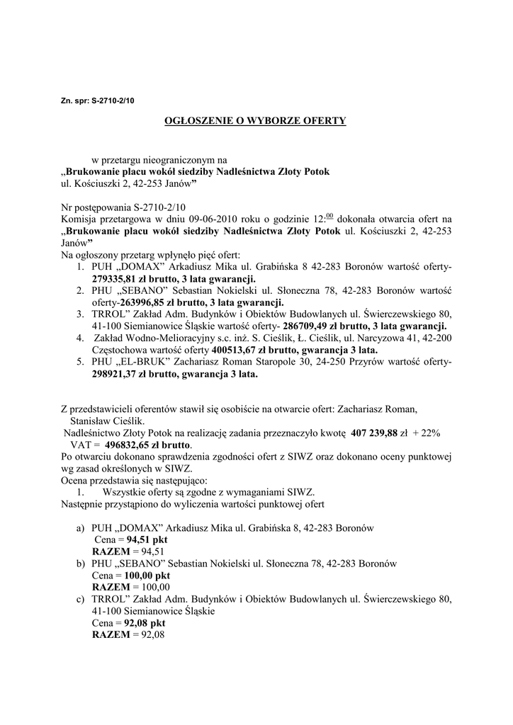 Zn. spr: S-2710-2/10 OGŁOSZENIE O WYBORZE OFERTY w przetargu nieograniczonym na „Brukowanie placu wokół siedziby Nadleśnictwa Złoty Potok ul. Kościuszki 2, 42-253 Janów” Nr postępowania S-2710-2/10 Komisja przetargowa w dniu 09-06-2010 roku o godzinie 12:00 dokonała otwarcia ofert na „Brukowanie placu wokół siedziby Nadleśnictwa Złoty Potok ul. Kościuszki 2, 42-253 Janów” Na ogłoszony przetarg wpłynęło pięć ofert: 1. PUH „DOMAX” Arkadiusz Mika ul. Grabińska 8 42-283 Boronów wartość oferty279335,81 zł brutto, 3 lata gwarancji. 2. PHU „SEBANO” Sebastian Nokielski ul. Słoneczna 78, 42-283 Boronów wartość oferty-263996,85 zł brutto, 3 lata gwarancji. 3. TRROL” Zakład Adm. Budynków i Obiektów Budowlanych ul. Świerczewskiego 80, 41-100 Siemianowice Śląskie wartość oferty- 286709,49 zł brutto, 3 lata gwarancji. 4. Zakład Wodno-Melioracyjny s.c. inŜ. S. Cieślik, Ł. Cieślik, ul. Narcyzowa 41, 42-200 Częstochowa wartość oferty 400513,67 zł brutto, gwarancja 3 lata. 5. PHU „EL-BRUK” Zachariasz Roman Staropole 30, 24-250 Przyrów wartość oferty298921,37 zł brutto, gwarancja 3 lata. Z przedstawicieli oferentów stawił się osobiście na otwarcie ofert: Zachariasz Roman, Stanisław Cieślik. Nadleśnictwo Złoty Potok na realizację zadania przeznaczyło kwotę 407 239,88 zł + 22% VAT = 496832,65 zł brutto. Po otwarciu dokonano sprawdzenia zgodności ofert z SIWZ oraz dokonano oceny punktowej wg zasad określonych w SIWZ. Ocena przedstawia się następująco: 1. Wszystkie oferty są zgodne z wymaganiami SIWZ. Następnie przystąpiono do wyliczenia wartości punktowej ofert a) PUH „DOMAX” Arkadiusz Mika ul. Grabińska 8, 42-283 Boronów Cena = 94,51 pkt RAZEM = 94,51 b) PHU „SEBANO” Sebastian Nokielski ul. Słoneczna 78, 42-283 Boronów Cena = 100,00 pkt RAZEM = 100,00 c) TRROL” Zakład Adm. Budynków i Obiektów Budowlanych ul. Świerczewskiego 80, 41-100 Siemianowice Śląskie Cena = 92,08 pkt RAZEM = 92,08 d) Zakład Wodno-Melioracyjny s.c. inŜ. S. Cieślik, Ł. Cieślik, ul. Narcyzowa 41, 42-200 Częstochowa Cena = 65,91pkt RAZEM = 65,91 e) PHU „EL-BRUK” Zachariasz Roman Staropole 30, 24-250 Przyrów Cena = 88,32 pkt RAZEM = 88,32 W wyniku oceny ofert komisja stwierdza, Ŝe najwięcej punktów uzyskała oferta firmy PHU „SEBANO” Sebastian Nokielski ul. Słoneczna 78, 42-283 Boronów. a co za tym idzie komisja wnioskuje o przyjęcie oferty w/w firmy i podpisanie umowy na realizację zadania nr S -2710-2/10 „Brukowanie placu wokół siedziby Nadleśnictwa Złoty Potok ul. Kościuszki 2, 42-253 Janów” za kwotę brutto 263996,85 zł, termin realizacji do dnia 30.09.2010r gwarancją na okres 36 miesięcy, która spełnia wszystkie wymagania określone w specyfikacji istotnych warunków zamówienia i ustawy Prawo zamówień publicznych, a zaproponowana cena nie przekracza środków finansowych, które Zamawiający przeznaczył na realizację przedmiotowego zadania. Złoty Potok dnia 16.06.2010 Otrzymują: 1. PUH „DOMAX” Arkadiusz Mika ul. Grabińska 8, 42-283 Boronów 2. PHU „SEBANO” Sebastian Nokielski ul. Słoneczna 78, 42-283 Boronów 3. TRROL” Zakład Adm. Budynków i Obiektów Budowlanych ul. Świerczewskiego 80, 41-100 Siemianowice Śląskie 4. Zakład Wodno-Melioracyjny s.c. inŜ. S. Cieślik, Ł. Cieślik, ul. Narcyzowa 41, 42-200 Częstochowa 5. PHU „EL-BRUK” Zachariasz Roman Staropole 30, 24-250 Przyrów
