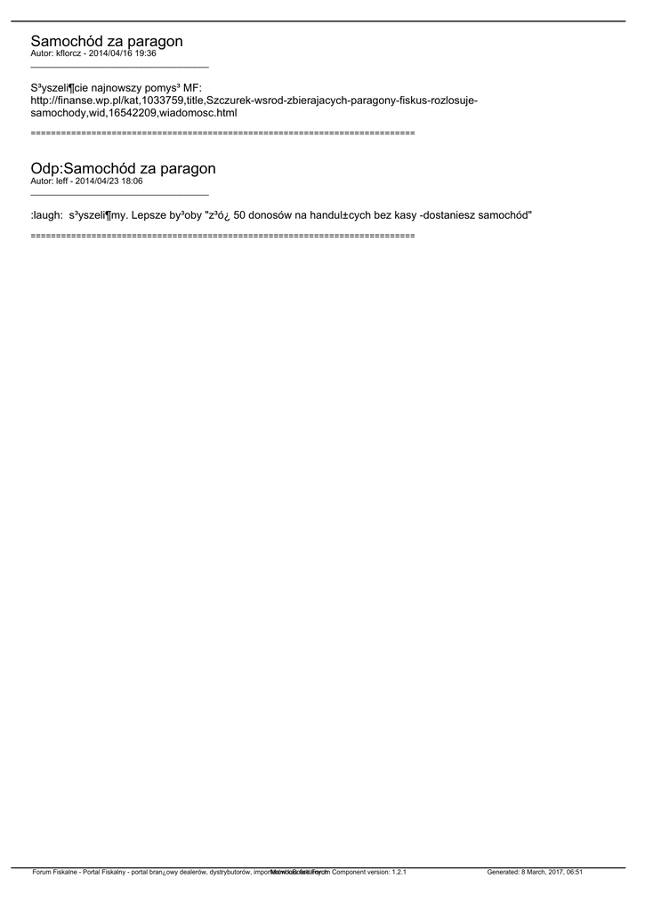 Samochód za paragon Autor: kflorcz - 2014/04/16 19:36 _____________________________________ S³yszeli¶cie najnowszy pomys³ MF: http://finanse.wp.pl/kat,1033759,title,Szczurek-wsrod-zbierajacych-paragony-fiskus-rozlosujesamochody,wid,16542209,wiadomosc.html ============================================================================ Odp:Samochód za paragon Autor: leff - 2014/04/23 18:06 _____________________________________ :laugh: s³yszeli¶my. Lepsze by³oby "z³ó¿ 50 donosów na handul±cych bez kasy -dostaniesz samochód" ============================================================================ Forum Fiskalne - Portal Fiskalny - portal bran¿owy dealerów, dystrybutorów, importerów MamboBoard kas fiskalnych Forum Component version: 1.2.1 Generated: 8 March, 2017, 06:51