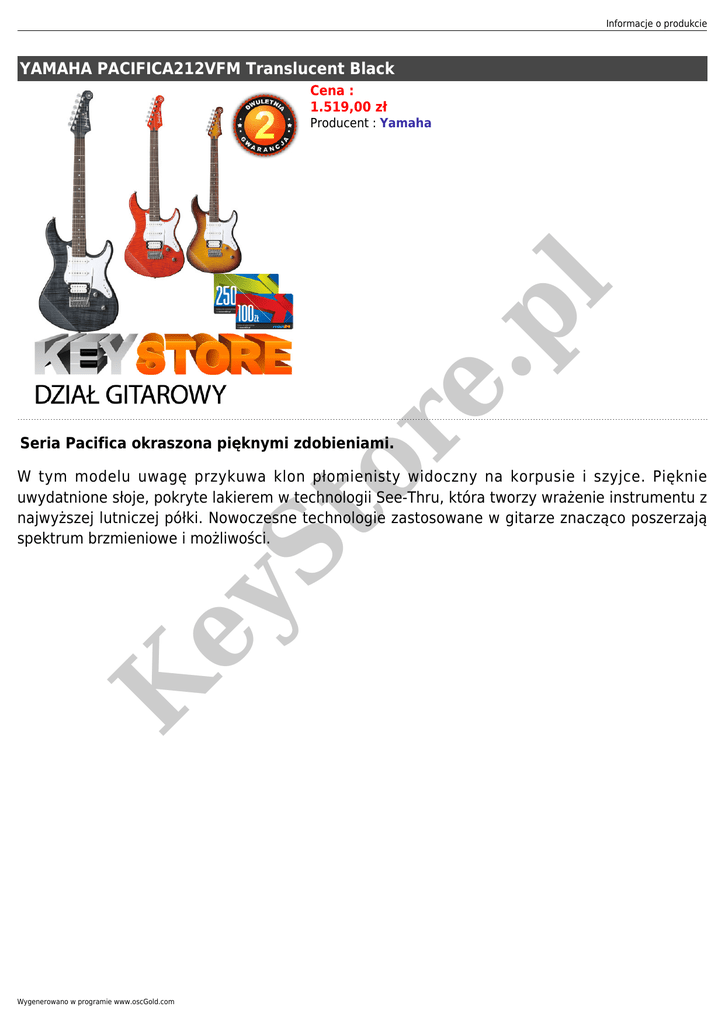 Informacje o produkcie YAMAHA PACIFICA212VFM Translucent Black Cena : 1.519,00 zł or e. pl Producent : Yamaha Seria Pacifica okraszona pięknymi zdobieniami. K ey St W tym modelu uwagę przykuwa klon płomienisty widoczny na korpusie i szyjce. Pięknie uwydatnione słoje, pokryte lakierem w technologii See-Thru, która tworzy wrażenie instrumentu z najwyższej lutniczej półki. Nowoczesne technologie zastosowane w gitarze znacząco poszerzają spektrum brzmieniowe i możliwości. Wygenerowano w programie www.oscGold.com or e. pl St ey K Informacje o produkcie Funkcja Coil-Tap, która pozwala nam rozłączyć dwucewkowy przetwornik do singla, umożliwia osiągnięcie jeszcze piękniejszych barw czystych i lekko przesterowanych, oraz znaną na całym świecie "szklankę". Powrót do humbuckera wyciąga spore ilości harmonicznych z naszych wzmacniaczy i przesterów w kostkach. Seria Pacifica to doskonały wybór dla kogoś, kto ceni sobie wszechstronność, wysoką jakość brzmienia i wykonania, oraz piękną zewnętrzną prezencję. Dane techniczne: ● ● ● K ey St ● Korpus: Olcha + top z klonu wzorzystego (płomienisty) Gryf: Klon wzorzysty i podstrunnica z palisandru Menzura: 25,5" Przetworniki: 2x Single Coil, 1x Humbucker, na magnesach AlNiCo5 5-pozycyjny przełącznik przetworników or e. pl ● Wygenerowano w programie www.oscGold.com