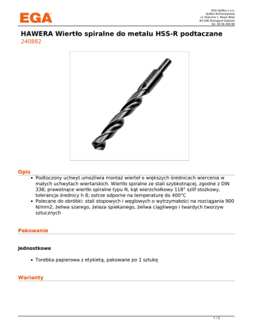 EGA Spółka z o.o. Spółka Komandytowa ul. Rzeczna 1, Nowa Wieś 83-200 Starogard Gdański tel. 58 56 300 80 HAWERA Wiertło spiralne do metalu HSS-R podtaczane 240882 Opis Podtoczony uchwyt umożliwia montaż wierteł o większych średnicach wiercenia w małych uchwytach wiertarskich. Wiertło spiralne ze stali szybkotnącej, zgodne z DIN 338; prawotnące wiertło spiralne typu N, kąt wierzchołkowy 118° szlif stożkowy, tolerancja średnicy h 8; ostrze odporne na temperaturę do 400°C Polecane do obróbki: stali stopowych i węglowych o wytrzymałości na rozciągania 900 N/mm2, żeliwa szarego, żelaza spiekanego, żeliwa ciągliwego i twardych tworzyw sztucznych Pakowanie Jednostkowe Torebka papierowa z etykietą, pakowane po 1 sztukę Warianty 1/2 EGA Spółka z o.o. Spółka Komandytowa ul. Rzeczna 1, Nowa Wieś 83-200 Starogard Gdański tel. 58 56 300 80 Lp. Nr katalogowy EAN Rozmiar (mm) Długość robocza (mm) 1 240882 4014468015861 12,0 x 151 101 2 240884 4014468015885 13,0 x 151 101 3 240886 4014468015908 14,0 x 160 108 4 240888 4014468015922 15,0 x 169 114 5 240890 4014468015946 16,0 x 178 120 6 240892 4014468015960 17,0 x 184 125 7 240894 4014468015977 18,0 x 191 130 8 240896 4014468015984 19,0 x 198 135 9 240898 4014468015991 20,0 x 205 140 10 240883 12,5 x 151 101 11 240885 13,5 x 160 108 12 240887 14,5 x 169 114 13 240889 15,5 x 178 120 14 240891 16,5 x 184 125 2/2 Powered by TCPDF (www.tcpdf.org)